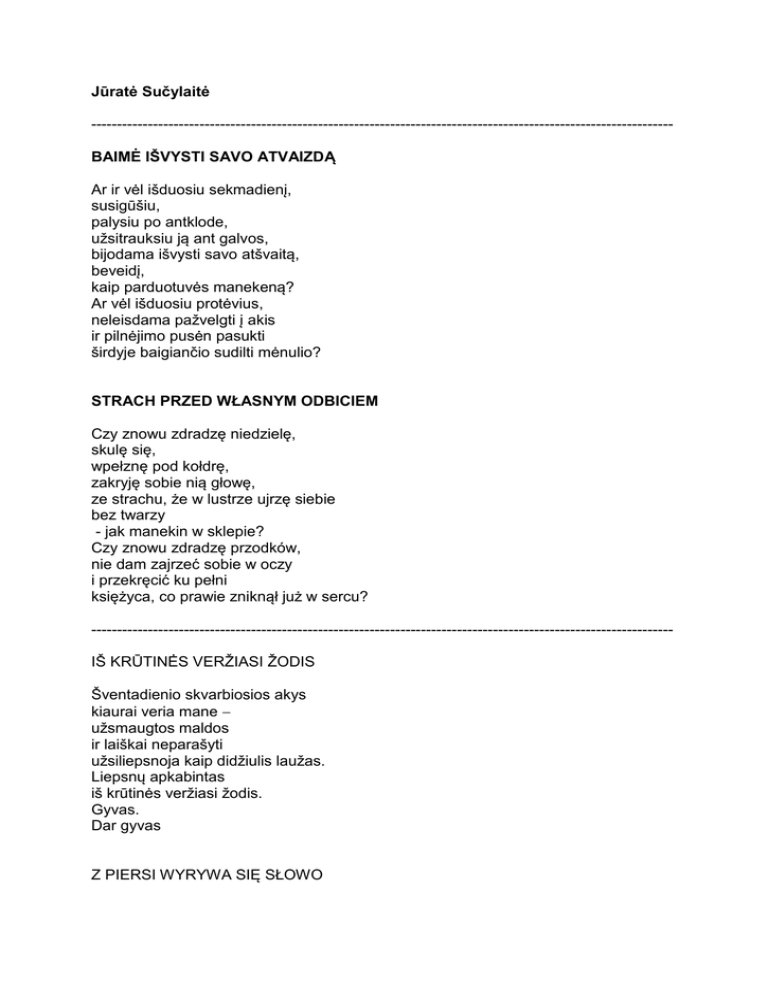 Jūratė Sučylaitė ----------------------------------------------------------------------------------------------------------------BAIMĖ IŠVYSTI SAVO ATVAIZDĄ Ar ir vėl išduosiu sekmadienį, susigūšiu, palysiu po antklode, užsitrauksiu ją ant galvos, bijodama išvysti savo atšvaitą, beveidį, kaip parduotuvės manekeną? Ar vėl išduosiu protėvius, neleisdama pažvelgti į akis ir pilnėjimo pusėn pasukti širdyje baigiančio sudilti mėnulio? STRACH PRZED WŁASNYM ODBICIEM Czy znowu zdradzę niedzielę, skulę się, wpełznę pod kołdrę, zakryję sobie nią głowę, ze strachu, że w lustrze ujrzę siebie bez twarzy - jak manekin w sklepie? Czy znowu zdradzę przodków, nie dam zajrzeć sobie w oczy i przekręcić ku pełni księżyca, co prawie zniknął już w sercu? ----------------------------------------------------------------------------------------------------------------IŠ KRŪTINĖS VERŽIASI ŽODIS Šventadienio skvarbiosios akys kiaurai veria mane − užsmaugtos maldos ir laiškai neparašyti užsiliepsnoja kaip didžiulis laužas. Liepsnų apkabintas iš krūtinės veržiasi žodis. Gyvas. Dar gyvas Z PIERSI WYRYWA SIĘ SŁOWO Bystre oczy świątecznego dnia przeszywają mnie na wskroś zdławione modlitwy nienapisane listy rozpalają się jak wielkie ognisko. W objęciach płomieni z piersi wyrywa się słowo. Żywe. Jeszcze żywe. ----------------------------------------------------------------------------------------------------------------∗∗∗ Guluosi į kietą akmeninį gultą, guluosi ant žodžio NEPYKTI, akmeninę pagalvę deduos po galva NEPRAVIRKTI, užsikloju žodžiu ATLEISTI. Sunki ir slegianti antklodė sušildo akmens kantrumu. *** Kładę się na twardym kamiennym posłaniu, kładę się na słowie NIE ZŁOŚCIĆ SIĘ, pod głowę wsuwam kamienną poduszkę NIE ZAPŁAKAĆ, nakrywam się słowem WYBACZYĆ. Ciężka, przytłaczająca kołdra rozgrzewa cierpliwością kamienia. ----------------------------------------------------------------------------------------------------------------NUORŪKA SMĖLYJE Išskalautose smėlio garbanose −nuorūka. Peršti nudegintos akys. Veido skaudulį purslais vėsina bangų baltosios plaštakos. Ar dar laimina vanduo? Ar jo rankos tebėra tokios švarios ir švelnios, ar įstengs užgydyti akių žaizdas? Drumsčiasi jūros puta. Jai atsitraukiant, smėlyje sublykčioja langai − nė vieno atdaro, nė vieno numazgoto. Vėl baimė pažvelgti į savo kelią: pusė tiesos, pusė laisvės, gyvybingumo trupiniai. Dūžta devintoji banga atvėsina karštą kaktą. Delnais braukiu per veidą, pirštų galiukais čiuopdama visa, kas sužeista ir kas dar gyva praeityje ir sapnuose. Atsidaro langinės, prasiskiria užuolaidos, Vanduo mazgoja sielos langus. Už skaidraus nuplauto stiklo− kulka pervertas gandriukas. Visomis žemės akimis sukuosi į saulę. Vėjas nupučia pelenus nuo cigarete apakintų žodžių NIEDOPAŁEK NA PIASKU W spłukanych lokach piasku – niedopałek. Pieką spalone oczy. Ból twarzy schładzają kropelkami białe dłonie fal. Czy wciąż błogosławi woda? Czy jej ręce wciąż tak delikatne i czyste, czy zdołają uleczyć rany oczu? Mąci się piana morska. Gdy się odsuwa, w piasku błyskają okna – ani jedno nie jest otwarte, ani jedno nie jest umyte. Znów strach popatrzeć na własną drogę: pół prawdy, pół wolności, resztka sił. Przybija dziewiąta fala ochładza gorące czoło. Przesuwam dłonie po twarzy opuszkami dotykam wszystkiego, co zranione i co jeszcze żywe w przeszłości i w snach. Otwierają się okiennice, rozchylają się zasłony, Woda obmywa okna duszy. Za czystym przejrzystym szkłem – przeszyte kulą bocianiątko. Wszystkimi oczami ziemi zwracam się ku słońcu. Wiatr zdmuchuje popiół ze słów oślepionych papierosem. ----------------------------------------------------------------------------------------------------------------VARINĖ MONETA Varinę monetą ant delno vartau: ’’Nida. 2005. Neringos istorijos muziejus.’’ Sename žvejo name už vieną proginį varioką perku pragiedrėjimą upeliais pasruvusioms gatvėms, aukštį griūvančiam dangui. MIEDZIAK Miedzianą monetę obracam w dłoni: „Nida. 2005. Muzeum Historii Neryngi.” W starym domu rybaka za okolicznościowy miedziak kupuję rozchmurzenie dla ulic, co spłynęły jak potoki, dla zapadniętego nieba. ----------------------------------------------------------------------------------------------------------------- NUOŠALĖJE Šaknimis apaugu gimtuosius namus su uždarytomis langinėmis, sustabdytu laikrodžiu ir uždengtais veidrodžiais. Kamieno rieve apjuosiu medinį staliuką, ant kurio mažėja kavos puodelių poetams, daugėja žemėlapių. Raudonas mokytojos pieštukas ryškina sėkmės kelius, piešia džiaugsmo eskizus rytdienos lapuose. Už brūkšnio, dienos paraštėje − mano vieta. Dar viena kamieno rieve apeinu išleistuvinį vakarą: stoviu prieš visus apsivilkusi dangaus suknele, su raudona gerbera plaukuos ir nežinau, kur padėti padovanotus užuojautos akinius, ką pasakyti išlydintiems į gyvenimo nuošalę. Įlinkiai rievėse: veržiausi iš paraštės į patį lapo centrą. Mane atskyrusio brūkšnio seniai nebėra, o aš neišsikeliu iš nuošalėje pasistatytų namų. Iš čia geriau matyti kiekviena dienos puslapio eilutė. NA UBOCZU Korzeniami oplatam dom rodzinny z zabitymi okiennicami, zatrzymanym zegarem, zakrytymi lustrami. Słojem pnia przepaszę drewniany stoliczek, na którym wciąż ubywa kubków kawy dla poetów, wciąż przybywa map. Czerwony ołówek nauczycielki pogrubia drogi powodzenia, szkicuje schematy radości na kartkach jutra. Za pionową linią, na marginesie dnia – - moje miejsce. Kolejnym słojem otaczam pożegnalny wieczór stoję przed wszystkimi w sukience nieba, z czerwoną gerberą we włosach i nie wiem gdzie położyć dane mi w prezencie okulary współczucia, co powiedzieć odprowadzającym na ubocze 