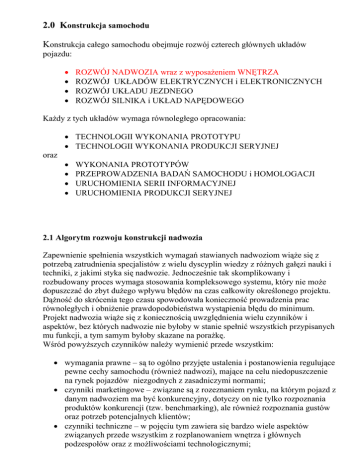 2.0 Konstrukcja samochodu Konstrukcja całego samochodu obejmuje rozwój czterech głównych układów pojazdu: • • • • ROZWÓJ NADWOZIA wraz z wyposażeniem WNĘTRZA ROZWÓJ UKŁADÓW ELEKTRYCZNYCH i ELEKTRONICZNYCH ROZWÓJ UKŁADU JEZDNEGO ROZWÓJ SILNIKA i UKŁAD NAPĘDOWEGO Każdy z tych układów wymaga równoległego opracowania: • TECHNOLOGII WYKONANIA PROTOTYPU • TECHNOLOGII WYKONANIA PRODUKCJI SERYJNEJ oraz • • • • WYKONANIA PROTOTYPÓW PRZEPROWADZENIA BADAŃ SAMOCHODU i HOMOLOGACJI URUCHOMIENIA SERII INFORMACYJNEJ URUCHOMIENIA PRODUKCJI SERYJNEJ 2.1 Algorytm rozwoju konstrukcji nadwozia Zapewnienie spełnienia wszystkich wymagań stawianych nadwoziom wiąże się z potrzebą zatrudnienia specjalistów z wielu dyscyplin wiedzy z różnych gałęzi nauki i techniki, z jakimi styka się nadwozie. Jednocześnie tak skomplikowany i rozbudowany proces wymaga stosowania kompleksowego systemu, który nie może dopuszczać do zbyt dużego wpływu błędów na czas całkowity określonego projektu. Dążność do skrócenia tego czasu spowodowała konieczność prowadzenia prac równoległych i obniżenie prawdopodobieństwa wystąpienia błędu do minimum. Projekt nadwozia wiąże się z koniecznością uwzględnienia wielu czynników i aspektów, bez których nadwozie nie byłoby w stanie spełnić wszystkich przypisanych mu funkcji, a tym samym byłoby skazane na porażkę. Wśród powyższych czynników należy wymienić przede wszystkim: • wymagania prawne – są to ogólno przyjęte ustalenia i postanowienia regulujące pewne cechy samochodu (również nadwozi), mające na celu niedopuszczenie na rynek pojazdów niezgodnych z zasadniczymi normami; • czynniki marketingowe – związane są z rozeznaniem rynku, na którym pojazd z danym nadwoziem ma być konkurencyjny, dotyczy on nie tylko rozpoznania produktów konkurencji (tzw. benchmarking), ale również rozpoznania gustów oraz potrzeb potencjalnych klientów; • czynniki techniczne – w pojęciu tym zawiera się bardzo wiele aspektów związanych przede wszystkim z rozplanowaniem wnętrza i głównych podzespołów oraz z możliwościami technologicznymi; • ergonomia – dziedzina ta ma niezwykle ważne znaczenie i ogromny wpływ na proces projektowania nadwozia, ponieważ dotyczy bezpośrednio nabywcy danego produktu; • czynniki estetyczne – zapewnienie estetyki nadwozia na odpowiednim poziomie wymaga coraz bardziej wyspecjalizowanego w tym kierunku wzornictwa przemysłowego; • czynniki ekonomiczne – wszelkie działania optymalizujące projekt, jak również produkcję, pod kątem ekonomicznym • system zapewniania jakości – zadowolenie klienta z końcowego produktu wiąże się ściśle z jakością produktu, która powinna być kontrolowana na wszystkich etapach powstawania nowego nadwozia oraz jego produkcji; Rozwój konstrukcji nadwozia samochodu można przedstawić w sposób uproszczony w postaci algorytmu, jak na schemacie poniżej. Główna niebieska strzałka w tle oznacza cały proces PLM (Product Lifecycle Management), w którym mieszczą się działania inżynierskie (strzałki dolne), działania logistycznorozliczeniowe (kolor szary) i działania mieszane: menedżerskie, kalkulacji ekonomicznej, technologiczne i związane z dystrybucją wyrobu. Zaopatrzenie, logistyka, kalkulacje i rozliczenia kosztów trwają praktycznie przez cały okres rozwoju. W jednym czasie odbywa się równolegle, wiele procesów. Przykładowo w trakcie opracowywania koncepcji i stylizacji przeprowadza się obliczenia i symulacje, wstępne opracowywanie konstrukcji oraz rozpoczyna się prace nad przygotowaniem prototypu. Zaopatrzenie Logistyka Kalkulacje, rozliczenia kosztów Prognozowanie Planowanie Seria informacyjna Prototyp, badania Konstrukcja Obliczenia, symulacje Koncepcja, stylizacja Produkcja Dystrybucja 2.2 Zakres rozwoju konstrukcji nadwozia Obejmuje następujący zakres w poszczególnych fazach: 1. ROZWÓJ NADWOZIA i WNĘTRZA 1.1 1.2 1.3 1.4 1.5 1.6 KONCEPCJA, STYLING OBLICZENIA i SYMULACJE KONSTRUKCJA BUDOWA PROTOTYPÓW BADANIA NADWOZIA SERIA INFORMACYJNA 1.1 KONCEPCJA, SZYLING 1.1.1. 1.1.2. 1.1.3. 1.1.4. 1.1.5. 1.1.6. 1.1.7. 1.1.8. 1.1.9. benchmarking wybór wstępnej koncepcji (wymiary, uwarunkowania normatywne) modele redukcyjne i w pełnej skali, studium wykonalności (feasibility1) strak, layout, package, ergonomia, DMU koncepcja struktury – wytrzymałość, bezpieczeństwo aerodynamika, koncepcja przewietrzania i klimatyzacji założenia technologiczne, optymalizacja wyboru materiałów, ochrona środowiska, recykling (4 do 7: feasibility2) zatwierdzenie koncepcji 1.2. OBLICZENIA 1.2.1 1.2.2 1.2.3 1.2.4 1.2.5 sztywność i wytrzymałość struktury nadwozia symulacje numeryczne dot. bezpieczeństwa (crash, airbagi) aerodynamika drgania, hałas symulacje procesów technologicznych 1.3. KONSTRUKCJA 1.3.1 1.3.2 1.3.3 1.3.4 1.3.5 1.3.6 szkielet części szkieletu przykręcane wyposażenie wnętrza wyposażenia zewnętrzne mechanizmy instalacja elektryczna 1.3.A DOKUMENTACJA KONSTRUKCYJNA • zapis geometrii (kształtu) wyrobu • przestrzeń zabudowy – części współpracujące, tolerancje… • właściwości fizyko-mechaniczne wyrobu jak masa, sztywność, wytrzymałość. • 1.3.B WYKAZY CZĘŚCI 1.3.C PLANY PRODUKCJI • • • • techniczne dokumenty produkcyjne (rysunki, protokoły, sprawozdania..) informacje administracyjne (wykazy części, plany terminowe..) informacje technologiczne części (opis procesu wykonania, wykaz operacji.) informacje technologiczne montażu wyrobu (opis procesu, rozplanowanie fabryki) 1.4 BUDOWA PROTOTYPÓW 1.4.1. Model koncepcyjny (ALFA) jest to makieta plastelinowa (clay) lub ureolowa w skali redukcyjnej lub 1:1 i służy do oceny zewnętrznej bryły nadwozia i ew. stylistyki wnętrza. 1.4.2. Concept Car / Konzeptfahrzeug - prototyp kształtu (BETA) (przedprototyp) jest to makieta przestrzenna, twarda (np. wyklejki PWS) i służy do wstę