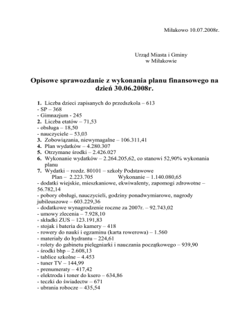 Miłakowo 10.07.2008r. Urząd Miasta i Gminy w Miłakowie Opisowe sprawozdanie z wykonania planu finansowego na dzień 30.06.2008r. 1. Liczba dzieci zapisanych do przedszkola – 613 - SP – 368 - Gimnazjum - 245 2. Liczba etatów – 71,53 - obsługa – 18,50 - nauczyciele – 53,03 3. Zobowiązania, niewymagalne – 106.311,41 4. Plan wydatków – 4.280.307 5. Otrzymane środki – 2.426.027 6. Wykonanie wydatków – 2.264.205,62, co stanowi 52,90% wykonania planu 7. Wydatki – rozdz. 80101 – szkoły Podstawowe Plan – 2.223.705 Wykonanie – 1.140.080,65 - dodatki wiejskie, mieszkaniowe, ekwiwalenty, zapomogi zdrowotne – 56.782,14 - pobory obsługi, nauczycieli, godziny ponadwymiarowe, nagrody jubileuszowe – 603.229,36 - dodatkowe wynagrodzenie roczne za 2007r. – 92.743,02 - umowy zlecenia – 7.928,10 - składki ZUS – 123.191,83 - stojak i bateria do kamery – 418 - rowery do nauki i egzaminu (karta rowerowa) – 1.560 - materiały do hydrantu – 224,61 - rolety do gabinetu pielęgniarki i nauczania początkowego – 939,90 - środki bhp – 2.608,13 - tablice szkolne – 4.453 - tuner TV – 144,99 - prenumeraty – 417,42 - elektroda i toner do ksero – 634,86 - teczki do świadectw – 671 - ubrania robocze – 435,54 - środki owadobójcze – 142 - lekarstwa (apteczka) – 36,56 - środki czystości – 1.556,54 - artykuły malarskie – 742,63 - pogotowie kasowe – 1.000 - artykuły biurowe (kalendarze, legitymacje szkolne, znaczki, dzienniki zajęć, druki, dzienniki lekcyjne) – 1.833,04 - pomoce dydaktyczne (ksiąŜki do biblioteki, mapy do historii, tablice do j. angielskiego, materiały na zajęcia korekcyjno-kompensacyjne) – 4.134,49 - energia cieplna – 119.891,54 - energia elektryczna – 22.177,75 - woda – 3.779,56 - remont sufitów – 6.399,89 - konserwacja ksero – 305 - remont łazienek – 16.295 - badania profilaktyczne – 140 - wywóz śmieci – 822,07 - ścieki – 3.635,63 - konserwacje (dojazd) – 48,80 - opieka autorska – 446,52 - odnowienie certyfikatu ZUS – 264,74 - badanie hydrantu – 97,60 - nauka tańca – 2.700 - abonament telewizji kablowej – 141,02 - prowizje bankowe, opłaty pocztowe, korzystanie z programu bankowego – 986,16 - internet- 1.371,28 - telefon stacjonarny – 1.415,43 - delegacje – 3.652,60 - odpisy na ZFŚS – 47.503 - papier ksero – 271,45 - akcesoria komputerowe (myszki, karta graficzna, rozgałęźniki) – 158,30 - licencja egzamin, antywirus – 514,80 - tusze – 1.235,35 8. Wydatki – rozdz. 80110 – Gimnazja Plan – 1.575.672 wykonanie – 941.858,56 - dodatki wiejskie i mieszkaniowe – 34.751,59 - pobory obsługi, nauczycieli, godziny ponadwymiarowe, nagrody jubileuszowe – 505.001,65 - dodatkowe wynagrodzenie roczne za 2007r. – 76.242,73 - składki ZUS – 111.253,16 - prenumeraty – 2.191,54 - świetlówki – 381,26 - części do ksero i tonery – 896,70 - artykuły biurowe (znaczki, dzienniki zajęć, dzienniki lekcyjne, świadectwa szkolne) – 1.616,04 - środki czystości – 2.199,58 - środki bhp – 2.712,20 - pomoce dydaktyczne (ksiąŜki do biblioteki, bryły, plansze) – 5.619,20 - energia cieplna – 87.244,13 - energia elektryczna – 8.729,88 - woda – 2.702,23 - remont łazienki – 16.791,84 - konserwacja gaśnic – 255,71 - konserwacja dźwigu kuchennego – 219,60 - konserwacja ksero – 244 - naprawa wzmacniacza – 150 - prowizje bankowe, korzystanie z programu bankowego, opłaty pocztowe – 831,95 - nauka tańca – 2.250 - wywóz śmieci – 4.001,14 - ścieki – 3.046,27 - opieka autorska – 2.232,60 - kontrola przewodów kominowych – 5.061,08 - internet – 522,16 - telefon stacjonarny – 1.059,13 - delegacje – 5.745,34 - odpisy na ZFŚS – 51.356 - szkolenia pracowników obsługi – 720,92 - papier ksero – 761,41 - zasilacz do laptopa – 179 - tusze – 766,42 - drukarka do sekretariatu – 1.927,60 - serwer komputerowy – 1.054 - drukarka do kadr – 304 - licencja sekretariat, arkusz organizacyjny, MOL – 637,50 - urządzenie umoŜliwiające łączność internetową - 199 9. Wydatki – rozdz. 80146 – Dokształcanie i doskonalenie nauczycieli Plan – 17.755 wykonanie – 14.027 - dopłata do czesnego – 14.027 10.Wydatki – rozdz. 80195 – Pozostała działalność Plan – 106.413 wykonanie – 39.054,15 - składki ZUS – 176,70 - umowy zlecenia (animator sportu, zajęcia sportowe) – 5.815,92 - piłeczki tenisowe, rakietki – 320,49 - siatki do bramki piłki noŜnej oraz do tenisa – 1.506,66 - sport na wesoło – 498,50 - samozamykacz do drzwi – 142,15 - dyplomy (Polska biega) – 549 - baner (festyn) – 312 - rolety (duŜa hala) – 2.550 - napój (festyn) – 300,90 - wąŜ i spryskiwacz na boisko – 102,30 - drewnochron, szpadel, grabie – 106,62 - wapno, cement – 89,59 - wyświetlenie filmu – 1.464 - montaŜ drzwi do siłowni – 451,40 - dorobienie kluczy – 137 - wyjazd uczniów na zawody i basen – 4.407,92 - odpisy na ZFŚS nauczycieli emerytów – 20.123 11.Wydatki – rozdz. 85401 – Świetlice szkolne Plan – 243.267 wykonanie – 109.145,26 - dodatki wiejski i mieszkaniowe – 3.499,73 - pobory obsługi i nauczycieli – 67.957,20 - dodatkowe wynagrodzenie roczne za 2007r. – 8.461,21 - składki ZUS – 13.909,37 - prenumeraty – 552,74 - karta telefoniczna (kierownik świetlicy) – 120 - artykuły na zajęcia w świetlicy – 216,06 - artykuły biurowe (znaczki, toner) – 103,70 - rolety – 1.680 - środki bhp – 300,40 - klimatyzator – 974,78 - gry planszowe – 272,70 - opłata RTV – 186,70 - prowizje bankowe, korzystanie z programu bankowego, opłaty pocztowe – 81 - czyszczenie drukarki – 24,40 - delegacje – 243,50 - odpisy na ZFŚS – 8.644 - papier ksero – 61,67 - program (magazyn Ŝywności) – 530 - tusze – 667,10 - listwa zasilająca, kabel (rozbudowa sieci) – 390 - podkładki pod myszki, myszki – 269 12.Wydatki – rozdz. 85415 – Pomoc materialna dla