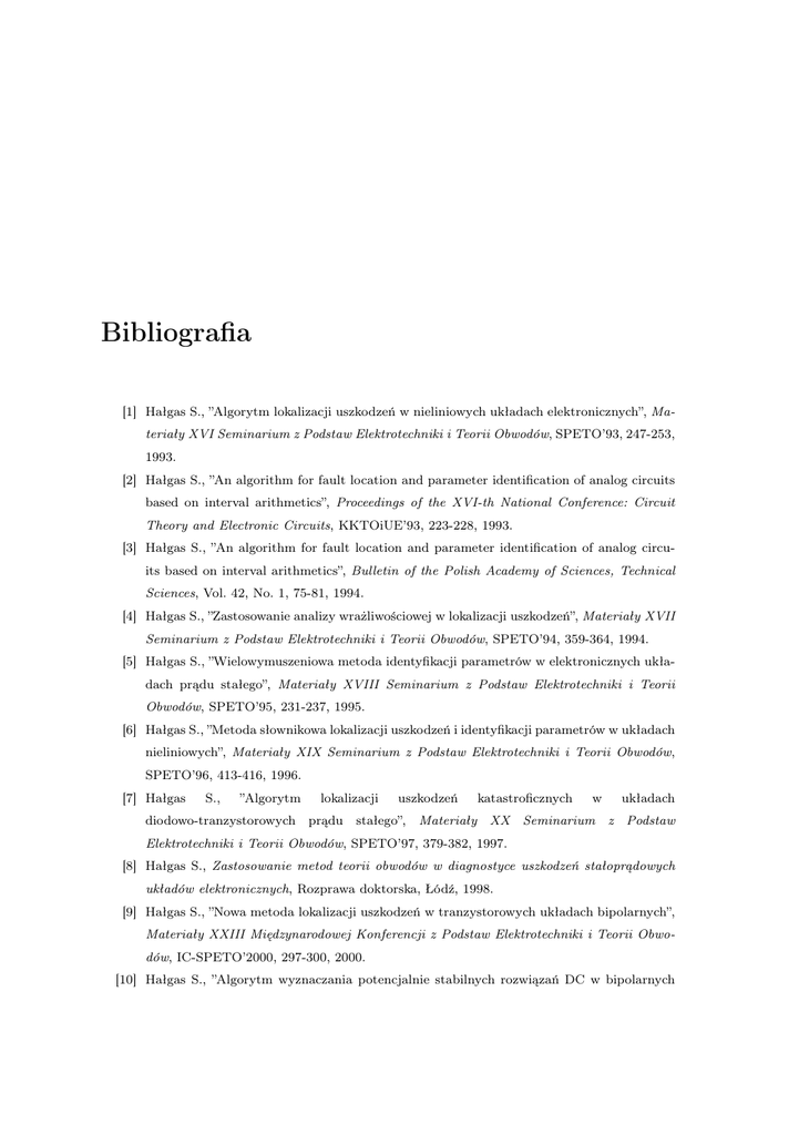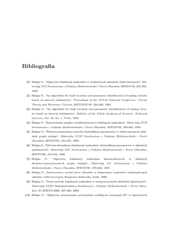 Bibliografia [1] Hałgas S., ”Algorytm lokalizacji uszkodzeń w nieliniowych układach elektronicznych”, Materiały XVI Seminarium z Podstaw Elektrotechniki i Teorii Obwodów, SPETO’93, 247-253, 1993. [2] Hałgas S., ”An algorithm for fault location and parameter identification of analog circuits based on interval arithmetics”, Proceedings of the XVI-th National Conference: Circuit Theory and Electronic Circuits, KKTOiUE’93, 223-228, 1993. [3] Hałgas S., ”An algorithm for fault location and parameter identification of analog circuits based on interval arithmetics”, Bulletin of the Polish Academy of Sciences, Technical Sciences, Vol. 42, No. 1, 75-81, 1994. [4] Hałgas S., ”Zastosowanie analizy wrażliwościowej w lokalizacji uszkodzeń”, Materiały XVII Seminarium z Podstaw Elektrotechniki i Teorii Obwodów, SPETO’94, 359-364, 1994. [5] Hałgas S., ”Wielowymuszeniowa metoda identyfikacji parametrów w elektronicznych układach prądu stałego”, Materiały XVIII Seminarium z Podstaw Elektrotechniki i Teorii Obwodów, SPETO’95, 231-237, 1995. [6] Hałgas S., ”Metoda słownikowa lokalizacji uszkodzeń i identyfikacji parametrów w układach nieliniowych”, Materiały XIX Seminarium z Podstaw Elektrotechniki i Teorii Obwodów, SPETO’96, 413-416, 1996. [7] Hałgas S., ”Algorytm diodowo-tranzystorowych lokalizacji prądu uszkodzeń stałego”, katastroficznych w układach Materiały XX Seminarium z Podstaw Elektrotechniki i Teorii Obwodów, SPETO’97, 379-382, 1997. [8] Hałgas S., Zastosowanie metod teorii obwodów w diagnostyce uszkodzeń stałoprądowych układów elektronicznych, Rozprawa doktorska, Łódź, 1998. [9] Hałgas S., ”Nowa metoda lokalizacji uszkodzeń w tranzystorowych układach bipolarnych”, Materiały XXIII Międzynarodowej Konferencji z Podstaw Elektrotechniki i Teorii Obwodów, IC-SPETO’2000, 297-300, 2000. [10] Hałgas S., ”Algorytm wyznaczania potencjalnie stabilnych rozwiązań DC w bipolarnych 2 Bibliografia układach tranzystorowych”, Materiały XXV Międzynarodowej Konferencji z Podstaw Elektrotechniki i Teorii Obwodów, IC-SPETO’2002, (2), 385-388, 2002. [11] Hałgas S., Tadeusiewicz M., ”Comparing some methods for finding all equilibrium states of transistor circuits”, Proceedings of IVth International Workshop: Computational Problems of Electrical Engineering, CPEE’2002, 93-96, 2002. [12] Hałgas S., Tadeusiewicz M., ”Tracing temperature characteristics in MOS-transistor circuits having multiple DC solutions”, Proceedings of the International Conference on Signals and Electronic Systems, ICSES 2006, 609-612, 2006. [13] Hałgas S., ”Metoda słownikowa wykrywania uszkodzeń parametrycznych w układach nieliniowych”, Materiały VI Krajowej Konferencji Elektroniki, KKE’07, , (1), 119-124, 2007. [14] Hałgas S., Tadeusiewicz M., ”Finding parametric characteristics in diode-transistor circuits”, Przegląd Elektrotechniczny - Konferencje, (2), 20-23, 2007. [15] Hałgas S.,”Multiple soft fault diagnosis of nonlinear circuits using the fault dictionary approach”, Bulletin of the Polish Academy of Sciences, Technical Sciences, (56), 53-57, 2008. [16] Tadeusiewicz M., Hałgas S., ”Continuation algorithms for solving nonlinear resistive circuits”, Proceedings of the XV-th National Conference: Circuit Theory and Electronic Circuits, KKTOiUE’92, 42-47, 1992. [17] Tadeusiewicz M., Hałgas S., ”DC analysis of nonlinear electronic circuits via homotopy approach”, Zeszyty Naukowe Politechniki Łódzkiej, Elektryka, (87), 77-87, 1994. [18] Tadeusiewicz M., Hałgas S., ”Usprawniony algorytm testu znaku wyznaczania wszystkich rozwiązań DC układów zawierających tranzystory MOS”, Materiały XX Seminarium z Podstaw Elektrotechniki i Teorii Obwodów, SPETO’97, 399-402, 1997. [19] Tadeusiewicz M., Jagocki M., Hałgas S., ”Improvement of the sign test for finding all the DC solutions of piecewise-linear circuits”, International Journal of Circuit Theory and Applications, (26), 531-538, 1998. [20] Tadeusiewicz M., Hałgas S., ”Finding all the DC solution of a certain class of piecewise-linear circuits”, Journal of Circuits, System and Signal Processing, (18), 89-110, 1999. [21] Tadeusiewicz M., Hałgas S., ”An effective algorithm for finding all equilibrium states of circuits containing Gummel-Poon modeled transistors”, Proceedings of the 6th International Conference on Mixed Design of Integrated Circuits and Systems, MIXDES’99, 163-166, 1999. [22] Tadeusiewicz M., Hałgas S., ”An effective algorithm for finding all the DC solution of MOS transistor circuits represented by original polynomial nonlinearities”, Proceedings of the European Conference on Circuit Theory and Design, ECCTD’99, 467-470, 1999. [23] Tadeusiewicz M., Hałgas S., ”Finding all the DC solution of the DC solutions of MOS transistor circuits described by original nonlinear equations”, Kwartalnik Elektroniki i Telekomunikacji, (46), 281-297, 2000. [24] Tadeusiewicz M., Hałgas S., ”An algorithm for finding all the DC solution of short-channel Bibliografia 3 MOS transistor circuits”, Proceedings of the 7th IEEE International Conference on Electronics, Circuits, and Systems, ICECS’2000, 924-927, 2000. [25] Tadeusiewicz M., Hałgas S., ”An algorithm for soft fault diagnosis of DC circuits”, Proceedings of the 15th European Conference on Circuit Theory and Design, ECCTD’01, (1), 245-248, 2001. [26] Tadeusiewicz M., Hałgas S., ”Soft fault diagnosis of nonlinear DC circuits”, Proceedings of the International Conference on Signals and Electronic Systems, ICSES’2001, 341-347, 2001. [27] Tadeusiewicz M., Hałgas S., ”An improved algorithm for the analysis of MOS transistor circuits having multiple DC solutions”, Proceedings of XI International Symposium on Theoretical Electrical Engineering, ISTET’2001, CDROM, stron 4, 2001. [28] Tadeusiewicz M., Hałgas S., ”Wyznaczanie charakterystyk typ