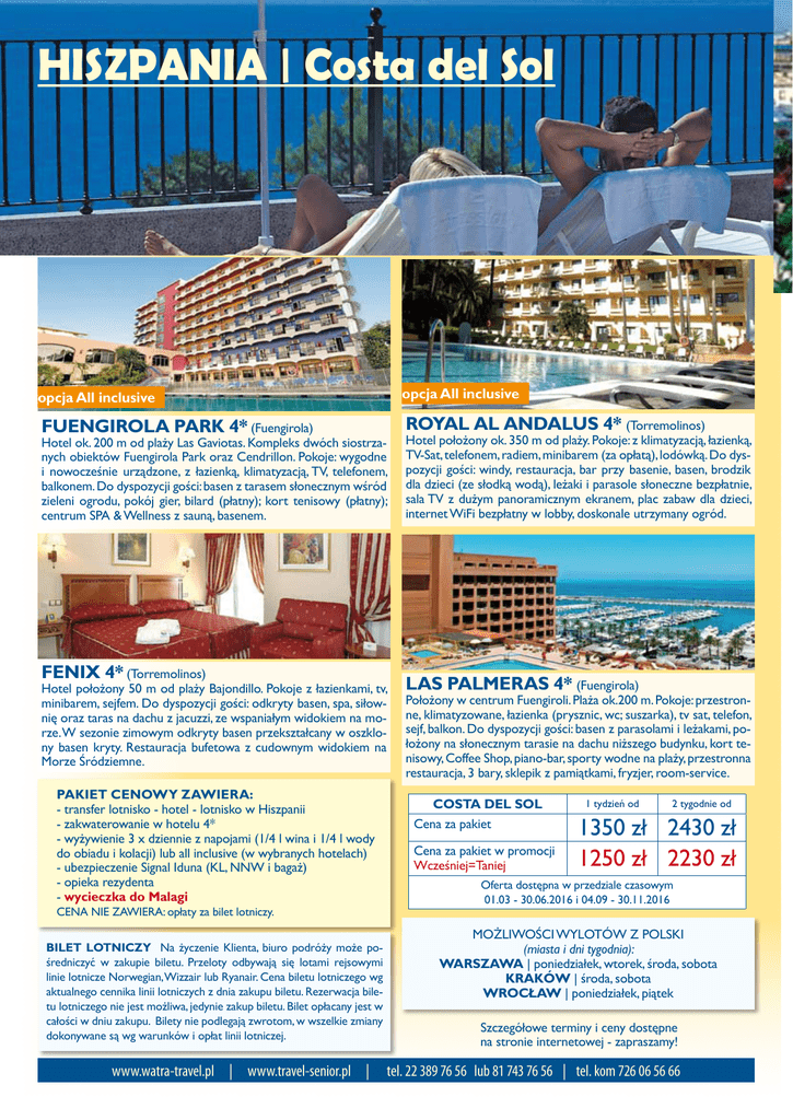 HISZPANIA | Costa del Sol opcja All inclusive opcja All inclusive FUENGIROLA PARK 4* (Fuengirola) ROYAL AL ANDALUS 4* (Torremolinos) Hotel położony ok. 350 m od plaży. Pokoje: z klimatyzacją, łazienką, TV-Sat, telefonem, radiem, minibarem (za opłatą), lodówką. Do dyspozycji gości: windy, restauracja, bar przy basenie, basen, brodzik dla dzieci (ze słodką wodą), leżaki i parasole słoneczne bezpłatnie, sala TV z dużym panoramicznym ekranem, plac zabaw dla dzieci, internet WiFi bezpłatny w lobby, doskonale utrzymany ogród. Hotel ok. 200 m od plaży Las Gaviotas. Kompleks dwóch siostrzanych obiektów Fuengirola Park oraz Cendrillon. Pokoje: wygodne i nowocześnie urządzone, z łazienką, klimatyzacją, TV, telefonem, balkonem. Do dyspozycji gości: basen z tarasem słonecznym wśród zieleni ogrodu, pokój gier, bilard (płatny); kort tenisowy (płatny); centrum SPA & Wellness z sauną, basenem. FENIX 4* (Torremolinos) Hotel położony 50 m od plaży Bajondillo. Pokoje z łazienkami, tv, minibarem, sejfem. Do dyspozycji gości: odkryty basen, spa, siłownię oraz taras na dachu z jacuzzi, ze wspaniałym widokiem na morze. W sezonie zimowym odkryty basen przekształcany w oszklony basen kryty. Restauracja bufetowa z cudownym widokiem na Morze Śródziemne. PAKIET CENOWY ZAWIERA: - transfer lotnisko - hotel - lotnisko w Hiszpanii - zakwaterowanie w hotelu 4* - wyżywienie 3 x dziennie z napojami (1/4 l wina i 1/4 l wody do obiadu i kolacji) lub all inclusive (w wybranych hotelach) - ubezpieczenie Signal Iduna (KL, NNW i bagaż) - opieka rezydenta - wycieczka do Malagi CENA NIE ZAWIERA: opłaty za bilet lotniczy. BILET LOTNICZY Na życzenie Klienta, biuro podróży może pośredniczyć w zakupie biletu. Przeloty odbywają się lotami rejsowymi linie lotnicze Norwegian, Wizzair lub Ryanair. Cena biletu lotniczego wg aktualnego cennika linii lotniczych z dnia zakupu biletu. Rezerwacja biletu lotniczego nie jest możliwa, jedynie zakup biletu. Bilet opłacany jest w całości w dniu zakupu. Bilety nie podlegają zwrotom, w wszelkie zmiany dokonywane są wg warunków i opłat linii lotniczej. www.watra-travel.pl | www.travel-senior.pl | LAS PALMERAS 4* (Fuengirola) Położony w centrum Fuengiroli. Plaża ok.200 m. Pokoje: przestronne, klimatyzowane, łazienka (prysznic, wc; suszarka), tv sat, telefon, sejf, balkon. Do dyspozycji gości: basen z parasolami i leżakami, położony na słonecznym tarasie na dachu niższego budynku, kort tenisowy, Coffee Shop, piano-bar, sporty wodne na plaży, przestronna restauracja, 3 bary, sklepik z pamiątkami, fryzjer, room-service. COSTA DEL SOL Cena za pakiet Cena za pakiet w promocji Wcześniej=Taniej 1 tydzień od 2 tygodnie od 1350 zł 2430 zł 1250 zł 2230 zł Oferta dostępna w przedziale czasowym 01.03 - 30.06.2016 i 04.09 - 30.11.2016 MOŻLIWOŚCI WYLOTÓW Z POLSKI (miasta i dni tygodnia): WARSZAWA | poniedziałek, wtorek, środa, sobota KRAKÓW | środa, sobota WROCŁAW | poniedziałek, piątek Szczegółowe terminy i ceny dostępne na stronie internetowej - zapraszamy! tel. 22 389 76 56 lub 81 743 76 56 | tel. kom 726 06 56 66