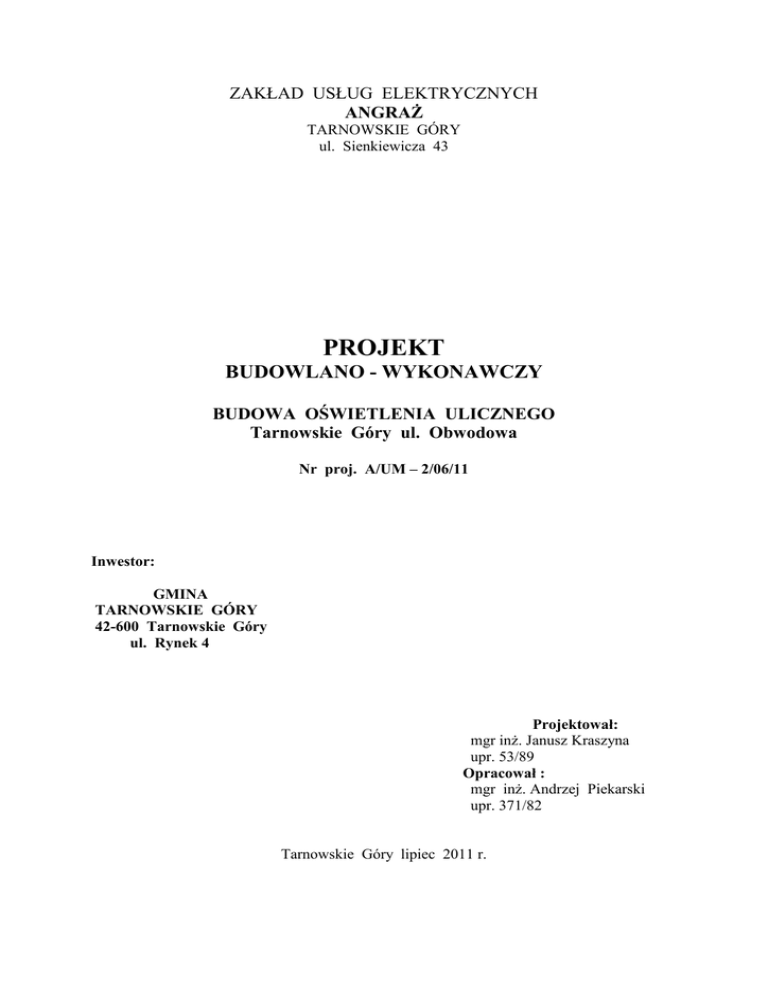 ZAKŁAD USŁUG ELEKTRYCZNYCH ANGRAś TARNOWSKIE GÓRY ul. Sienkiewicza 43 PROJEKT BUDOWLANO - WYKONAWCZY BUDOWA OŚWIETLENIA ULICZNEGO Tarnowskie Góry ul. Obwodowa Nr proj. A/UM – 2/06/11 Inwestor: GMINA TARNOWSKIE GÓRY 42-600 Tarnowskie Góry ul. Rynek 4 Projektował: mgr inŜ. Janusz Kraszyna upr. 53/89 Opracował : mgr inŜ. Andrzej Piekarski upr. 371/82 Tarnowskie Góry lipiec 2011 r. -2- I. ZAWARTOŚĆ PROJEKTU. 1. Warunki przyłączenia oświetlenia odcinka ulicy Obwodowejej w Tarnowskich Górach T/DJK/1723/2011 wydane przez Vattenfall Gliwice z dn. 18.02.2011 r wraz z Aneksem nr 1 z dnia 12.07.2011r. 2. Wypis i wyrys z miejscowego planu zagospodarowania. 3. Opis techniczny. 4. Obliczenia techniczne 5. Zestawienie materiałowe. 6. Informacja BiOZ. 7. Plan sytuacyjny 8. Projekt zagospodarowania terenu. Plan trasy oświetlenia ulicy Obwodowej. - rys 01 9. Schemat ideowy zasilania - rys. 02 10. Wypisy z ewidencji gruntów. 11. Decyzja GDDKIA z dnia 28.06.2011r uzgadniająca przebieg projektowanego oświetlenia. 12. Uzgodnienie ze Starostą Tarnogórskim - pismo VG.Z.7224 – 125/11 z dnia 17.08.2011r. - pismo VG.Z.7224 – 125/11 z dnia 9.09.2011r. 13. Uzgodnienie z Urzędem Miejskim Wydział Gospodarki Nieruchomościami w Tarnowskich Górach - pismo GN.6852.212.2011 z dnia 19.08.2011r. 14. Opinia ZUD 494/2011 z dnia 11.08.2011r. 15. Uzgodnienia branŜowe. - MZiM Tarnowskie Góry - Vattenfall Gliwice - Telekomunikacja Polska S.A. - Ericsson Sp.z o.o. - Vectra Inwestments - PWiK Tarnowskie Góry - GPW Katowice - Górnośląska Spółka Gazownictwa Sp. z o.o. - Gaz – System S.A. -3- II. OPIS TECHNICZNY 1. Opracowanie obejmuje projekt budowy oświetlenia fragmentu ulicy Obwodowej w Tarnowskich Górach na odcinku od skrzyŜowania z ulicami Gruzełki i Szczygłów do skrzyŜowania z ulicą Opatowicką. 2. Podstawa opracowania Projekt opracowano w oparciu o : a) zlecenie inwestora b) warunki przyłączenia oświetlenia odcinka ulicy Obwodowejej T/DJK/1723/2011 z dnia 18.02.2011 r i aneks z dnia 12.07.2011r. wydane przez VATTENFALL Gliwice. c) wypis i wyrys z miejscowego planu zagospodarowania przestrzennego d) uzgodnienie z GDDKiA O/Katowice. e) wizję lokalną f) uzgodnienia z uŜytkownikami infrastruktury technicznej. g) uzgodnienia z właścicielami gruntów. h) obowiązujące przepisy i normy 3. Stan istniejący oświetlenia ulicy Obwodowejej na odcinku od skrzyŜowania z ulicami Gruzełki i Szczygłów do skrzyŜowania z ulicą Opatowicką. PowyŜszy fragment drogi krajowej nr 11 stanowiący część ulicy Obwodowej nie posiada oświetlenia pomimo iŜ usytuowane są tutaj dwa przejścia dla pieszych. Zachodzi konieczność wykonania oświetlenia w tym rejonie z uwagi na duŜe natęŜenie ruchu kołowego i pieszego. 4. Projektowany odcinek oświetlenia ul. Obwodowej. Zgodnie z warunkami technicznymi przyłączenia T/DJK/1723/2011 projektowany fragment oświetlenie ulicy Obwodowej zostanie włączony do istniejącego oświetlenia ulicznego przy ulicach Szczygłów i Opatowickiej. Całość odcinka nowego oświetlenia zaprojektowano po lewej stronie ulicy patrząc od Tarnowskich Gór w stronę Lublińca. Słupy oświetleniowe zlokalizowano za istniejącym chodnikiem w odległości ok.3 m od krawęŜnika jezdni. Lokalizacja oświetlenia została uzgodniona przez GDDKiA O/Katowice pismem GDDKiA – O/KA – 23/435/sc/1846/11/1491 z dn. 28.06.2011r Zasilanie realizowane będzie ziemną linią kablową YAKY 4 x 35. Kabel układać w ziemi na głębokości 0,7 m w rurach ochronnych AROT DVK 75 oraz przykryć folią ostrzegawczą koloru niebieskiego. Przejścia pod ulicami Szczygłów i Opatowicką wykonać metodą przewiertu zgodnie z ustaleniami MZUiM Tarnowskie Góry - pismo MZUiM – 7040/982/1 z dn. 8.08.2011r. Oświetlenie fragmentu ulicy Obwodowej zaprojektowano na stalowych ocynkowanych słupach umoŜliwiającymi zawieszenie opraw oświetleniowych na wysokości 9 m od poziomu jezdni - trzy słupy w punktach „K” , „L” , „M” winny posiadać wysokość 10 m -4z uwagi na zagłębienie terenu. ( np. PIAST produkcji SENKO Siemianowice lub inne o podobnych parametrach ). By uzyskać wymagane przepisami natęŜenie oświetlenia zaprojektowano oprawy typu ulicznego ( np. Boyen – ES System lub SGS Malaga II firmy Philips lub inne o nie gorszych parametrach ) z wysokopręŜnymi lampami sodowymi 250 W przy przejściach dla pieszych, a na pozostałym odcinku 150 W. Oprawy winne posiadać pięciostopniową regulacją odbłyśnika zapobiegającą zjawisku olśnienia. Oprawy montować na wysięgnikach o długości 1,2 m Oprawy muszą posiadać stopień szczelności IP65 , a II klasa ochronności zapewnia dodatkowe bezpieczeństwo bez stosowania dodatkowej ochrony przeciwporaŜeniowej. Zgodnie z zaleceniem producenta aby uzyskać optymalne natęŜenie oświetlenia i jego równomierność oprawy zawieszono na wysokości równej szerokości ulicy , zaś odstęp między nimi jest około 3,5 razy większy od wysokości zawieszenia. Plan projektowanej trasy oświetleniowej oraz rozmieszczenie ulicznych latarń przedstawiono na rysunku nr. 01 , zaś układ połączeń przedstawia schemat ideowy. ( rys.02) Nowoprojektowany odcinek oświetlenia podłączyć do istniejących napowietrznych sieci oświetleniowych przy ulicach Opatowickiej i Szczygłów , a wejścia kabli na słupy osłonić rurami AROTA BE 50. oraz zamontować odgromniki przepięć GXO 0,66/5 z uziemieniem. W środku nowoprojektowanego odcinka dokonać podziału na dwa odcinki zgodnie ze schematem ideowym ( rys. 02 ). Pomiar zuŜycia energii odbywać się będzie w istniejących szafach oświetleniowych. Projekt oświetlenia wykonano w oparciu o normę PN-IEC 60364 – 7 -714. 5. Ochrona przeciwporaŜeniowa. Na całej długości sieci oświetleniowej naleŜy ułoŜyć bednarkę uziemiającą którą naleŜy połączyć ze stalowymi słupami.. Jako system ochrony przeciwporaŜeniowej w sieci przewidziano szybkie wyłączenie. Z