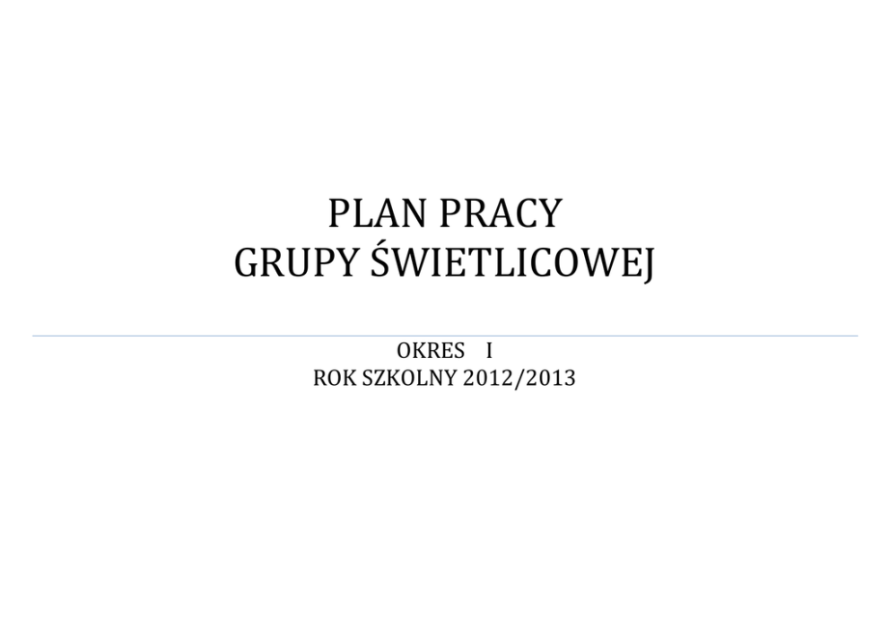 PLAN PRACY GRUPY ŚWIETLICOWEJ OKRES I ROK SZKOLNY 2012/2013 DATA 3-7 IX 2012r. HASŁO TYGODNIA Witaj szkoło, witaj świetlico! ZAJĘCIA PLASTYCZNO TECHNICZNE WRZESIEŃ Skarby lata – krajobraz metodą kolażu wyklejanego z piasku, muszelek, liści itp. ZADANIA DYDAKTYCZNO - WYCHOWAWCZE Zapisy dzieci do świetlicy. Omówienie dziennego rozkładu zajęć w świetlicy, zasad zachowania się w salach, na jadalni i boisku szkolnym. Zapoznanie z regulaminem świetlicy. Pocztówka z wakacji – rysowanie pastelami i kredkami. Portret przyjaciela z wakacji – malowanie farbami. Kilka słów o sobie - wzajemne zapoznanie się dzieci i wychowawców. GRY, ZBAWY, ZAJĘCIA UYZYKALNIAJĄCE Zabawy integracyjne sprzyjające poznaniu się dzieci, np.: „Piłka pełna imion”, „Kto zmienił miejsce”, „Kogo brakuje”, „Pajęczyna”, „Zgadnij czyje słyszysz imię”, „Rozpoznaj dotykiem”. Zabawy orientacyjno – porządkowe – ćwiczenia sprawnego ustawiania się. Zabawy na świeżym powietrzu: plac zabaw, zajęcia ruchowe z piłką, wyścigi rzędów. Zabawy usprawniające kojarzenie: podaj wyraz przeciwstawny, jeden wyraz kilka znaczeń, układanie kilku wyrazów z jednego. Pogadanka: „Szkolny savoir vivre” – jak zachowywać się, by nikomu nie przeszkadzać i być lubianym w grupie. Gry stolikowe: „Mozaika Zuzi”, „Zgadnij kto to?”, „Super konstruktor”, „Na kury”. Po pierwszym dzwonku – dzielimy się wrażeniami z pierwszych dni w szkole. Rozmowa kierowana: „Jak spędziliśmy wakacje” – relacje z letnich przygód. 10-14 IX 2012r. Bezpieczna droga do szkoły Pogadanka: „Bądź bezpieczny na drodze” – zasady zachowania w drodze do i ze szkoły. Poznajemy znaki drogowe (zakazu, nakazu, ostrzegawcze i informacyjne) rozpoznawanie ich kształtów i kolorów. Dziecięce ABC ruchu drogowego – ustalenie najważniejszych zasad zachowania na drodze przez dzieci. Kolorowe znaki drogowe – rysunek kredką, wykonanie znaku z patyczków i plasteliny. Pan Policjant moim przyjacielem – malowanie scen farbami. „Moja droga do szkoły” – technika dowolna. Tematyczne kolorowanki. Odgrywanie scenek związanych z różnymi zdarzeniami na drodze – wypracowanie prawidłowego 2 Zabawy ruchowe: „Jadą auta”, „Szukamy swojego garażu”, „Ruch uliczny”. Ćwiczenia w prawidłowym przechodzeniu przez jezdnię. Gry stolikowe: „Moto- konstruktor”, „Puzzle ortograficzne”, „Krzesła i stoły”,„Patyczaki” Zajęcia relaksacyjne z wykorzystaniem miękkiej lokomotywy i puf do wypoczynku: ćwiczenia oddechowe, masażyki. schematu zachowania. Rozmowa kierowana na podstawie historyjki obrazkowej pt: „Na ulicy”. Quiz „Bezpieczeństwo na drodze”. 17-21 IX 2012r. Kocham, lubię, szanuję… nie śmiecę! Pogadanka: „Dbajmy o czystą Ziemię bo mamy ją tylko jedną” – jak chronić środowisko. Jak możemy zapobiegać powstawaniu śmieci? – burza mózgów. Pogadanka: „Dlaczego sprzątamy świat? ” – w oparciu o wiersz pt. „Zmartwienia Ziemi”. Moja planeta – plakat ekologiczny wykonany techniką dowolną Wykonanie „Śmieciora” – postaci z butelek plastikowych, kawałków materiałów, gazet, torebek foliowych Zabawa symbolami – wykonanie piktogramów informujących o zakazie śmiecenia – rysowanie kredkami. Zabawy w kręgu „Ziemia – powietrze – woda”, „Zgadnij jakim zwierzątkiem jestem”, „Kalambury” Zabawy ruchowe przy muzyce: „Taniec na gazecie”, „Krzesła” Zajęcia na świeżym powietrzu: spacery po okolicy, gry zespołowe Zabawy matematyczne: „Dobrze policz”, „Bum”, zabawy z kostką. Czytanie i nauka jednego z wierszy ekologicznych: M. Buczek „Dzieci śmieci”, D.Klimkiewicz, W.Drabik „Co to jest eklogia”, St.Kraszewski „Śmieciu precz” – rozmowa kierowana na podstawie treści wierszy. Ekologiczne gry edukacyjne: „Mały Ekolog”, „O wydrze, bobrze i wilku”. Spotkania z Maurycym Marchewką – zajęcia multimedialne na stronach Ministerstwa Ochrony Środowiska: http://dzieci.mos.gov.pl/ Zajęcia w oparciu o materiały dydaktyczne udostępnione na stronach internetowych Fundacji Nasza Ziemia w zakładce „Sprzątanie świata”. Podsumowanie tematu tygodnia: dekalog małego ekologa – plakat informacyjny. 24-28 IX 2012r. Pani Jesień kolorowe liście niesie! Słuchanie tekstu L. Krzemienieckiej „Czas do lasu iść”. Ustalenie zasad jak należy się zachowywać trakcie wycieczki. Odbijanie liści ołówkiem na pergaminie Zabawy przy muzyce: A.Vivaldi „Cztery pory roku – Jesień”, interpretacja muzyki za pomocą tańca Łączenie liści w szal dla Pani Jesieni. Konkurs skoków na skakance 3 Zapoznanie z wierszem J. Kulmowej „Jesienna pogoda” – omówienie utworu adekwatnego do jesiennej aury. i rzutów do celu. Grzybki z kartonu – zorganizowanie wystawki Spacery po okolicy – obserwowanie zmian zachodzących w przyrodzie, zbieranie liści, kasztanów i szyszek. Zabawy w kręgu: „Piłka parzy”, „Worek ze skarbami”, „Stary niedźwiedź mocno śpi” Zabawy dydaktyczne: „Wąż słów”, „Dokończ wyrazy na głoskę np. ma…”, ułóż zdania z wyrazem jesień. Rozmowa kierowana: Czy jesień da się lubić? – porównanie złotej polskiej jesieni z szarówką jesienną. Zabawy ruchowe: „Twister”, „Twister moves”, X- box Kineckt, Mata Taneczna Rozmowa na temat: Czy las to tylko drzewa? Co daje nam las? Zagadki o tematyce jesiennej. Zajęcia multimedialne: wyszukiwanie w Internecie informacji na temat: Jak zwierzęta żyjące w lesie przygotowują się do zimy? 1-5 X 2012r. Bez złości mamy więcej radości PAŹDZIERNIK Obrazy mojej złości – kolaż Pogadanka: Co mnie złości? Kiedy jestem zły? – z wycinków gazetowych kształtowanie umiejętności opisywania swoich emocji. Drzewko szczęścia – wykonanie drzewka z papieru kolorowego z imionami wszystkich dzieci Czytanie opowiadania: "Kiedy Kan - No - Mushi się obu