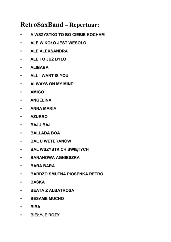 RetroSaxBand – Repertuar: • A WSZYSTKO TO BO CIEBIE KOCHAM • ALE W KOŁO JEST WESOŁO • ALE ALEKSANDRA • ALE TO JUŻ BYŁO • ALIBABA • ALL I WANT IS YOU • ALWAYS ON MY MIND • AMIGO • ANGELINA • ANNA MARIA • AZURRO • BAJU BAJ • BALLADA BOA • BAL U WETERANÓW • BAL WSZYSTKICH ŚWIĘTYCH • BANANOWA AGNIESZKA • BARA BARA • BARDZO SMUTNA PIOSENKA RETRO • BAŚKA • BEATA Z ALBATROSA • BESAME MUCHO • BIBA • BIEŁYJE ROZY • BLONDYNECZKA • BO JESTEŚ TY • BROTHER LOUIE • BYLE BYŁO TAK • CALIFORNIA BLUE • CANKAN • CAŁA SALA • CAŁUJ MNIE • CELEBRATION • CHAŁUPY • CHCĘ TU ZOSTAĆ • CHŁOPAKI NIE PŁACZĄ • CHŁOPCY RADAROWCY • CICHA WODA • CIAŁO DO CIAŁA • COCO JUMBO • CO TY NA TO • CO TY TUTAJ ROBISZ • COMMENT CA VA • COPACABANA • COSE DELLA VITA • CÓRKO RYBAKA • CUCARACHA • CUDOWNYCH RODZICÓW MAM • CYGANECZKA ZOSIA • CZARNE OCZY • CZAROWNICA • CZEKAM NA TĘ JEDNĄ CHWILĘ • CZERWONA JARZĘBINA • CZERWONE KORALE • CZERWONY JAK CEGŁA • CZTERDZIEŚCI LAT MINĘŁO • CZUJĘ I WIEM • CZY TEN PAN I PANI • DAJ BUZIAKA • DAJ MI TĘ NOC • DANCING QUEEN • DNI, KTÓRYCH NIE ZNAMY • DLA NAS TA NOC • DO NIEBA, DO PIEKŁA • DO ZAKOCHANIA JEDEN KROK • DON’T WORRY, BE HAPPY • DOZWOLONE OD LAT 18 • DUMKA NA DWA SERCA • DWADZIEŚCIA LAT, A MOŻE MNIEJ • DWUDZIESTOLATKI • DZIEWCZYNY, KTÓRE MAM NA MYŚLI • DZIEWCZYNY LUBIĄ BRĄZ • DZISIAJ, JUTRO • EVERYTHING I DO.. • FACET TO ŚWINIA • FILMOWA MIŁOŚĆ • FEEL • FELICITA • FIELDS OF GOLD • FOOTLOOSE • GDYBYM BYŁ BOGACZEM • GDY NAM ŚPIEWAŁ ELVIS PRESLEY • GDY ZAPŁACZESZ • GET LUCKY • GŁĘBOKA STUDZIENKA • GRAJ CYGANIE, GRAJ • GREK ZORBA • GUANTANAMERA • GWIAZDOR • HONEY, HONEY • HAVE YOU EVER SEEN THE RAIN • HEART OF GLASS • HISTORIA JEDNEJ ZNAJOMOSCI • HOW DEEP IS YOUR LOVE • I BELIEVE I CAN FLY • I CAN’T HELP • I DON’T WANT TO MISS A THING • I FEEL LONELY • I JUST CALL TO SAY I LOVE YOU • IM WIĘCEJ CIEBIE • I NEED A HERO • IT’S NOW OR NEVER • IT’S RAINING MAN • I WILL SURVIVE • JAK ANIOŁA GŁOS • JAK NIE MY, TO KTO • JAK SIĘ MASZ, KOCHANIE • JEDZIE POCIĄG • JEDEN KRÓTKI DZIEŃ • JEDNA NA MILION • JEDNA Z GWIAZD • JEDWAB • JEJ CZARNE OCZY • JEST JUŻ CIEMNO • JESTEM Z MIASTA • JESTEŚ SZALONA • JESZCZE DZIEŃ, NAJWYŻEJ DWA • JEŚLI TYLKO CHCESZ • JOHNNY B. GOODE • JUŻ NIE MA DZIKICH PLAŻ • KASIA • KAWAŁEK DO TAŃCA • KTOŚ MNIE POKOCHAŁ • KOCHAĆ • KOLOROWE JARMARKI • KONIK NA BIEGUNACH • KORMORANY • KRAKOWIANKA • KRYZYSOWA NARZECZONA • KULIG • LASCIATE MI CANTARE • LAST CHRISTMAS • LATO • LATO W KOŁOBRZEGU • LET’S TWIST AGAIN • LILY WAS HERE • LOVE IS ALL AROUND • LORNETKA • LUBIŁA TAŃCZYĆ • ŁADNE OCZY • MAMMA MARIA • MACARENA • MAKUMBA • MALOWANE USTA • MALLORCA • MAŁGOŚKA • MAŁY KSIĄŻE • MAKUMBA • MAMBO NR 5 • MARINA • MATURA • MEXICANA • MIAŁEŚ BYĆ • MIĘDZY NAMI NIC NIE BYŁO • MIŁOŚĆ • MNIEJ NIŻ ZERO • MOJA DROGA, JA CIĘ KOCHAM • MOJA MAŁA BLONDYNECZKO • MONIKA RATOWNIKA • MÓJ PRZYJACIELU • MY CYGANIE • NEW YORK, NEW YORK • NIEBO Z MOICH STRON • NIE BYŁO CIEBIE TYLE LAT • NIEDZIELA BĘDZIE DLA NAS • NIE LICZĘ GODZIN I LAT • NIE PŁACZ EWKA • NIE PŁACZ KIEDY ODJADĘ • NIE SAMYM CHLEBEM • NIE STAŁO SIĘ NIC • NIE ZADZIERAJ NOSA • NIKT NA ŚWIECIE NIE WIE • NOGI • NOSSA • NOTHING’S GONNA CHANGE • OCZAROWANIE • O MNIE SIĘ NIE MARTW • OBLADI OBLADA • OD DZIŚ • OH, CAROL • OH, JULIE • ONA TAŃCZY DLA MNIE • ONE WAY TICKET • ONLY YOU • OSTATNIA NIEDZIELA • PAROSTATEK • PARTY • PIĘKNIEJSZA • PIU BELLA COSA • PIĄTY BIEG • POCIĄG • POD PAPUGAMI • POKAŻ NA CO CIĘ STAĆ • POKOLENIE • POLKA DZIADEK • POLSKIE DZIEWCZYNY • POWIEDZ • POWIEDZ STARY • PÓKI NA TO CZAS • PRAWIE DO NIEBA • PRAWY DO LEWEGO • PRAWDZIWE POWIETRZE • PROWADŹ MNIE • PRÓCZ CIEBIE NIC • PRYWATKI • PRZEŚLICZNA WIOLONCZELISTKA • PRZETAŃCZYĆ Z TOBĄ • PRZEŻYJ TO SAM • PRZEŻYŁAM Z TOBĄ TYLE LAT • PUSTE KOPERTY • PYTASZ MNIE • QUANDO QUANDO • QUE SERA • RASPUTIN • ROCK O’CLOCK • ROCK& ROLL MUSIC • ROSAMUNDA • RUDA TAŃCZY JAK SZALONA • RUDY SIĘ ŻENI • RUDY RYDZ • SACRIFICE • SACRUM • SARA PERCHE TI AMO • SAVE THE LAST DANCE FOR ME • SEN SIĘ SPEŁNI • SEMPRE SEMPRE • SERDUSZKO PUKA W RYTMIE CHA CHA • SET ON YOU • SEX BOMB • SHA LA LA LA • SHE • SŁODKA KAROLINA • SŁODKO SŁODKA • SŁODKIEGO MIŁEGO ŻYCIA • SŁODYCZE • SKRZYDLATE RĘCE • SOKOŁY • SOMEONE LOVES YOU, HONEY • STACJA W-WA • SUKNIE KOLOROWE • SUN OF JAMAICA • SUNNY • SUZANNA • SWAY • SWEET HOME ALABAMA • SZALONA • SZALAŁA SZALAŁA • ŚCIERNISKO • ŚNIADANIE DO ŁÓŻKA • ŚWIAT NIE WIERZY ŁZOM • TAK BARDZO • TAKIE ŁADNE OCZY • TAKIE TANGO • TAK SMAKUJE ŻYCIE • TAŃCZ GŁUPIA TAŃCZ • TIME OF MY LIFE • TO CO DAŁ NAM ŚWIAT • TO CO NAM BYŁO • TO JEST PO PROSTU ROCK AND ROLL • TO JUŻ LATO • TO ZA NAMI • TREASURE • TROSZECZKĘ ZIEMI • TYLE SŁOŃCA • TYLKO TY TYLKO JA • TYP NIEPOKORNY • U CIOCI NA IMIENINACH • UKRAINA • UNCHAINED MELODY • VOLARE • WAKE ME UP BEFORE ME GO GO • WALK OF LIFE • W AUCIE • WAY BACK INTO LOVE • W DRODZE DO FONTENBLAU • W GORĄCYM SŁOŃCU CASABLANKI • W SINĄ DAL • W ZIELONYM GAJU • WEHIKUŁ CZASU • WHAT A WONDERFUL WORLD • WHATEVER YOU GO • WHEN THE MAN LOVES A WOMAN • WHISKEY MOJA ŻONO • WIĄZANKA BIESIADNA • WINDĄ DO NIEBA • WIŚNIOWY SAD • WONDERFUL TONIGHT • WOLNOŚĆ • WSCHODAMI GWIAZD • WSIĄŚĆ DO POCIĄGU • WSPOMNIENIE • WSZYSCY POLACY • WYPIJMY ZA BŁĘDY • WYSPA SZCZĘŚLIWYCH SNÓW • Y.M.C.A. • YOU DRIVE ME CRAZY • YOU’RE BEAUTIFUL • 