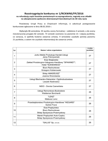 Rozstrzygnięcie konkursu nr 1/RCKWNS/FP/2016 na refundację części kosztów poniesionych na wynagrodzenia, nagrody oraz składki na ubezpieczenia społeczne skierowanych bezrobotnych do 30 roku życia Powiatowy Urząd Pracy w Chojnicach informuje, iż zakończył postępowanie konkursowe ogłoszone w dniu 08.02.2016 r. Wpłynęło 86 wniosków. W wyniku oceny formalnej – oddalono 4 wnioski, a do oceny merytorycznej przyjęto 82 wnioski. 73 wnioski oceniono na poziomie 21 i więcej punktów, co oznacza, iż spełniły kryteria zawarcia umowy. 9 wniosków uzyskało poniżej poziomu 21 punktów, a zatem nie uzyskało rekomendacji do zawarcia umów. Liczba punktów Lp. Nazwa i adres organizatora 1 Jurko Meble Produkcja-Handel-Usługi Jerzy Pokrzywinski 27 2 Ewa Skajewska Zakład Produkcyjno-Usługowo-Handlowy "SPAWMET"; Hotel "SUKIENNICE" 27 3 Biuro Rachunkowe Grzegorz Kobierowski 27 4 Sklep AMADEUSZ" Joanna Woroniecka 27 5 Usługi Blacharsko-Dekarskie i Ogólnobudowlane Leszek Kiedrowicz 27 6 NIDO - Dorota Czerwińska 27 7 Usługi Remontowo-Budowlane Waldemar Borchardt 26 8 "LENZ" Mateusz Lenz 26 9 Przedsiębiorstwo Produkcyjno-Handlowe "HEGARD" Sylwia Fryca 26 10 Ewa Prądzyńska Biuro Rachunkowe Sklep Spożywczo-Przemysłowy 11 Marek Prądzyński Auto-Części, Sklep Spożywczo-Przemysłowy 26 12 "SALUS" Sp. z o.o. 26 26 13 Zakład Ogólnobudowlany Michał Urbaniak 26 14 "TUREX" s.c. Magdalena Turzyńska, Piotr Turzyński 26 15 EK-BUD I Szymon Rostankowski 26 16 ZIBI Steel Sp. z o.o. Sp. k. 25 17 Corsiva Yachting Artur Grugel 25 18 Maria Syper Przedsiębiorstwo Handlowo Usługowe "MARPOL" 24 19 "Agencja Wioletta Heyser-Borau" 24 20 Usługi Hydrauliczne Przemysław Sikorski 24 21 Szpital Specjalistyczny im. J.K. Łukowicza 24 22 Lakiernictwo Pojazdowe Dariusz Falk 24 23 Kawiarnia "STAROMIEJSKA" Sebastian Milkowski 24 24 Urbaniak Inwestycje Sp. z o.o. 24 25 Auto-Handel "MARWES" Mariusz Wesołowski 24 26 Usługi Blacharsko-Dekarskie Rafał Sikorski 24 27 Henryk Dłużewski Zakład Ogólnobudowlany 24 28 Przedszkole Niepubliczne "Leśne Ludki" Magdalena Filipczak 24 29 STALSERWIS-Chojnice Spółka Akcyjna 23 30 Wiesław Hildebrandt "BRANDBUD" 23 31 Firma DRAGON Restauracja Sukiennice S.C. Lucyna Tran Dinh Thuy Tran Dinh 23 32 Usługi Ogólnobudowlane Marcin Turzynski 23 33 "ZBLECHTRANS" Szymon Zblewski 23 34 KMI Mechanika Pojazdowa Maciej Belzerowski 23 35 Krzysztof Cieślinski "INSTAL" 23 36 "PARAPEX" Paulina Prądzyńska 23 37 MARIO-BUD Mariusz Kurkowski 23 38 "DAMEX" Damian Grzywacz 23 39 Firma Usług Remontowo-Budowlanych Grzegorz Dobek 23 40 Zakład Ogólnobudowlany Grzegorz Dłużewski 23 41 Przedszkole Niepubliczne im. Janusza Korczaka 22 42 "NEW BRUK" Eugeniusz Szulc 22 43 Pracownia Projektowa Stefan Szczepański 22 44 "ALVIK" Tomasz Kontrzonka 22 45 Salon Fryzjersko-Kosmetyczny Justyna Czapiewska 22 46 Elektromechanika Pojazdowa Krzysztof Kapischka 22 47 "WIRNIK" Marek Łangowski 22 48 F.P.U.H. "ALES" Krzysztof Szopiński 22 49 Sklep Motoryzacyjny Moto-Gawin Rafał Gawin 22 50 Nowe Pogodne Sp. z o.o. 22 51 KPT Sp. z o.o. 22 52 Przedsiębiorstwo Usługowo-Handlowe "AGA" Agnieszka Nikel 22 53 Gospodarstwo Pasieczne "Kaszubskie Miody" Hieronim Kosecki 22 54 Zakład Instalacji i Pomiarów Elektrycznych Mirosław Stopa 21 55 P.H.U. AUTOTECH Michał Danielewski 21 56 Przedsiębiorstwo Handlowo-Produkcyjne "BAGIETKA" Sp. z o.o. 21 57 BRINKPOL Sp. z o.o. 21 58 MAXSPORT Marek Krawczyk 21 59 Dorota Kapłon-Drewczyńska Prywatna Akademia Promocji Kosmetycznej Salon Kosmetyczny LIBRA 60 Centrum Handlowe SKIBA Skiba Eugeniusz 21 61 Przedsiębiorstwo Wielobranżowe "SMERF" Dariusz Borzyszkowski 21 62 Firma Handlowa "EDEN II" Krystyna Konowalska 21 63 Transport Ciężarowy oraz Handel Drewnem Beata Zblewska 21 64 Sklep Spożywczo-Przemysłowy Aleksander Prądzyński 21 65 Tomasz Morek ELKTUM 21 66 Usługi Ogólnobudowlane Bogusław Dykier 21 67 KRET-BRUK Kacper Kręczkowski 21 68 Tomasz Wysocki Przedsiębiorstwo Handlowe-Usługowe "MART" 21 69 Zakład Stolarski Z.Z. Klunder s.c. 21 70 PARTNER Usługi Finansowe i Ubezpieczenia Lidia Wilk 21 71 P.P.H.U. "STOLTMAN" Barbara Stoltman 21 21 72 Odzież-Obuwie "AMADEUSZ" Patrycja Gierszewska 21 73 Centrum Okien i Drzwi EKO-NOMIC Janusz Cisewski 21 W związku z dużym zainteresowaniem pracodawców i przedsiębiorców, aktywizacją osób do 30 roku życia oraz dostępnymi na ten cel środkami Funduszu Pracy, Powiatowy Urząd Pracy w Chojnicach zwiększył liczbę miejsc pracy określoną w regulaminie konkursu z 50 do 110.