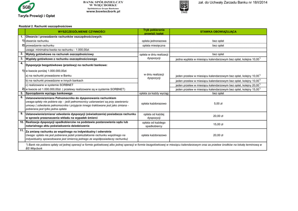 zał. do Uchwały Zarzadu Banku nr 18/I/2014 Taryfa Prowizji i Opłat Rozdział 2. Rachunki oszczędnościowe WYSZCZEGÓLNIENIE CZYNNOŚCI 1. Otwarcie i prowadzenie rachunków oszczędnościowych: 1) otwarcie rachunku 2) prowadzenie rachunku Tryb pobierania prowizji /opłat STAWKA OBOWIĄZUJĄCA opłata jednorazowa bez opłat opłata miesięczna bez opłat opłata w dniu realizacji dyspozycji bez opłat uwaga: minimalna kwota na rachunku - 1.000,00zł. 2. Wpłaty gotówkowe na rachunek oszczędnościowy 3. Wypłaty gotówkowe z rachunku oszczędnościowego 4. Dyspozycje bezgotówkowe (przelewy) na rachunki bankowe: jedna wypłata w miesiącu kalendarzowym bez opłat, kolejna 10,00*) 1) w kwocie poniżej 1.000.000,00zł. a) na rachunki prowadzone w Banku b) na rachunki prowadzone w innych bankach c) realizowane w systemie SORBNET 2) w kwocie od 1.000.000,00zł. ( przelewy realizowane są w systemie SORBNET) 5. Sporządzenie wyciągu bankowego 8. Ustanowienie/zmiana Pełnomocnika do dysponowania rachunkiem uwaga:opłaty nie pobiera się: - jeśli pełnomocnicy ustanawiani są przy zawieraniu umowy ( odwołanie pełnomocnika i przyjęcie innego traktowane jest jako zmiana pobierana jest tylko jedna opłata 9. Ustanowienie/zmiana/ odwołanie dyspozycji (oświadczenia) posiadacza rachunku w sprawie przeznaczenia wkładu na wypadek śmierci 10. Realizacja dyspozycji spadkobierców na podstawie postanowienia sądu lub notarialnego aktu poświadczenia dziedziczenia 11. Za zmianę rachunku ze wspólnego na indywidualny i odwrotnie Uwaga: opłata nie jest pobierana jeżeli przekształcenie rachunku wspólnego na indywidualny spowodowane jest śmiercią jednego ze współposiadaczy rachunku) w dniu realizacji dyspozycji jeden przelew w miesiącu kalendarzowym bez opłat, kolejny 10,00*) jeden przelew w miesiącu kalendarzowym bez opłat, kolejny 10,00*) opłata za każdy wyciąg jeden przelew w miesiącu kalendarzowym bez opłat, kolejny 20,00*) jeden przelew w miesiącu kalendarzowym bez opłat, kolejny 15,00*) bez opłat opłata każdorazowo 5,00 zł opłata od każdej dyspozycji 20,00 zł opłata od każdego spadkobiercy 15,00 zł opłata każdorazowo 20,00 zł *) Bank nie pobiera opłaty od jednej operacji w formie gotówkowej albo jednej operacji w formie bezgotówkowej w miesiącu kalendarzowym oraz za przelew środków na lokatę terminową w BS Więcbork