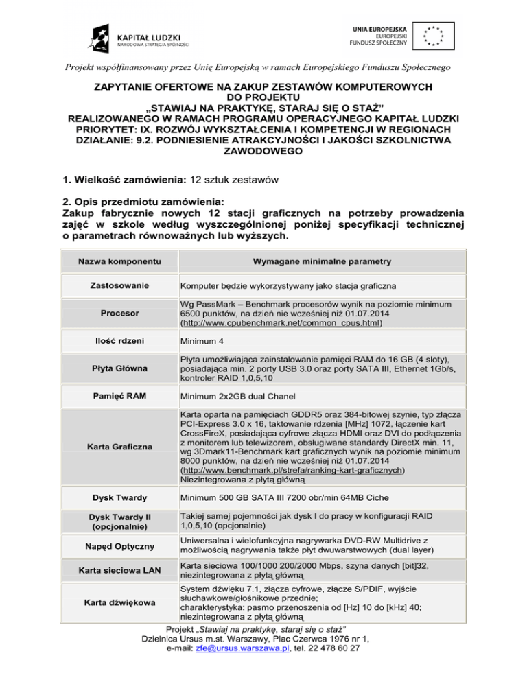 Projekt współfinansowany przez Unię Europejską w ramach Europejskiego Funduszu Społecznego ZAPYTANIE OFERTOWE NA ZAKUP ZESTAWÓW KOMPUTEROWYCH DO PROJEKTU „STAWIAJ NA PRAKTYKĘ, STARAJ SIĘ O STAŻ” REALIZOWANEGO W RAMACH PROGRAMU OPERACYJNEGO KAPITAŁ LUDZKI PRIORYTET: IX. ROZWÓJ WYKSZTAŁCENIA I KOMPETENCJI W REGIONACH DZIAŁANIE: 9.2. PODNIESIENIE ATRAKCYJNOŚCI I JAKOŚCI SZKOLNICTWA ZAWODOWEGO 1. Wielkość zamówienia: 12 sztuk zestawów 2. Opis przedmiotu zamówienia: Zakup fabrycznie nowych 12 stacji graficznych na potrzeby prowadzenia zajęć w szkole według wyszczególnionej poniżej specyfikacji technicznej o parametrach równoważnych lub wyższych. Nazwa komponentu Zastosowanie Wymagane minimalne parametry Komputer będzie wykorzystywany jako stacja graficzna Wg PassMark – Benchmark procesorów wynik na poziomie minimum 6500 punktów, na dzień nie wcześniej niż 01.07.2014 (http://www.cpubenchmark.net/common_cpus.html) Procesor Ilość rdzeni Minimum 4 Płyta Główna Płyta umożliwiająca zainstalowanie pamięci RAM do 16 GB (4 sloty), posiadająca min. 2 porty USB 3.0 oraz porty SATA III, Ethernet 1Gb/s, kontroler RAID 1,0,5,10 Pamięć RAM Minimum 2x2GB dual Chanel Karta Graficzna Dysk Twardy Karta oparta na pamięciach GDDR5 oraz 384-bitowej szynie, typ złącza PCI-Express 3.0 x 16, taktowanie rdzenia [MHz] 1072, łączenie kart CrossFireX, posiadająca cyfrowe złącza HDMI oraz DVI do podłączenia z monitorem lub telewizorem, obsługiwane standardy DirectX min. 11, wg 3Dmark11-Benchmark kart graficznych wynik na poziomie minimum 8000 punktów, na dzień nie wcześniej niż 01.07.2014 (http://www.benchmark.pl/strefa/ranking-kart-graficznych) Niezintegrowana z płytą główną Minimum 500 GB SATA III 7200 obr/min 64MB Ciche Dysk Twardy II (opcjonalnie) Takiej samej pojemności jak dysk I do pracy w konfiguracji RAID 1,0,5,10 (opcjonalnie) Napęd Optyczny Uniwersalna i wielofunkcyjna nagrywarka DVD-RW Multidrive z możliwością nagrywania także płyt dwuwarstwowych (dual layer) Karta sieciowa LAN Karta sieciowa 100/1000 200/2000 Mbps, szyna danych [bit]32, niezintegrowana z płytą główną Karta dźwiękowa System dźwięku 7.1, złącza cyfrowe, złącze S/PDIF, wyjście słuchawkowe/głośnikowe przednie; charakterystyka: pasmo przenoszenia od [Hz] 10 do [kHz] 40; niezintegrowana z płytą główną Projekt „Stawiaj na praktykę, staraj się o staż” Dzielnica Ursus m.st. Warszawy, Plac Czerwca 1976 nr 1, e-mail: [email protected], tel. 22 478 60 27 Projekt współfinansowany przez Unię Europejską w ramach Europejskiego Funduszu Społecznego Stojąca do zamontowania standardowej konfiguracji sprzętowej, z możliwością zamontowania dodatkowych wentylatorów chłodzenia; typu Midi Tower, kompatybilna z płytami głównymi typu Micro ATX oraz ATX Obudowa Minimum 600 wat z certyfikatem minimum 80 PLUS BRONZE, układ PFC aktywny Zasilacz Dodatkowe Dodatkowe chłodzenie dedykowane do procesorów AMD i Intel, sterowniki, instrukcja, kabel zasilający Gwarancja 24 miesiące Door 2 Door, (czas reakcji serwisu) Minimum 21”, matryca LED 1920x1080 przy 60Hz, czas reakcji matrycy max. 5ms, złącza D-SUB/DVI/HDMI, rozmiar plamki max. 0,26 Monitor Akcesoria komputerowe dodatkowe Adaptery bluetooth (12 szt.) i słuchawki bezprzewodowe (12 szt.) Kieszenie do HDD (12 szt.) kompatybilne z dyskami: - rodzaj: kieszeń wewnętrzna 3,5 - interfejs zewnętrzny: USB 3.0 - interfejs wewnętrzny: SATA III Dyski zewnętrzne min. 500 GB (12 szt.) : - typ: magnetyczny - pojemność: min. 500 GB - format: 3,5 cala - prędkość obrotowa: 7200 obr/min - pamięć podręczna: 64 MB - interfejs: SATA III Klawiatura OEM (12 szt.) Mysz (12 szt.) 3. Oferta powinna zawierać – proszę o wypełnienie formularza oferty – Załącznik nr 2 (w programie Word): - opisy przedmiotów, m.in. zawierające szczegóły z opisu przedmiotu zamówienia, - proponowaną cenę netto i brutto. 4. Kryteria wyboru: - cena, - wymagania techniczne zgodne z opisem przedmiotu, - termin realizacji zamówienia. Zapłata za realizację zamówienia będzie uregulowana przelewem na podstawie faktury wystawionej przez Dostawcę w terminie 21 dni od daty wpływu do Kancelarii Dzielnicy Ursus m.st. Warszawy, Plac Czerwca 1976 r. nr 1, 02-495 Warszawa. Uwagi: Dostawa bezpłatna. Prosimy o nie przesyłanie linków do ofert na stronie. „Niniejsze zapytanie ma formę rozeznania rynku i nie stanowi zobowiązania do zawarcia umowy w rozumieniu przepisów ustawy PZP”. Prosimy o składanie ofert drogą elektroniczną na adres e-mail: [email protected] w terminie do 20.10.2014 r. Wszelkich informacji dotyczących przedmiotu zamówienia udziela pan Wiesław Gińko pod nr tel. 22 478 61 62. Projekt „Stawiaj na praktykę, staraj się o staż” Dzielnica Ursus m.st. Warszawy, Plac Czerwca 1976 nr 1, e-mail: [email protected], tel. 22 478 60 27