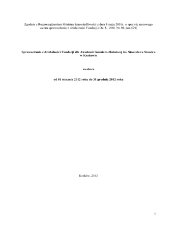 Zgodnie z Rozporządzeniem Ministra Sprawiedliwości z dnia 8 maja 2001r. w sprawie ramowego wzoru sprawozdania z działalności Fundacji (Dz. U. 2001 Nr 50, poz.529) Sprawozdanie z działalności Fundacji dla Akademii Górniczo-Hutniczej im. Stanisława Staszica w Krakowie za okres od 01 stycznia 2012 roku do 31 grudnia 2012 roku Kraków, 2013 1 I. INFORMACJE OGÓLNE 1. Podstawa prawna Ustawa z dnia 6 kwietnia 1984 r. o fundacjach. Rozporządzenie Ministra Sprawiedliwości z dnia 8 maja 2001 roku w sprawie ramowego zakresu sprawozdania z działalności fundacji – Dz. U. Nr 50, poz. 529. 2. Dane o Fundacji 1) Nazwa Fundacji: Fundacja dla Akademii Górniczo-Hutniczej im. Stanisława Staszica w Krakowie. 2) Siedziba: Akademia Górniczo-Hutnicza, Al. Mickiewicza 30, 30-059 Kraków. 3) Data wpisu w KRS: Fundacja została zarejestrowana 16 maja 2007 roku w Sądzie Rejonowym dla Krakowa – Śródmieścia w Krakowie, XI Wydział Gospodarczy Krajowego Rejestru Sądowego pod numerem 0000280790. 4) Statystyczny numer identyfikacyjny w systemie REGON: 120471040. 3. Zarząd Fundacji: Skład Zarządu Fundacji dla Akademii Górniczo-Hutniczej im. Stanisława Staszica w Krakowie: a) Jerzy Kicki – Prezes Zarządu Fundacji Aleja Kijowska 48/2, 30-079 Kraków b) Ryszard Hejmanowski – Wiceprezes Zarządu Fundacji ul. Górników 30, 30-816 Kraków c) Krzysztof Kwaśniewski – Wiceprezes Zarządu Fundacji ul. Jana Pawła II 62, 32-091 Michałowice d) Paweł Bogacz – Członek Zarządu Fundacji ul. Stachiewicza 40/75, 31-328 Kraków e) Kamila Wawrzyniak - Guz – Członek Zarządu Fundacji al. 11 Listopada 28/37; 42-200 Częstochowa. 4. Cele statutowe Fundacji Celem działania Fundacji jest: a) uzyskiwanie pomocy finansowej i rzeczowej, gromadzenia funduszy i rozporządzania nimi na rzecz Akademii Górniczo-Hutniczej im. Stanisława Staszica w Krakowie zwanej dalej AGH, w szczególności służących jej rozwojowi, b) podejmowanie działań na rzecz poprawy warunków studiowania oraz wspomagania przedsięwzięć dydaktycznych w AGH, c) wspieranie studentów, w tym studentów obcokrajowców, d) wspomaganie rozwoju przedsiębiorczości i innowacyjności w AGH, e) wspomaganie działań promujących AGH w kraju i zagranicą, 2 f) działalność na rzecz organizacji, których celami statutowymi jest działalność naukowa, oświatowa, kulturalna, w zakresie kultury fizycznej i sportu, ochrony środowiska, dobroczynności, ochrony zdrowia i pomocy społecznej. II. ZASADY I FORMY PROWADZENIA DZIAŁALNOŚCI STATUTOWEJ FUNDACJI Fundacja dla Akademii Górniczo-Hutniczej im. Stanisława Staszica jako instytucja powołana do wspierania Akademii, zgodnie z postanowieniami Statutu Fundacji, realizuje swe działania poprzez: organizowanie działań mających na celu transfer technologii i nowych rozwiązań technicznych do jednostek gospodarczych, promowanie wyników badań własnych oraz wyników badań prowadzonych w Uczelni i innych placówkach naukowo-badawczych krajowych i zagranicznych za pośrednictwem Internetu oraz innych środków przekazu, organizowanie wykładów oraz innych spotkań edukacyjnych i szkoleniowych, organizowanie i finansowanie pobytu wybitnym naukowcom w celu prowadzenia wykładów i badań naukowych, pomoc rzeczową i finansową na rzecz środowiska studenckiego, organizowanie i współorganizowanie oraz finansowanie kongresów, konferencji i seminariów. Fundacja dla AGH prowadzi również działalność na rzecz osób upośledzonych przez los, chorych, wymagających szczególnej opieki ze względu na stan zdrowia bądź wiek. Fundacja wspiera więc wszelkie wnioski i inicjatywy charytatywne w miarę swoich możliwości finansowych. W 2011 roku realizowane były następujące działania statutowe: 1. Patronat nad Szkołą Podstawową im. Stanisława Staszica w Nietulisku Dużym Patronat Fundacji nad Szkołą Podstawową im. Stanisława Staszica w Nietulisku Dużym dotyczył w 2012 r. szeregu działań. Fundacja pomaga tworzyć coraz to nowe możliwości rozwoju dla dzieci, co przynosi wymierne efekty. Uczniowie szkoły są laureatami wielu konkursów na szczeblu regionalnym i wojewódzkim. Mają wybitne osiągnięcia w nauce i w sporcie. Fundacja brała udział w zakończeniu roku szkolnego 2011/2012, gdzie nagrodzono wkład tych uczniów, którzy swoją całoroczną pracą osiągnęli największe sukcesy. Jak każdego roku w okresie świąteczno-noworocznym wręczono dzieciom paczki mikołajowe. 2. Wspieranie działalności drużyny Wisła - AGH Finansowanie drużyny siatkarskiej kobiet AGH Galeco Wisła Kraków należy od czterech lat do sfery działań statutowych Fundacji dla AGH. Wsparcie tej ekipy związało się z zaangażowaniem się samej AGH w budowę żeńskiej, akademickiej drużyny sportowej. Zamysłem tego projektu stało się przedłużenie bogatych tradycji klubu sportowego TS Wisła Kraków w zakresie tak popularnej w ostatnim czasie dyscypliny sportowej, jaką jest siatkówka oraz wspomaganie AGH jako propagatora sportu akademickiego w Krakowie, w tym przede wszystkim w bezpośredniej 3 bliskości Miasteczka Studenckiego AGH. Szczególną przesłanką dla wsparcia drużyny AGH Galeco Wisła stał się również fakt, że gra w niej aż dziesięć studentek Akademii GórniczoHutniczej. Wobec pomocy socjalnej dla zawodniczek ze strony AGH, udostępnienia do treningów i meczów przez TS Wisła swojej Głównej Hali Sportowej oraz sponsoringu obozów sportowych i wyjazdów meczowych przez przedsiębiorstwo Galeco, głównym zamierzeniem Fundacji dla AGH w roku 2012 stał się zakup sprzętu sportowego, niezbędnego do prowadzenia zajęć szkoleniowych i meczów ligowych, zakup odżywek wysokobiałkowych i produktów farmaceutycznych, pomocnych w regeneracji biologicznej i pourazowej zawodniczek oraz zakup gadżetów związanych z AGH do konkursów prowadzonych dla publiczności w trakcie meczów. W związku z powyższym z funduszy Fundacji dla AGH zakupiono w roku 2012 i 