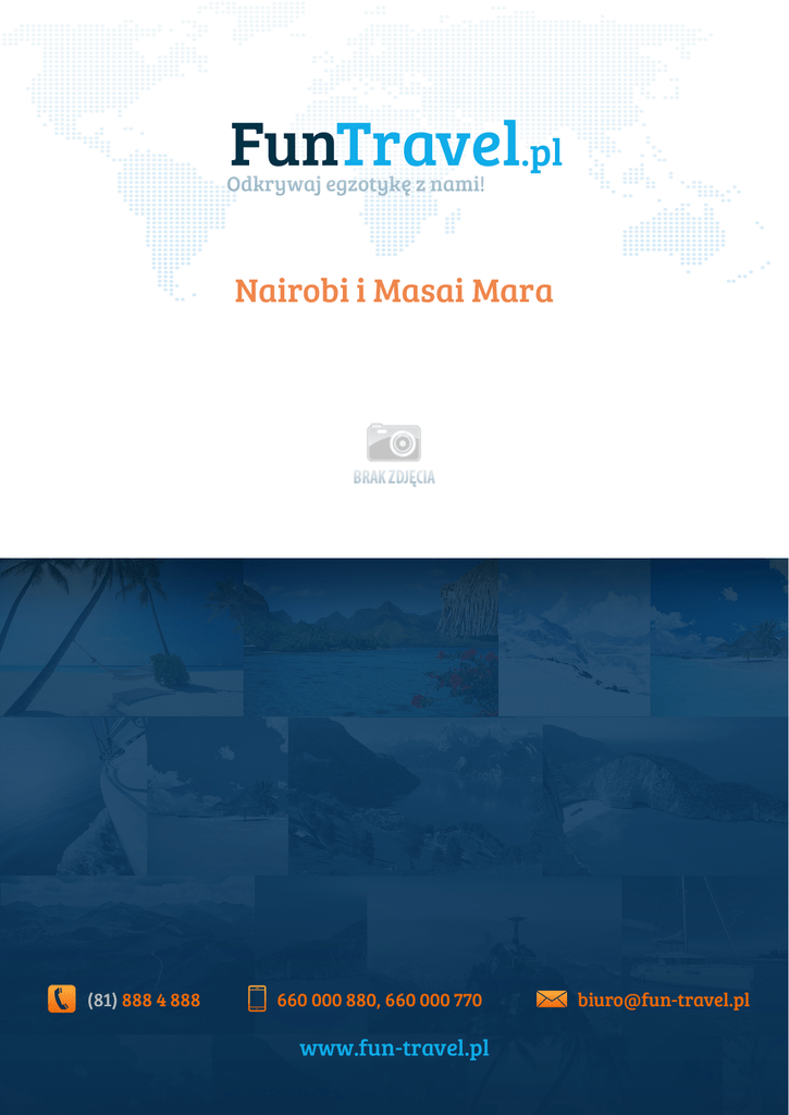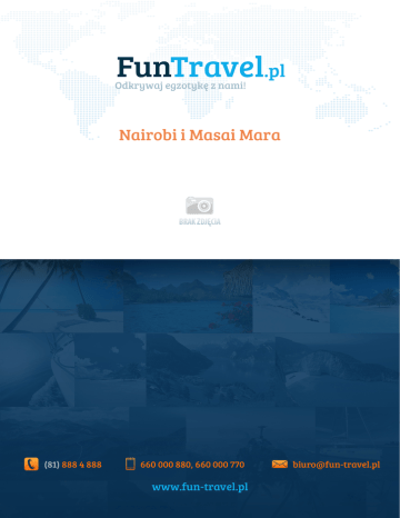 Nairobi i Masai Mara Opis ■ ■ ■ Cena od: 5000 PLN Liczba dni: 7 dni Kraj: Kenia Nairobi stolica Kenii, zurbanizowana, tłoczna i pełna odgłosów miasta. Miejsce, którym została uchwalona Afrykańska Karta Praw Człowieka. Jedna z czterech głównych siedzib ONZ. Miasto, które ciągle się rozrasta i ewoluuje. Mimo dzikiego otoczenia afrykańskiej przyrody doskonale rozwija się tu przemysł spożywczy, chemiczny, włókienniczy. Posiada połączenie kolejowe z Mombasą i Kampalą. Wart zobaczenia jest min. Park Narodowy Nairobi. Będziemy mieć także okazję aby przejechać się matatu - czyli miejscową taksówką, a właściwie mikrobusem, pomalowanym w fantazyjne wzory. Masai Mara - Przeciwieństwo swojej poprzedniczki. To co chwyci nas za serce w tym miejscu to Park Narodowy Serengeti. Jeśli wybierzemy się tutaj w lipcu bądź sierpniu zobaczymy niezwykle rzadki widok, jakim jest wielka migracja stad antylop gnu i zebr. Znajduje się tutaj tajemnicza Wielka Piątka czyli pięć gatunków wielkich ssaków - uważane są za najniebezpieczniejsze zwierzęta na tym kontynencie. Masai Mara to prawdziwy rarytas dla fanów dzikich zwierząt, znajduje się tutaj ponad 3000 słoni, wiele lwów, lampartów, gepardów, a nawet zagrożone wymarciem czarne nosorożce. Na tych terenach mieszkają słynni Masajowie, będziemy mogli ich zobaczyć podczas wypasania bydła. Program Dzień 1 - Witaj Afryko Tego dnia czeka nas zbiórka na lotnisku, odprawa bagażowa oraz wylot do Nairobi. Dzień 2 Rowerem przez Kenię Naszą przygodę z Afryką zaczynamy dość intensywnie, bo od wycieczki rowerowej. Dlatego też najlepiej zjeść porządne śniadanie jakie zaserwuje nam kuchnia hotelowa. Pierwszym miejscem do którego się udamy to Muzeum Narodowe Kenii. Na miejscu zapoznamy się z licznymi eksponatami pochodzących z początków rodzaju ludzkiego. Obiad zjemy w małej knajpce, gdzie zostaniemy poczęstowani wyśmienitą tutejsza kuchnią. Popołudnie dostarczy nam równie estetycznych przeżyć, co poranek. Udamy się do przepięknego apartamentu jakim jest dom Karen Blixen. Brzmi znajomo? Tak, to autorka słynnej powieści "Pożegnanie z Afryką". Dalej przejedziemy na rowerach do sierocińca dla młodych słoniątek. Pracownicy tej placówki oprowadzą nas oraz opowiedzą o tym jak troszczą się o te wspaniałe i niezwykle wrażliwe zwierzęta. Kolejnym etapem podróży będzie skansen Bomas, a w nim chaty plemion żyjących na terenie Kenii. Na noc wrócimy do hotelu, zjemy solidną kolację i wyruszymy na afrykańską noc zorganizowaną przez hotel. Dzień 3 - Masai Mara Trzeci dzień naszej wycieczki to podróż do Parku Narodowego Masai Mara. To w tym miejscu mamy możliwość podziwiać iście afrykańską florę i faunę. Dzikie zwierzęta i wspaniała niecodzienna przyroda. Wspomniana już Wielka Piątka zwierząt. Obiad zjemy przy Wielkim Rowie Afrykańskim - takich miejsc jest w Afryce znacznie więcej, powstają one w wyniku wyniku ruchów tektonicznych płyt arabskiej i somalijskiej. Dna Wielkich Rowów w mniejszej części mogą być zalane wodą. Kolacja czeka nas przy ognisku w obozie. Czas umilą nam opowiadania przewodników o legendarnych Masajach. Dzień 4 Rowerowe safari Śniadanie zjemy wczesną porą i ruszamy na rowerach przez dziką przyrodę, fascynujące serengeti, mijać będziemy dzikie zwierzęta, lwy, zebry. Obiad zjemy w przerwie naszej wyprawy. Natomiast na kolację zapraszamy do pobliskiej wioski, tam posmakujemy w prawdziwej afrykańskiej kuchni. Na koniec dnia czeka nas popis tańca tutejszych mieszkańców. Nogi same będą nam się rwały do zabawy. Dzień 5 Nakuru Rankiem po śniadaniu wyruszamy autami 4x4 w kierunku krawędzi Wielkiego Rowu Afrykańskiego. Przepiękna i malownicza okolica doprowadzi nas aż do jeziora Nakuru. Tutaj już czekają na nas głośne i tłumnie oblegające wodę flamingi . Dalej udamy się do wodospadu Makalu i do lasu wilczomleczy. Są to ogromne rośliny, wyglądem przypominające kaktusy. Warto utrwalić je na zdjęciach, ponieważ widok jest bardzo surrealistyczny. Obiad zjemy w obozie, po czym wyruszymy na podglądanie dzikiej przyrody. Dzień 6 Wodospad Makalu Dzień 7 - Żegnaj przygodo Po pożywnym śniadaniu czeka nas orzeźwiający i nieokiełznany wodospad Makalu. Dowiemy się jak powstał i jak bardzo jest ważny dla tutejszej biosfery. Będziemy mogli oczywiście ochłodzić się w jego głębinach. Na obiad wyruszymy do najbliższej wioski. Po raz ostatni zobaczymy jak żyją ludzie w tak odległym od cywilizacji miejscu. Po południe to rajd rowerowy. Prawdziwa gratka dla fanów tego sportu. Podzielimy się na kilka małych grup i sprawdzimy kto będzie najwytrwalszym i najszybszym członkiem naszej wyprawy. Po śniadaniu wyruszamy do Nairobi. Stamtąd odlecimy do Warszawy. Galeria