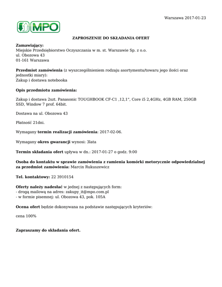 Warszawa 2017-01-23 ZAPROSZENIE DO SKŁADANIA OFERT Zamawiający: Miejskie Przedsiębiorstwo Oczyszczania w m. st. Warszawie Sp. z o.o. ul. Obozowa 43 01-161 Warszawa Przedmiot zamówienia (z wyszczególnieniem rodzaju asortymentu/towaru jego ilości oraz jednostki miary): Zakup i dostawa notebooka Opis przedmiotu zamówienia: Zakup i dostawa 2szt. Panasonic TOUGHBOOK CF-C1 ,12,1", Core i5 2,4GHz, 4GB RAM, 250GB SSD, Window 7 prof. 64bit. Dostawa na ul. Obozowa 43 Płatność 21dni. Wymagany termin realizacji zamówienia: 2017-02-06. Wymagany okres gwarancji wynosi: 3lata Termin składania ofert upływa w dn.: 2017-01-27 o godz. 9:00 Osoba do kontaktu w sprawie zamówienia z ramienia komórki metorycznie odpowiedzialnej za przedmiot zamówienia: Marcin Rukuszewicz Tel. kontaktowy: 22 3910154 Oferty należy nadesłać w jednej z następujących form: - drogą mailową na adres: [email protected] - w formie pisemnej: ul. Obozowa 43, pok. 105A Ocena ofert będzie dokonywana na podstawie następujących kryteriów: cena 100% Zapraszamy do składania ofert.
