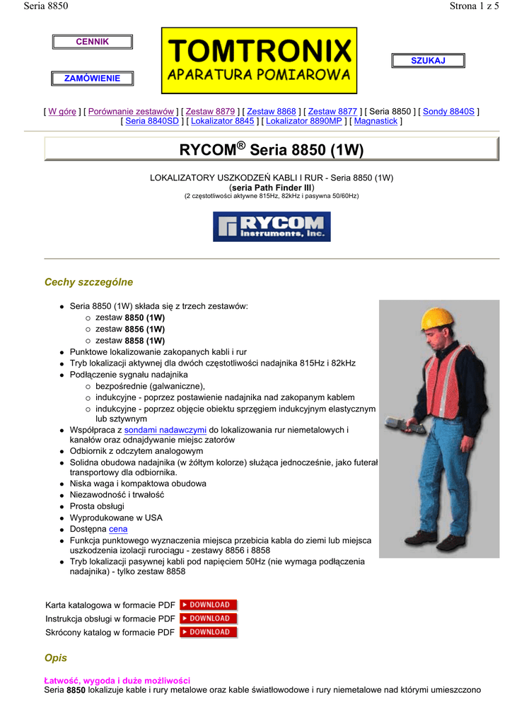 Seria 8850 Strona 1 z 5 CENNIK SZUKAJ ZAMÓWIENIE [ W górę ] [ Porównanie zestawów ] [ Zestaw 8879 ] [ Zestaw 8868 ] [ Zestaw 8877 ] [ Seria 8850 ] [ Sondy 8840S ] [ Seria 8840SD ] [ Lokalizator 8845 ] [ Lokalizator 8890MP ] [ Magnastick ] RYCOM® Seria 8850 (1W) LOKALIZATORY USZKODZEŃ KABLI I RUR - Seria 8850 (1W) (seria Path Finder III) (2 częstotliwości aktywne 815Hz, 82kHz i pasywna 50/60Hz) Cechy szczególne ! ! ! ! ! ! ! ! ! ! ! ! ! ! Seria 8850 (1W) składa się z trzech zestawów: " zestaw 8850 (1W) " zestaw 8856 (1W) " zestaw 8858 (1W) Punktowe lokalizowanie zakopanych kabli i rur Tryb lokalizacji aktywnej dla dwóch częstotliwości nadajnika 815Hz i 82kHz Podłączenie sygnału nadajnika " bezpośrednie (galwaniczne), " indukcyjne - poprzez postawienie nadajnika nad zakopanym kablem " indukcyjne - poprzez objęcie obiektu sprzęgiem indukcyjnym elastycznym lub sztywnym Współpraca z sondami nadawczymi do lokalizowania rur niemetalowych i kanałów oraz odnajdywanie miejsc zatorów Odbiornik z odczytem analogowym Solidna obudowa nadajnika (w żółtym kolorze) służąca jednocześnie, jako futerał transportowy dla odbiornika. Niska waga i kompaktowa obudowa Niezawodność i trwałość Prosta obsługi Wyprodukowane w USA Dostępna cena Funkcja punktowego wyznaczenia miejsca przebicia kabla do ziemi lub miejsca uszkodzenia izolacji rurociągu - zestawy 8856 i 8858 Tryb lokalizacji pasywnej kabli pod napięciem 50Hz (nie wymaga podłączenia nadajnika) - tylko zestaw 8858 Karta katalogowa w formacie PDF Instrukcja obsługi w formacie PDF Skrócony katalog w formacie PDF Opis Łatwość, wygoda i duże możliwości Seria 8850 lokalizuje kable i rury metalowe oraz kable światłowodowe i rury niemetalowe nad którymi umieszczono Seria 8850 Strona 2 z 5 taśmy sygnalizacyjne. W trybie aktywnym odbiornik zestawu wykrywa częstotliwości nadajnika 815Hz lub 82kHz, natomiast w trybie pasywnym zestaw 8858 potrafi trasować kable będące pod napięciem sieciowym 50Hz i nie wymaga wtedy podłączenia nadajnika. Sygnał nadajnika serii 8850 może być sprzęgany z lokalizowanym obiektem na trzy sposoby: ! ! ! Podłączenie bezpośrednie (galwaniczne) Indukcyjne - poprzez postawienie nadajnika nad zakopanym kablem Indukcyjne - poprzez objęcie obiektu sprzęgiem indukcyjnym elastycznym lub sztywnym Operator może odczytywać siłę sygnału wykrywanego przez odbiornik na wskaźniku wychyłowym. Siłę sygnału może ocenić również poprzez poprzez modulowany sygnał akustyczny. W zależności od wersji zestawu, odbiornik może działać w trybie piku i/lub doliny pola satysfakcjonując preferencje użytkownika. Możliwe jest ręczne wyznaczenie głębokości zakopania lokalizowanego obiektu, w tym celu należy wykonać trzy pomiary stosując tzw. metodą triangulacyjną. Odbiornik posiada szeroki, 126dB, zakres regulacji wzmocnienia. Na wyposażeniu zestawu znajduje się kaseta wideo z filmem szkoleniowym. Model 8850 Pik Pik Funkcja Lokalizowanie lub oraz lokalizowania pasywne dolina dolina uszkodzenia 50/60Hz • 8856 • • 8858 • • • Funkcjonalne akcesoria opcjonalne Przy współpracy z sondą powrotną uziemienia zestawy 8856 i 8858 potrafią punktowo wyznaczyć miejsce przebicia kabla do ziemi lub miejsce uszkodzenia izolacji rurociągu. Opcjonalne sondy nadawcze po wprowadzeniu do rur niemetalowych lub kanałów umożliwiają ich trasowanie, jak również odnajdywanie miejsc zatorów. Seria wyróżnia się niewielką wagą i wymiarami, posiada wodoszczelną obudowę oraz może pracować w temperaturze otoczenia od –20°C do 55°C. Seria 8850 oferuje doskonałe możliwości przy niezwykle atrakcyjnej cenie. Widok zestawu 8850 Akcesoria Lokalizator uszkodzeń Sonda uziemienia zwrotnego (tzw. A-ramka) podłączona do odbiornika - do punktowego wyznaczania miejsca uszkodzenia. Dla wygody, w czasie transportu, A-ramka jest składana. Seria 8850 Strona 3 z 5 A-ramka A-ramka jest składana Sprzęgi indukcyjne - elastyczny i sztywny Cęgi do indukcyjnego sprzęgania sygnału nadajnika w sytuacjach, gdzie bezpośrednie (galwaniczne) podłączenie nie jest możliwe. Sprzęgi indukcyjne elastyczny i sztywny Sondy nadawcze Nadajniki do lokalizacji żeliwnych, niemetalowych rur i kanałów. Sondy standardowa i kanałowa Dane techniczne Nadajnik ! Częstotliwości: " wysoka - 82,315kHz, " niska - 815Hz Seria 8850 ! ! ! ! ! ! ! ! Strona 4 z 5 Podłączenie nadajnika: " bezpośrednie, " sprzężenie indukcyjne nadajnika, " elastyczny i sztywny sprzęgacz indukcyjny Moc wyjściowa: Moc wyjściowa Normalna Wysoka 815Hz (AF) 0,5W 1,0W 82,315kHz (RF) 0,5W 1,0W Maksymalne napięcie rozwarcia: 30Vpp AC Temperatura pracy: -20°C do +55°C Źródło napięcia: 8 sztuk baterii typ "D" Czas życia baterii: około 36 godzin Wymiary obudowy nadajnika: 43x19x16cm Waga: 2,8kg Odbiornik ! ! ! ! ! ! ! ! ! ! ! ! Częstotliwości pracy: " 82,315kHz, " 815Hz " 50/60Hz (tylko zestaw 8858) Tryb anteny (patrz tabelka): " pik fali - odpowiada cewce pionowej " dolina fali - odpowiada cewce poziomej Wskaźnik: analogowy, wskazanie piku lub doliny fali Sygnalizacja dźwiękowa: odpowiedź zmienną wysokością tonu Zasilanie: 8 baterii typ "AA" Czas życia baterii: powyżej 80 godzin Kontrola wzmocnienia: minimum 126dB Odporność na szum: minimum 116dB Pomiar głębokości: ręcznie metodą triangulacyjną. Temperatura pracy: -20°C do +55°C Wymiary: 33x7,6x7,6cm Waga: 0,77kg Informacje dla zamawiających Nazwa Nr kat. Zestaw 8850 (z odbiornikiem doliny fali) 001-00205-00 Zestaw 8850 (z odbiornikiem piku fali) 001-00205-01 Zestaw 8856 001-00205-02 Zestaw 8858 001-00205-03 Akcesoria na wyposażeniu zestawu 8850 Nadajnik - Odbiornik doliny fali (dla zestawu 001-00205-00) 001-00105-01 Odbiornik piku fali (dla zestawu 001-00205-01) 001-00105-04 Czerwono/czarny przewód z małymi zaciskami 151-00051-00 Sonda uziemienia 211-00006-01 Instrukcja obsługi 030-00048-00 Kaseta wideo z filmem szkoleniowym 035-0000
