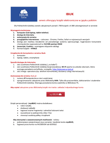 IBUK serwis oferujący książki elektroniczne w języku polskim Dla Politechniki Łódzkiej zostało zakupionych ponad 1 700 książek z 6 300 udostępnianych w serwisie Wymagania techniczne: 1. komputer (lub laptop, tablet telefon) 2. dostęp do Internetu 3. autoryzacja do serwisu 4. przeglądarka internetowa – zalecane: Chrome, Firefox, Safari w najnowszych wersjach 5. dostęp jest możliwy niezależnie od posiadanego systemu operacyjnego. Sugerowane korzystanie z komputerów wyposażonych w 512 MB pamięci RAM 6. Javascript, Cookies – wymagane włączenie obsługi 7. format książek – HTML5 Urządzenia do korzystania z serwisu ibuk: 1. komputer 2. laptop, tablet, smartphone Sposób dostępu do Internetu: 1. sied uczelniana Politechniki Łódzkiej („na kabel”) 2. sied uczelniana Politechniki Łódzkiej bezprzewodowa, Wi-Fi oparta na usłudze eduroam, która wymaga posiadania certyfikatu, szczegóły: http://eduroam.p.lodz.pl 3. sied innego operatora (np. telefonii komórkowej, dostawcy usług internetowych) Autoryzacja do serwisu ibuk.pl: 1. numery IP komputerów w sieci uczelnianej 2. oprogramowanie zakupione przez Bibliotekę HAN. Tylko dla pracowników, doktorantów i studentów Politechniki Łódzkiej. Wymaga posiadania konta czytelnika w Bibliotece PŁ. Aby czytad zakupione przez Bibliotekę książki nie trzeba zakładad indywidualnego konta Dzięki personalizacji (myIBUK) można dodatkowo: robid notatki, dodawad zakładki tagowad ważne fragmenty i zakreślad kolorami tekst wyszukiwad w podręczniku słów i fraz stworzyd osobistą półkę z książkami Aby skorzystad z zaawansowanych możliwości należy: a. jednorazowo zarejestrowad się w serwisie (osobiste konto myIBUK), b. logowad przez konto na FACEBOOK lub GOOGLE Jak korzystad z serwisu IBUK Przypadek 1 Komputer wpięty do sieci Politechniki Łódzkiej Biblioteka Główna i biblioteki filialne, wydziały, pracownie komputerowe, akademiki Serwis automatycznie autoryzuje użytkownika po numerach IP, należy skorzystad z adresu http://libra.ibuk.pl/ Przypadek 2 Komputer w domu Wymagana jest autoryzacja w serwisie za pośrednictwem programu HAN, należy skorzystad z adresu http://212.51.210.219/han/ibuk Przypadek 3 Laptop, tablet, smartphone na terenie Politechniki Łódzkiej z dostępem do Internetu za pośrednictwem sieci bezprzewodowej Wi-Fi Serwis automatycznie autoryzuje użytkownika po numerach IP, należy skorzystad z adresu http://libra.ibuk.pl/ Przypadek 4 Laptop, tablet, smartphone na terenie Politechniki Łódzkiej z dostępem do Internetu za pośrednictwem innego operatora (np. telefonii komórkowej) Wymagana jest autoryzacja w serwisie za pośrednictwem programu HAN, należy skorzystad z adresu http://212.51.210.219/han/ibuk Przypadek 5 Laptop, tablet, smartphone w domu Wymagana jest autoryzacja w serwisie za pośrednictwem programu HAN, należy skorzystad z adresu http://212.51.210.219/han/ibuk Adresy dodatkowe: http://www.ibuk.pl/pomoc.html na stronie zamieszczona jest informacja o korzystaniu z serwisu na urządzeniach działających pod kontrolą systemu Android. Aby skorzystad z aplikacji nadal wymagana jest autoryzacja w serwisie wg numerów IP czyli korzystanie z urządzeo na terenie Politechniki Łódzkiej za pośrednictwem sieci bezprzewodowej Wi-Fi Biblioteka Politechniki Łódzkiej Październik 2013