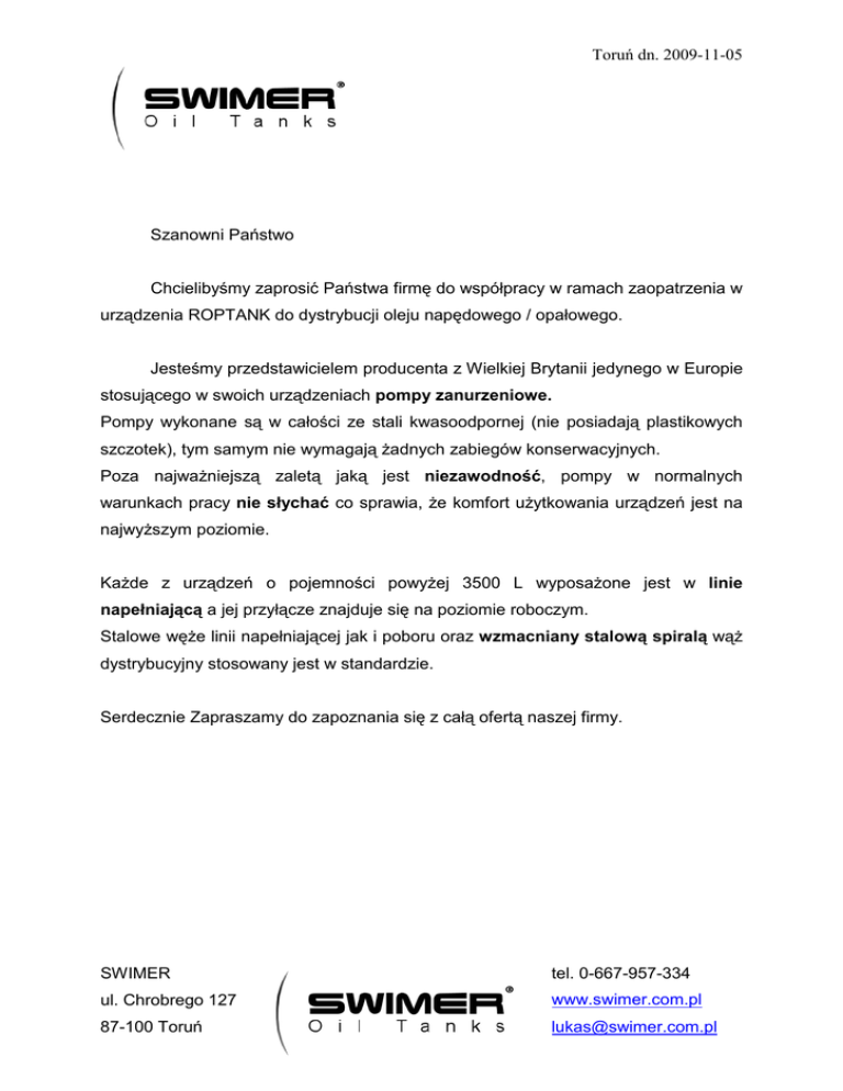 Toruń dn. 2009-11-05 Szanowni Państwo Chcielibyśmy zaprosić Państwa firmę do współpracy w ramach zaopatrzenia w urządzenia ROPTANK do dystrybucji oleju napędowego / opałowego. Jesteśmy przedstawicielem producenta z Wielkiej Brytanii jedynego w Europie stosującego w swoich urządzeniach pompy zanurzeniowe. Pompy wykonane są w całości ze stali kwasoodpornej (nie posiadają plastikowych szczotek), tym samym nie wymagają Ŝadnych zabiegów konserwacyjnych. Poza najwaŜniejszą zaletą jaką jest niezawodność, pompy w normalnych warunkach pracy nie słychać co sprawia, Ŝe komfort uŜytkowania urządzeń jest na najwyŜszym poziomie. KaŜde z urządzeń o pojemności powyŜej 3500 L wyposaŜone jest w linie napełniającą a jej przyłącze znajduje się na poziomie roboczym. Stalowe węŜe linii napełniającej jak i poboru oraz wzmacniany stalową spiralą wąŜ dystrybucyjny stosowany jest w standardzie. Serdecznie Zapraszamy do zapoznania się z całą ofertą naszej firmy. SWIMER tel. 0-667-957-334 ul. Chrobrego 127 www.swimer.com.pl 87-100 Toruń [email protected] Toruń dn. 2009-11-05 CENNIK URZĄDZEŃ ROPTANK ROPTANK pojemność Symbol Cena netto pln 1350 RT1350-SE 7200 1400 RT1400-SE 7200 2500 RT2500-SE 10500 3500 RT3500-WS 13600 3500 RT3500-MC 18600 6000 RT6000-WS 16600 6000 RT6000-MC 21600 10000 RT10000-WS 24600 10000 RT10000-MC 29600 15000 RT15000-WS 31500 15000 RT15000-MC 36500 Ceny netto, nie zawierają kosztów transportu. Opcje wyposaŜenia: SE - pompa zanurzeniowa elektryczna 230V, filtr paliwa, cyfrowy przepływomierz, 6 m wąŜ dystrybucyjny wzmacniany spiralą stalową, automatyczny pistolet, wskaźnik poziomu medium Watchman, odpowietrzniki, 2” króciec wlewowy WS - SE + system alarmowy przepełnienia i przecieku, zawór zapobiegający przepełnieniu zbiornika, linia napełniająca zakończona 2” króćcem MC - WS + panel zarządzający MC BOX ( do 120 uŜytkowników ), 10 kluczy uŜytkowników, klucz managera, oprogramowanie PC, interfejs do zgrywania danych na PC SWIMER tel. 0-667-957-334 ul. Chrobrego 127 www.swimer.com.pl 87-100 Toruń [email protected]