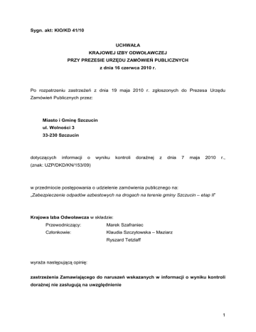Sygn. akt: KIO/KD 41/10 UCHWAŁA KRAJOWEJ IZBY ODWOŁAWCZEJ PRZY PREZESIE URZĘDU ZAMÓWIEŃ PUBLICZNYCH z dnia 16 czerwca 2010 r. Po rozpatrzeniu zastrzeŜeń z dnia 19 maja 2010 r. zgłoszonych do Prezesa Urzędu Zamówień Publicznych przez: Miasto i Gminę Szczucin ul. Wolności 3 33-230 Szczucin dotyczących informacji o wyniku kontroli doraźnej z dnia 7 maja 2010 r., (znak: UZP/DKD/KN/153/09) w przedmiocie postępowania o udzielenie zamówienia publicznego na: „Zabezpieczenie odpadów azbestowych na drogach na terenie gminy Szczucin – etap II” Krajowa Izba Odwoławcza w składzie: Przewodniczący: Marek Szafraniec Członkowie: Klaudia Szczytowska – Maziarz Ryszard Tetzlaff wyraŜa następującą opinię: zastrzeŜenia Zamawiającego do naruszeń wskazanych w informacji o wyniku kontroli doraźnej nie zasługują na uwzględnienie 1 Uzasadnienie Zamawiający – Miasto i Gmina Szczucin - działając na podstawie przepisów ustawy z dnia 29 stycznia 2004 r. Prawo zamówień publicznych (Dz. U. t.j. z 2007 r. Nr 223, poz. 1655 ze zm.), zwanej dalej „ustawą Pzp”, przeprowadził postępowanie o udzielenie zamówienia publicznego na „Zabezpieczenie odpadów azbestowych na drogach na terenie gminy Szczucin – etap II”. Prezes Urzędu Zamówień Publicznych przeprowadził kontrolę doraźną tego postępowania (znak: UZP/DKD/KN/153/09) stwierdzając, Ŝe Zamawiający przy udzielaniu zamówienia: 1) poprzez przeprowadzenie procedury uzupełnienia oferty w zakresie zestawienia cen robocizny, materiałów i sprzętu stanowiących element treści oferty dopuścił się naruszenia art. 26 ust. 3, art. 87 ust. 1 oraz art. 89 ust. 1 pkt 2 ustawy Pzp 2) poprzez Ŝądanie przedłoŜenia wraz z ofertą sprawozdania finansowego, a jeŜeli podlegałoby ono badaniu przez biegłego rewidenta zgodnie z przepisami o rachunkowości, przedłoŜenia go wraz z opinią o badanym sprawozdaniu, a w przypadku wykonawców niezobowiązanych do sporządzania sprawozdania finansowego – przedłoŜenia innych dokumentów określających obroty oraz zobowiązania i naleŜności na potwierdzenie, iŜ Wykonawca spełnia warunek dotyczący posiadania środków finansowych lub zdolności kredytowej, dopuścił się naruszenia art. 25 ust. 1 ustawy Pzp; W związku ze stwierdzonymi naruszeniami, określonymi w ustaleniach kontrolnych, Prezes Urzędu Zamówień Publicznych wraz z pismem z dnia 7 maja 2010 r. (znak: UZP/DKD/PB/29337/3434/10), przekazał je Zamawiającemu, wskazując na moŜliwość zgłoszenia zastrzeŜeń do wyników kontroli. Pismem z dnia 18 maja 2010 r. (wpływ do Prezesa UZP faksem w dniu 19 maja 2010 r., zaś na piśmie w dniu 25 maja 2010 r.) Zamawiający zgłosił zastrzeŜenia do informacji o wyniku kontroli doraźnej. Zamawiający zawarł w powołanym piśmie oświadczenie, iŜ nie ulega wątpliwości, Ŝe popełnił on błąd i nie kwestionuje on tego faktu. Wskazał równieŜ, Ŝe poniósł on juŜ konsekwencje tegoŜ błędu, tytułem przykładu wskazując koszty postępowania przed Krajową Izbą Odwoławczą, którymi został obciąŜony. 2 Zamawiający podnosił, iŜ niezaleŜnie od stwierdzonych w postępowaniu błędów w dochowaniu przez Zamawiającego wymogów postępowania, oceniać naleŜy prawidłowość czynności podpisania przez Zamawiającego umowy w sprawie realizacji przedmiotu zamówienia objętego ww. postępowaniem. Wskazywał, iŜ umowa ta została zawarta po uzyskaniu przez Zamawiającego zgody Prezesa Urzędu Zamówień Publicznych na jej zawarcie przed ostatecznym rozstrzygnięciem protestu wydanej w dniu 31 października 2008 r. w formie decyzji administracyjnej. Wyjaśniał on, Ŝe nie ośmieliłby się nigdy podpisać takiej umowy bez wcześniejszego uzyskania decyzji Prezesa UZP, ani teŜ w przypadku, gdyby wcześniej zapadło odpowiednie rozstrzygnięcie KIO w przedmiotowej sprawie. W ocenie Zamawiającego słuszność jego postępowania potwierdziły późniejsze postanowienie KIO z dnia 29 stycznia 2010 r. (sygn. akt KIO/UZP 77/09) oraz wyrok Sądu Okręgowego w Tarnowie z dnia 17 marca 2010 r. (sygn. akt VGa 20/09). W oparciu o tak zestawione fakty, Zamawiający argumentował, Ŝe stwierdzone przez Prezesa UZP w trakcie kontroli doraźnej naruszenia przez niego przepisów ustawy Pzp oddzielić naleŜy od faktu udzielenia przez niego zamówienia, tj. zawarcia umowy w sprawie przedmiotowego zamówienia. Wskazywał, iŜ nieuprawnione i krzywdzące dla niego jest twierdzenie Prezesa UZP wyraŜone w informacji o wyniku kontroli doraźnej, Ŝe stwierdzone naruszenia miały wpływ na wynik postępowania o udzielenie zamówienia. Szczególnie wobec faktu, iŜ z samej treści art. 182 ust. 3 ustawy Pzp wynika, Ŝe Zamawiający miał prawo zawrzeć umowę w sprawie udzielenia zamówienia jeśli tylko zostały spełnione przesłanki określone w tym przepisie, i to bez konieczności uwzględniania jakichkolwiek innych uwarunkowań, w tym wynikających z prowadzonego równocześnie postępowania protestacyjno-odwoławczego i wyroku KIO. Jako potwierdzenie słuszności swojej argumentacji Zamawiający wskazał na cytat uzasadnienia powołanego wyŜej wyroku Sądu Okręgowego w Tarnowie, w którym sąd stwierdził, iŜ „postępowanie prowadzone przez Prezesa UZP, choć stanowi wyjątek od zasady przewidzianej w art. 182 ust. 1 ustawy Pzp, jest postępowaniem prowadzonym na podstawie przepisów tej ustawy i tym samym zawarcie umowy przez Zamawiającego przed ostatecznym rozstrzygnięciem protestu, na podstawie zgody wyraŜonej przez Prezesa UZP, nie moŜe być uznane za nieprawidłowe.” W odpowiedzi na zgłoszone zastrzeŜenia pismem z dnia 2 czerwca 2010 r. (znak: UZP/DKD/PB/27252/11187/10), Prezes Urzędu Zamówień Publicznych zastrzeŜeń nie uwzględnił, przekazując je, na podstawie art. 167 ust. 2 ustawy Pzp, do zaopiniowania przez Krajową Izbę Odwoławczą. Prezes UZP wyjaśnił, iŜ wyraŜając zgodę na podpisanie przez Zamawiającego umowy w sp