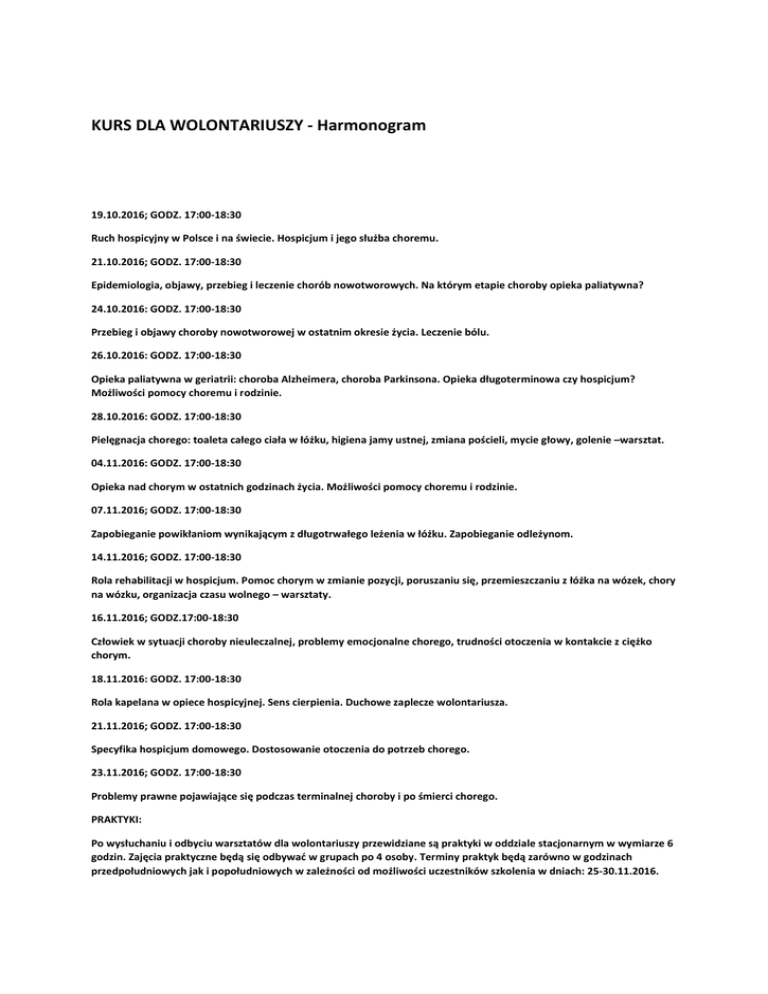KURS DLA WOLONTARIUSZY - Harmonogram 19.10.2016; GODZ. 17:00-18:30 Ruch hospicyjny w Polsce i na świecie. Hospicjum i jego służba choremu. 21.10.2016; GODZ. 17:00-18:30 Epidemiologia, objawy, przebieg i leczenie chorób nowotworowych. Na którym etapie choroby opieka paliatywna? 24.10.2016: GODZ. 17:00-18:30 Przebieg i objawy choroby nowotworowej w ostatnim okresie życia. Leczenie bólu. 26.10.2016: GODZ. 17:00-18:30 Opieka paliatywna w geriatrii: choroba Alzheimera, choroba Parkinsona. Opieka długoterminowa czy hospicjum? Możliwości pomocy choremu i rodzinie. 28.10.2016: GODZ. 17:00-18:30 Pielęgnacja chorego: toaleta całego ciała w łóżku, higiena jamy ustnej, zmiana pościeli, mycie głowy, golenie –warsztat. 04.11.2016: GODZ. 17:00-18:30 Opieka nad chorym w ostatnich godzinach życia. Możliwości pomocy choremu i rodzinie. 07.11.2016; GODZ. 17:00-18:30 Zapobieganie powikłaniom wynikającym z długotrwałego leżenia w łóżku. Zapobieganie odleżynom. 14.11.2016; GODZ. 17:00-18:30 Rola rehabilitacji w hospicjum. Pomoc chorym w zmianie pozycji, poruszaniu się, przemieszczaniu z łóżka na wózek, chory na wózku, organizacja czasu wolnego – warsztaty. 16.11.2016; GODZ.17:00-18:30 Człowiek w sytuacji choroby nieuleczalnej, problemy emocjonalne chorego, trudności otoczenia w kontakcie z ciężko chorym. 18.11.2016: GODZ. 17:00-18:30 Rola kapelana w opiece hospicyjnej. Sens cierpienia. Duchowe zaplecze wolontariusza. 21.11.2016; GODZ. 17:00-18:30 Specyfika hospicjum domowego. Dostosowanie otoczenia do potrzeb chorego. 23.11.2016; GODZ. 17:00-18:30 Problemy prawne pojawiające się podczas terminalnej choroby i po śmierci chorego. PRAKTYKI: Po wysłuchaniu i odbyciu warsztatów dla wolontariuszy przewidziane są praktyki w oddziale stacjonarnym w wymiarze 6 godzin. Zajęcia praktyczne będą się odbywać w grupach po 4 osoby. Terminy praktyk będą zarówno w godzinach przedpołudniowych jak i popołudniowych w zależności od możliwości uczestników szkolenia w dniach: 25-30.11.2016.