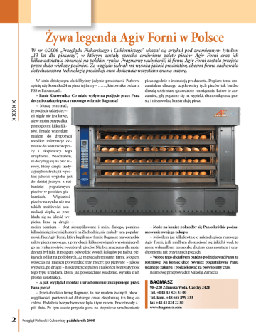 Żywa legenda Agiv Forni w Polsce XXXXX W nr 4/2006 „Przeglądu Piekarskiego i Cukierniczego” ukazał się artykuł pod znamiennym tytułem „13 lat dla piekarzy”, w którym zostały szeroko omówione zalety pieców Agiv Forni oraz ich kilkunastoletnia obecność na polskim rynku. Pragniemy nadmienić, iż firma Agiv Forni została przejęta przez dużo większy podmiot. Ze względu jednak na wysoką jakość produktów, obecna firma zachowała dotychczasową technologię produkcji oraz doskonale wszystkim znaną nazwę. 2 W dniu dzisiejszym chcielibyśmy jedynie przedstawić Państwu opinię użytkownika 24 m pieca tej firmy – ……, kierownika piekarni PSS w Pabianicach. – Panie Kierowniku. Co miało wpływ na podjęcie przez Pana decyzji o zakupie pieca rurowego w firmie Bagmasz? – Muszę przyznać, że podjęcie takiej decyzji nigdy nie jest łatwe, ale w moim przypadku pomogło mi kilka faktów. Przede wszystkim miałem do dyspozycji wszelkie informacje odnośnie do warunków pracy i eksploatacji tego urządzenia. Wiedziałem, że decyduję się na piec rurowy, który dzięki tradycyjnej konstrukcji i wysokiej jakości wypieku jest do dzisiaj jednym z najbardziej popularnych pieców w polskich piekarniach. Większość pieców na rynku nie ma takich możliwości akumulacji ciepła, co przekłada się na jakość wypieku. Inne są drogie – moim zdaniem – zbyt skomplikowane i m.in. dlatego, pomimo kilkudziesięcioletniej historii na Zachodzie, nie zyskały tam popularności. Piec Agiv Forni, który kupiłem w firmie Bagmasz ma wszystkie zalety pieca rurowego, a przy okazji kilka rozwiązań wyróżniających go na rynku spośród podobnych pieców. Nie bez znaczenia dla mojej decyzji był fakt, iż mogłem odwiedzić swoich kolegów po fachu, piekących od lat na podobnych, 22 m piecach tej samej firmy. Mogłem wówczas na miejscu potwierdzić trzy rzeczy: po pierwsze – jakość wypieku, po drugie – niskie zużycie paliwa i na końcu bezawaryjność tego typu urządzeń, która, jak powszechnie wiadomo, wynika z ich prostej konstrukcji. – A jak wyglądał montaż i uruchomienie zakupionego przez Pana pieca? – Jeżeli chodzi o firmę Bagmasz, to nie miałem żadnych obaw i wątpliwości, ponieważ od dłuższego czasu eksploatuję ich linię do chleba. Podobnie bezproblemowo było i tym razem. Prace trwały 4 i pół dnia. Po tym czasie przyszła pora na stopniowe uruchamianie Przegląd Piekarski i Cukierniczy październik 2009 pieca zgodnie z instrukcją producenta. Dopiero teraz zrozumiałem dlaczego użytkownicy tych pieców tak bardzo chwalą sobie stare sprawdzone rozwiązania. Łatwo to zrozumieć, gdy popatrzy się na wypieki, ekonomikę oraz prostą i niezawodną konstrukcję pieca. – Może na koniec pokusiłby się Pan o krótkie podsumowanie swojego zakupu. – Mówiłem już kilkakrotnie o zaletach pieca rurowego Agiv Forni; jeśli miałbym doszukiwać się jakichś wad, to może wskazałbym troszeczkę dłuższy czas montażu i uruchomienia niż przy innych piecach. – Wobec tego chciałbym bardzo podziękować Panu za rozmowę. Na koniec chcę również pogratulować Panu udanego zakupu i podziękować za poświęcony czas. Rozmowę przeprowadził Mikołaj Zarzecki BAGMASZ 98–220 Zduńska Wola, Czechy 242B Tel. +048 43 824 33 00 Tel. kom. +48 655 899 333 fax +48 43 824 22 80 www.bagmasz.com