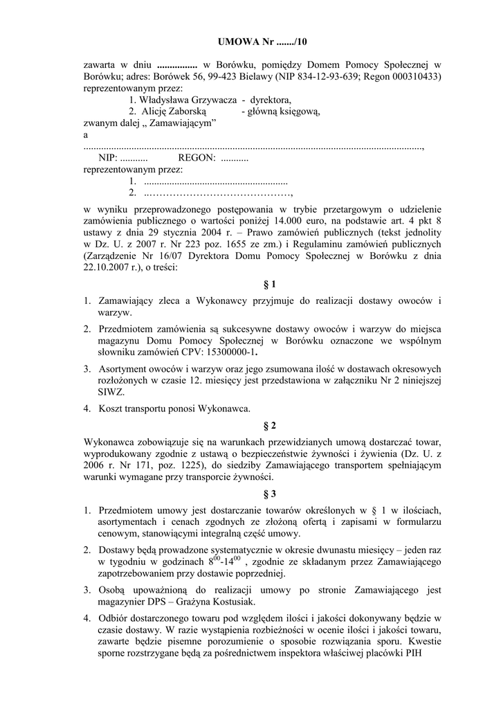 UMOWA Nr ......./10 zawarta w dniu ................ w Borówku, pomiędzy Domem Pomocy Społecznej w Borówku; adres: Borówek 56, 99-423 Bielawy (NIP 834-12-93-639; Regon 000310433) reprezentowanym przez: 1. Władysława Grzywacza - dyrektora, 2. Alicję Zaborską - główną księgową, zwanym dalej „ Zamawiającym” a ......................................................................................................................................, NIP: ........... REGON: ........... reprezentowanym przez: 1. ......................................................... 2. ..……………………………………, w wyniku przeprowadzonego postępowania w trybie przetargowym o udzielenie zamówienia publicznego o wartości poniŜej 14.000 euro, na podstawie art. 4 pkt 8 ustawy z dnia 29 stycznia 2004 r. – Prawo zamówień publicznych (tekst jednolity w Dz. U. z 2007 r. Nr 223 poz. 1655 ze zm.) i Regulaminu zamówień publicznych (Zarządzenie Nr 16/07 Dyrektora Domu Pomocy Społecznej w Borówku z dnia 22.10.2007 r.), o treści: §1 1. Zamawiający zleca a Wykonawcy przyjmuje do realizacji dostawy owoców i warzyw. 2. Przedmiotem zamówienia są sukcesywne dostawy owoców i warzyw do miejsca magazynu Domu Pomocy Społecznej w Borówku oznaczone we wspólnym słowniku zamówień CPV: 15300000-1. 3. Asortyment owoców i warzyw oraz jego zsumowana ilość w dostawach okresowych rozłoŜonych w czasie 12. miesięcy jest przedstawiona w załączniku Nr 2 niniejszej SIWZ. 4. Koszt transportu ponosi Wykonawca. §2 Wykonawca zobowiązuje się na warunkach przewidzianych umową dostarczać towar, wyprodukowany zgodnie z ustawą o bezpieczeństwie Ŝywności i Ŝywienia (Dz. U. z 2006 r. Nr 171, poz. 1225), do siedziby Zamawiającego transportem spełniającym warunki wymagane przy transporcie Ŝywności. §3 1. Przedmiotem umowy jest dostarczanie towarów określonych w § 1 w ilościach, asortymentach i cenach zgodnych ze złoŜoną ofertą i zapisami w formularzu cenowym, stanowiącymi integralną część umowy. 2. Dostawy będą prowadzone systematycznie w okresie dwunastu miesięcy – jeden raz w tygodniu w godzinach 800-1400 , zgodnie ze składanym przez Zamawiającego zapotrzebowaniem przy dostawie poprzedniej. 3. Osobą upowaŜnioną do realizacji umowy po stronie Zamawiającego jest magazynier DPS – GraŜyna Kostusiak. 4. Odbiór dostarczonego towaru pod względem ilości i jakości dokonywany będzie w czasie dostawy. W razie wystąpienia rozbieŜności w ocenie ilości i jakości towaru, zawarte będzie pisemne porozumienie o sposobie rozwiązania sporu. Kwestie sporne rozstrzygane będą za pośrednictwem inspektora właściwej placówki PIH §4 1. Strony postanawiają, Ŝe rozliczenia za dostarczony towar będą odbywać się na podstawie faktur dostarczanych wraz z towarem. 2. Zapłata dokonywana będzie w terminie 14 dni liczonych od dnia dostarczenia faktury, w formie przelewu na konto Wykonawcy podane na fakturze, po wydaniu towaru i pokwitowaniem odbioru przez osobę upowaŜnioną przez Zamawiającego. 3. Terminem zapłaty jest termin obciąŜenia rachunku Zamawiającego. 4. Wykonawca moŜe naliczać odsetki ustawowe za zwłokę w zapłacie za dostarczony towar. §5 1. Ceny podane w formularzu cenowym załączonym do oferty nie mogą ulec zmianie przez okres związania ofertą. 2. Po podpisaniu umowy ceny mogą być regulowane: a) co kwartał w granicach wskaźnika wzrostu cen towarów i usług konsumpcyjnych publikowanych w Monitorze Polskim w formie obwieszczenia Prezesa GUS o wskaźnik w poprzednim kwartale b) w przypadku zmian stawki podatku VAT c) w przypadku zmiany innych składników cen niezaleŜnych od Wykonawcy. 3. Wykonawca zobowiązany jest zawiadomić pisemnie Zamawiającego o kaŜdej zmianie cen wraz z uzasadnieniem podstawy zmiany, sporządzić nowy cennik i uzyskać akceptację Zamawiającego dla proponowanej zmiany. 4. Zmiana cen musi być udokumentowana w formie aneksu do umowy. §6 1. Wykonawca nie moŜe powierzyć wykonania zobowiązań wynikających z niniejszej umowy innemu podmiotowi pod rygorem rozwiązania umowy ze skutkiem natychmiastowym. 2. W razie krótkotrwałej niemoŜliwości zrealizowania zamówienia przez Wykonawcę z przyczyn od niego niezaleŜnych, moŜe on powierzyć innemu podmiotowi realizację części zamówienia, po uzyskaniu pisemnej zgody Zamawiającego. Ewentualne koszty związane z zaistniałą sytuacją, w szczególności róŜnicę ceny, pokryje Wykonawca. §7 Umowa moŜe zostać rozwiązana przez Zamawiającego w trybie natychmiastowym, jeŜeli: d) Wykonawca nie dostarcza towaru w uzgodnionym terminie, co powoduje zakłócenia w płynności przygotowywania posiłków, e) Wykonawca nie dostarcza towaru w zamówionych ilościach, f) Wykonawca dostarcza towar inny niŜ zamówiony bez uzgodnienia z Zamawiającym g) Wykonawca dostarczy towar wadliwy i nie wymieni go na właściwy, w czasie, który umoŜliwi wydanie posiłku zgodnie z jadłospisem . §8 W przypadku rozwiązania umowy jak w § 7 Wykonawca zapłaci Zamawiającemu karę umowną w wysokości 5 % wartości brutto niezrealizowanej części umowy. §9 1. W razie wystąpienia istotnej zmiany okoliczności, powodującej, Ŝe wykonanie umowy nie leŜy w interesie publicznym, czego nie moŜna było przewidzieć w chwili zawarcia umowy Zamawiający moŜe odstąpić od umowy w terminie 30 dni od powzięcia wiadomości o powyŜszych okolicznościach. 2. W takim przypadku Wykonawca moŜe Ŝądać jedynie wynagrodzenia naleŜnego mu z tytułu wykonanej juŜ części umowy. § 10 Umowa niniejsza zostaje zawarta na okres 12 miesięcy od dnia podpisania umowy. § 11 1. Zmiana postanowień niniejszej umowy wymaga formy pisemnej, pod rygorem niewaŜności. 2. Niedopuszczalne są takie zmiany postanowień zawartej umowy oraz wprowadzenie do niej nowych postanowień, niekorzystnych dla Zamawiającego, jeŜeli przy ich uwzględnieniu naleŜałoby zmienić treść oferty, na podst