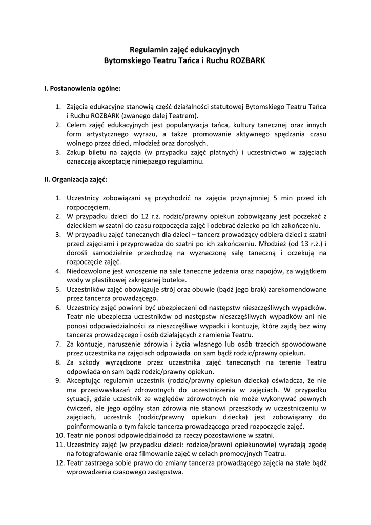 Regulamin zajęć edukacyjnych Bytomskiego Teatru Tańca i Ruchu ROZBARK I. Postanowienia ogólne: 1. Zajęcia edukacyjne stanowią część działalności statutowej Bytomskiego Teatru Tańca i Ruchu ROZBARK (zwanego dalej Teatrem). 2. Celem zajęć edukacyjnych jest popularyzacja tańca, kultury tanecznej oraz innych form artystycznego wyrazu, a także promowanie aktywnego spędzania czasu wolnego przez dzieci, młodzież oraz dorosłych. 3. Zakup biletu na zajęcia (w przypadku zajęć płatnych) i uczestnictwo w zajęciach oznaczają akceptację niniejszego regulaminu. II. Organizacja zajęć: 1. Uczestnicy zobowiązani są przychodzić na zajęcia przynajmniej 5 min przed ich rozpoczęciem. 2. W przypadku dzieci do 12 r.ż. rodzic/prawny opiekun zobowiązany jest poczekać z dzieckiem w szatni do czasu rozpoczęcia zajęć i odebrać dziecko po ich zakończeniu. 3. W przypadku zajęć tanecznych dla dzieci – tancerz prowadzący odbiera dzieci z szatni przed zajęciami i przyprowadza do szatni po ich zakończeniu. Młodzież (od 13 r.ż.) i dorośli samodzielnie przechodzą na wyznaczoną salę taneczną i oczekują na rozpoczęcie zajęć. 4. Niedozwolone jest wnoszenie na sale taneczne jedzenia oraz napojów, za wyjątkiem wody w plastikowej zakręcanej butelce. 5. Uczestników zajęć obowiązuje strój oraz obuwie (bądź jego brak) zarekomendowane przez tancerza prowadzącego. 6. Uczestnicy zajęć powinni być ubezpieczeni od następstw nieszczęśliwych wypadków. Teatr nie ubezpiecza uczestników od następstw nieszczęśliwych wypadków ani nie ponosi odpowiedzialności za nieszczęśliwe wypadki i kontuzje, które zajdą bez winy tancerza prowadzącego i osób działających z ramienia Teatru. 7. Za kontuzje, naruszenie zdrowia i życia własnego lub osób trzecich spowodowane przez uczestnika na zajęciach odpowiada on sam bądź rodzic/prawny opiekun. 8. Za szkody wyrządzone przez uczestnika zajęć tanecznych na terenie Teatru odpowiada on sam bądź rodzic/prawny opiekun. 9. Akceptując regulamin uczestnik (rodzic/prawny opiekun dziecka) oświadcza, że nie ma przeciwwskazań zdrowotnych do uczestniczenia w zajęciach. W przypadku sytuacji, gdzie uczestnik ze względów zdrowotnych nie może wykonywać pewnych ćwiczeń, ale jego ogólny stan zdrowia nie stanowi przeszkody w uczestniczeniu w zajęciach, uczestnik (rodzic/prawny opiekun dziecka) jest zobowiązany do poinformowania o tym fakcie tancerza prowadzącego przed rozpoczęcie zajęć. 10. Teatr nie ponosi odpowiedzialności za rzeczy pozostawione w szatni. 11. Uczestnicy zajęć (w przypadku dzieci: rodzice/prawni opiekunowie) wyrażają zgodę na fotografowanie oraz filmowanie zajęć w celach promocyjnych Teatru. 12. Teatr zastrzega sobie prawo do zmiany tancerza prowadzącego zajęcia na stałe bądź wprowadzenia czasowego zastępstwa. 13. Teatr zastrzega sobie prawo do odwołania zajęć w nagłych, uzasadnionych przypadkach. Informacja o odwołanych zajęciach będzie zamieszczana na stronie internetowej teatru: www.teatrrozbark.pl. Na prośbę uczestników zajęcia mogą zostać odrobione w ustalonym wspólnie przez uczestników i tancerza prowadzącego terminie. 14. Tancerz prowadzący ma prawo wykluczyć z zajęć osoby, których zachowanie zakłóca ich przebieg. W przypadku permanentnego łamania regulaminu uczestnik może zostać stale wykluczony z grupy. Osobom wykluczonym z grupy z uwagi na powyższe przyczyny nie są zwracane koszty zakupu biletu/karnetu. 15. W przypadku małej liczby uczestników Teatr ma prawo rozwiązać grupę. 16. Zajęcia będą odbywały się w grupach nie przekraczających 20 osób. 17. Jeżeli liczba chętnych do udziału w zajęciach przekroczy dozwoloną ilość uczestników określoną w pkt 16, Teatr zastrzega sobie możliwość odmowy dopuszczenia do zajęć. O osobach dopuszczanych do udziału w zajęciach każdorazowo decydować będzie kolejność przyjścia na zajęcia, z uwzględnieniem pierwszeństwa osób posiadających stały abonament (karnet). 18. Zajęcia taneczne nie odbywają się w czasie świąt, w dni ustawowo wolne od pracy, w czasie przerw świątecznych, wakacji letnich oraz ferii zimowych. III Opłaty za zajęcia: 1. Opłat za zajęcia dokonuje się każdorazowo przed rozpoczęciem zajęć bądź poprzez zakup karnetu wg ustalonego cennika. Bilety oraz karnety są dostępne w Biurze Obsługi Widza/kasie Teatru. Otrzymany bilet wstępu/karnet należy okazać tancerzowi prowadzącemu. 2. Karnety upoważniają do 4 wejść na zajęcia i są ważne przez 30 dni od daty zakupu. Karnety nie podlegają zwrotom ani przedłużeniom. 3. Teatr zastrzega sobie prawo wprowadzenia innego systemu płatności (np. elektronicznej), o czym poinformuje uczestników zajęć. 4. Opłaty za zajęcia nie obejmują strojów do ćwiczeń ani kostiumów. 5. Teatr ma możliwość wprowadzenia cen promocyjnych. 6. W zajęciach bezpłatnie mogą uczestniczyć seniorzy (w bloku zajęć: Zajęcia taneczne dla seniorów). IV Zapisy na zajęcia: 1. Zapisy na zajęcia są obowiązkowe dla następujących grup: Pracownia Ruchu (7 – 11), Pracownia Ruchu (12 – 16), Street Dance (7 – 11), Street Dance (12 – 16). Na pozostałe zajęcia zapisy nie obowiązują. 2. Zapisów na zajęcia można dokonywać od poniedziałku do piątku telefonicznie pod nr 32 428 13 05 bądź mailowo:[email protected] 3. W przypadku dzieci i młodzieży do 18 r.ż. konieczne jest wypełnienie karty zgłoszenia przez rodzica/prawnego opiekuna dostępnej na stronie internetowej Teatru. Karty należy zostawić w biurze (pok. nr 5) lub na portierni Teatru, bądź podpisany odręcznie skan przesłać na adres: [email protected] V Postanowienia końcowe: 1. Niniejszy regulamin może ulec zmianie. Wszelkie zmiany będą przekazywane za pomocą strony internetowej Teatru. 2. W sprawach nieujętych w niniejszym regulaminie decyduje Dyrektor Naczelny Bytomskiego Teatru Tańca i Ruchu ROZBARK.