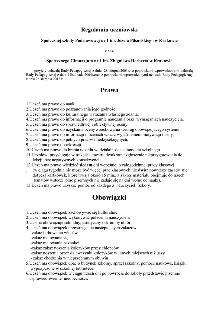 Regulamin uczniowski Społecznej szkoły Podstawowej nr 1 im. Józefa Piłsudskiego w Krakowie oraz Społecznego Gimnazjum nr 1 im. Zbigniewa Herberta w Krakowie przyjęty uchwałą Rady Pedagogicznej z dnia 28 sierpnia2001r. z poprawkami wprowadzonymi uchwałą Rady Pedagogicznej z dnia 1 listopada 2004r.oraz z poprawkami wprowadzonymi uchwała Rady Pedagogicznej z dnia 28 sierpnia 2013 r. Prawa 1.Uczeń ma prawo do nauki. 2.Uczeń ma prawo do poszanowania jego godności. 3.Uczeń ma prawo do kulturalnego wyrażania własnego zdania. 4.Uczeń ma prawo do informacji o programie nauczania oraz wymaganiach nauczyciela. 5.Uczeń ma prawo do sprawiedliwej i obiektywnej oceny. 6.Uczeń ma prawo do uzyskania oceny z zachowania według obowiązującego systemu. 7.Uczeń ma prawo do informacji o ocenach wraz z wyjaśnieniem motywacji oceny. 8.Uczeń ma prawo do pełnych przerw międzysekcyjnych. 9.Uczeń ma prawo do rekreacji. 10.Uczeń ma prawo do brania udziału w działalności samorządu szkolnego. 11.Uczniowi przysługuje w trakcie semestru dwukrotne zgłoszenie nieprzygotowania do lekcji bez negatywnych konsekwencji. 12.Uczeń ma prawo wiedzieć siedem dni wcześniej o całogodzinnej pracy klasowej . (w ciągu tygodnia nie może być więcej prac klasowych niż dwie; powyższe zasady nie dotyczą kartkówek, które trwają około 15 min., a zakres materiału obejmuje do trzech tematów wstecz; prac pisemnych nie zadaje się na dni wolne od nauki). 13.Uczeń ma prawo uzyskać pomoc od każdego z nauczycieli Szkoły. Obowiązki 1.Uczeń ma obowiązek zachowywać się kulturalnie. 2.Uczeń ma obowiązek wykonywać polecenia nauczycieli. 3.Ucznia obowiązuje schludny, estetyczny i skromny ubiór. 4.Uczeń ma obowiązek przestrzegania następujących zakazów: - zakaz farbowania włosów -zakaz malowania się -zakaz malowania paznokci -zakaz zakaz noszenia kolczyków przez chłopców -zakaz noszenia przez dziewczynki kolczyków w innych miejscach niż uszy - zakaz chodzenia w nieprzebranym obuwiu 5.Uczeń ma obowiązek dbać o budynek szkolny, sprzęt szkolny, pomoce naukowe, książki wypożyczone w szkolnej bibliotece. 6.Uczeń ma obowiązek w ciągu trzech dni po powrocie do szkoły przedstawić pisemne usprawiedliwienie nieobecności. 7.Ucznia obowiązuje punktualność. 8.Uczeń nie może przed ukończeniem lekcji opuścić szkoły bez pisemnego zwolnienia od Rodziców i zgody nauczyciela. 9.W razie dłuższej nieobecności ucznia z powodów poza chorobowych( wyjazdy za granicę, wyjazdy rodzinne itp.) ma on obowiązek uzyskać przed wyjazdem zgodę od Dyrekcji Szkoły. 10.Uczeń , który opuszcza szkołę z powodów poza chorobowych ma obowiązek samodzielnie uzupełnić brakujące lekcje. 11.Uczeń ma obowiązek być przygotowanym na lekcje tak pod względem merytorycznym jak i pod względem posiadania przyborów szkolnych, książek i zeszytów. 12.Uczeń ma obowiązek zachowywać w trakcie lekcji ciszę i spokój. 13.W trakcie sprawdzianów oraz prac domowych nie wolno korzystać z niedozwolonej pomocy. 14. Uczeń ma obowiązek mówienia prawdy 15. Uczeń ma obowiązek udzielić koleżeńskiej pomocy innym uczniom. 16. Uczeń ma obowiązek przestrzegania zakazu stosowania przemocy fizycznej jak i agresji słownej. 17.Uczeń ma obowiązek uczestniczyć w uroczystościach szkolnych i pozaszkolnych według ustalonego harmonogramu. 18.Ucznia obowiązuje strój galowy w dni mundurowe, dni świąteczne, w trakcie uroczystości pozaszkolnych, oficjalnych wyjść jak i wizyt w teatrach, salach koncertowych itp. 19.Ucznia obowiązuje zakaz palenia papierosów, picia alkoholu i zażywania narkotyków tak w szkole jak i poza nią pod rygorem relegowania ze szkoły. 20.Ucznia obowiązuje zakaz włączania telefonów podczas zajęć lekcyjnych i zakaz trzymania ich na widocznym miejscu. Telefony oraz inne urządzenia elektroniczne tego typu mają znajdować się w uczniowskich tornistrach. Złamanie tego zakazu skutkować będzie utratą przez ucznia prawa przynoszenia telefonu oraz innego urządzenia elektronicznego tego typu do szkoły na okres zaordynowany przez wychowawcę klasy (nie mniejszy niż dwa tygodnie). Recydywa w tym przypadku grozi poważniejszymi konsekwencjami. 21.Ucznia obowiązuje zakaz nagrywania i filmowania w szkole i gimnazjum w trakcie zajęć lekcyjnych bez zgody nauczyciela, a także poza zajęciami lekcyjnymi na terenie szkoły i gimnazjum bez zgody dyrektora. 22.W razie złamania zakazu nagrywania i filmowania uczniowi grozi kara obniżenia oceny ze sprawowania, a także zakaz przynoszenia na teren szkoły i gimnazjum telefonu oraz innych tego typu urządzeń elektronicznych (nie mniejszy niż jeden miesiąc). Recydywa w tym przypadku grozi poważniejszymi konsekwencjami.
