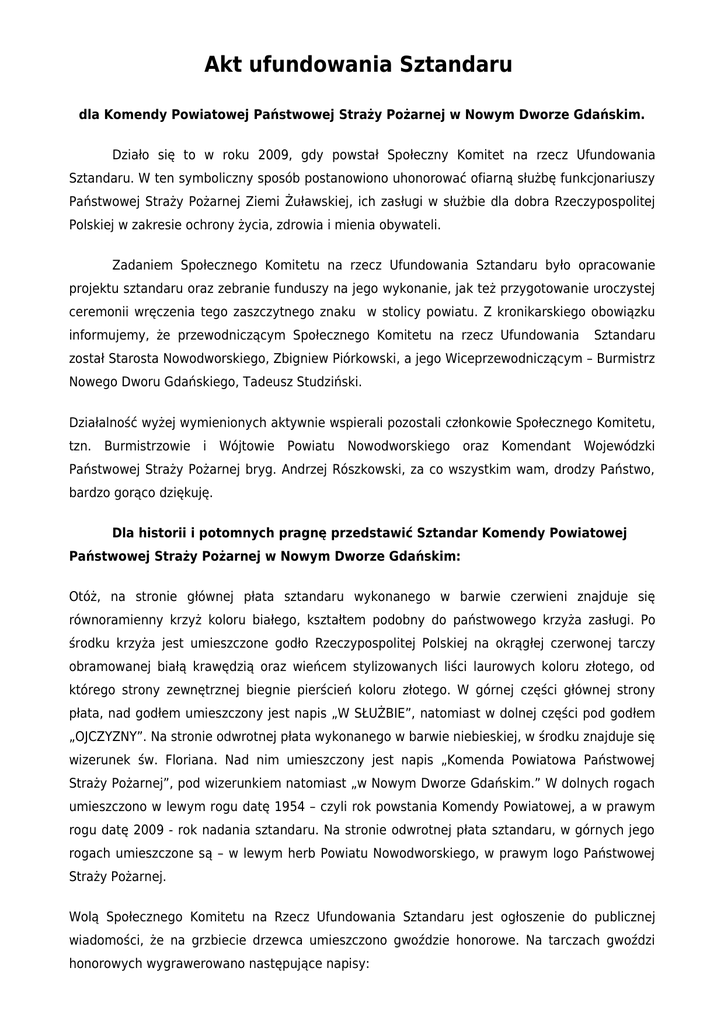 Akt ufundowania Sztandaru dla Komendy Powiatowej Państwowej Straży Pożarnej w Nowym Dworze Gdańskim. Działo się to w roku 2009, gdy powstał Społeczny Komitet na rzecz Ufundowania Sztandaru. W ten symboliczny sposób postanowiono uhonorować ofiarną służbę funkcjonariuszy Państwowej Straży Pożarnej Ziemi Żuławskiej, ich zasługi w służbie dla dobra Rzeczypospolitej Polskiej w zakresie ochrony życia, zdrowia i mienia obywateli. Zadaniem Społecznego Komitetu na rzecz Ufundowania Sztandaru było opracowanie projektu sztandaru oraz zebranie funduszy na jego wykonanie, jak też przygotowanie uroczystej ceremonii wręczenia tego zaszczytnego znaku w stolicy powiatu. Z kronikarskiego obowiązku informujemy, że przewodniczącym Społecznego Komitetu na rzecz Ufundowania Sztandaru został Starosta Nowodworskiego, Zbigniew Piórkowski, a jego Wiceprzewodniczącym – Burmistrz Nowego Dworu Gdańskiego, Tadeusz Studziński. Działalność wyżej wymienionych aktywnie wspierali pozostali członkowie Społecznego Komitetu, tzn. Burmistrzowie i Wójtowie Powiatu Nowodworskiego oraz Komendant Wojewódzki Państwowej Straży Pożarnej bryg. Andrzej Rószkowski, za co wszystkim wam, drodzy Państwo, bardzo gorąco dziękuję. Dla historii i potomnych pragnę przedstawić Sztandar Komendy Powiatowej Państwowej Straży Pożarnej w Nowym Dworze Gdańskim: Otóż, na stronie głównej płata sztandaru wykonanego w barwie czerwieni znajduje się równoramienny krzyż koloru białego, kształtem podobny do państwowego krzyża zasługi. Po środku krzyża jest umieszczone godło Rzeczypospolitej Polskiej na okrągłej czerwonej tarczy obramowanej białą krawędzią oraz wieńcem stylizowanych liści laurowych koloru złotego, od którego strony zewnętrznej biegnie pierścień koloru złotego. W górnej części głównej strony płata, nad godłem umieszczony jest napis „W SŁUŻBIE”, natomiast w dolnej części pod godłem „OJCZYZNY”. Na stronie odwrotnej płata wykonanego w barwie niebieskiej, w środku znajduje się wizerunek św. Floriana. Nad nim umieszczony jest napis „Komenda Powiatowa Państwowej Straży Pożarnej”, pod wizerunkiem natomiast „w Nowym Dworze Gdańskim.” W dolnych rogach umieszczono w lewym rogu datę 1954 – czyli rok powstania Komendy Powiatowej, a w prawym rogu datę 2009 - rok nadania sztandaru. Na stronie odwrotnej płata sztandaru, w górnych jego rogach umieszczone są – w lewym herb Powiatu Nowodworskiego, w prawym logo Państwowej Straży Pożarnej. Wolą Społecznego Komitetu na Rzecz Ufundowania Sztandaru jest ogłoszenie do publicznej wiadomości, że na grzbiecie drzewca umieszczono gwoździe honorowe. Na tarczach gwoździ honorowych wygrawerowano następujące napisy: 1. Minister Spraw Wewnętrznych i Administracji, Grzegorz Schetyna 2. Komendant Główny Państwowej Straży Pożarnej, nadbryg. Wiesław Leśniakiewicz 3. Wojewoda Pomorski, Roman Zaborowski 4. Marszałek Województwa Pomorskiego, Jan Kozłowski 5. Komendant Wojewódzki Państwowej Straży Pożarnej w Gdańsku, bryg. Andrzej Rószkowski 6. Starosta Nowodworski, Zbigniew Piórkowski 7. Burmistrz Nowego Dworu Gdańskiego, Tadeusz Studziński 8. Komendant Powiatowy Państwowej Straży Pożarnej w Nowym Dworze Gdańskim, mł. bryg. Krzysztof Ostasz 9. Jan Bestry - Strautmann Polska 10. Funkcjonariusze i Pracownicy Komendy Powiatowej Policji w Nowym Dworze Gdańskim 11. Strażacy i Pracownicy Komendy Powiatowej Państwowej Straży Pożarnej w Nowym Dworze Gdańskim 12. Strażacy OSP Powiatu Nowodworskiego 13. Mieszkańcy Powiatu Nowodworskiego 14. Parafianie Parafii Rzymskokatolickiej Niepokalanego Serca Maryi w Nowym Dworze Gdańskim 15. Parafianie Parafii Rzymskokatolickiej Przemienienia Pańskiego w Nowym Dworze Gdańskim 16. ks. Dariusz Juszczak, Kapelan Nowodworskich Strażaków 17. Andrzej Kasprowiak, Agro Pool Prima 18. Agencja Ochrony Ares 19. Janusz Fila 20. Wojciech Wojciechowski – Continental Krynica Morska 21. Grzegorz Lew – Lemax Krynica Morska 22. Przemysław Ruciński. Z satysfakcją informujemy także, że szlachetną inicjatywę ufundowania sztandaru wsparło wiele innych osób, instytucji i zakładów, które na jego wykonanie nie szczędzili grosza. Za szczodrość wszystkim darczyńcom dziękujemy. Wierzymy, że ten zaszczytny znak będzie chlubą i dumą dla wszystkich funkcjonariuszy naszej nowodworskiej Straży Pożarnej, którzy staną przy jego drzewcu, dotkną płatów i pozostawią dla niego miejsce w swoich sercach na zawsze. Honorowi darczyńcy i członkowie Społecznego Komitetu na rzecz Ufundowania Sztandaru są przekonani, że sztandar ten, jest i będzie symbolem zaszczytnej, ofiarnej i wiernej służby dla dobra Rzeczypospolitej Polskiej, jej obywateli oraz symbolicznym znakiem tożsamości i jedności funkcjonariuszy Państwowej Straży Pożarnej. Jesteśmy zaszczyceni, że Sztandar ten, jako honorowy znak zostanie wręczony Komendzie Powiatowej Państwowej Straży Pożarnej w Nowym Dworze Gdańskim przez Komendanta Głównego Państwowej Straży Pożarnej, Pana nadbryg. Wiesława Leśniakiewicza. W imieniu Społecznego Komitetu, akt podpisał przewodniczący Starosta Nowodworski, jednocześnie oznajmiając, iż w tym doniosłym dniu zakończył swą działalność Społeczny Komitet na rzecz Ufundowania Sztandaru dla Komendy Powiatowej Państwowej Straży Pożarnej w Nowym Dworze Gdańskim. Zbigniew Piórkowski Nowy Dwór Gdański, dnia 22 czerwca 2009 r.