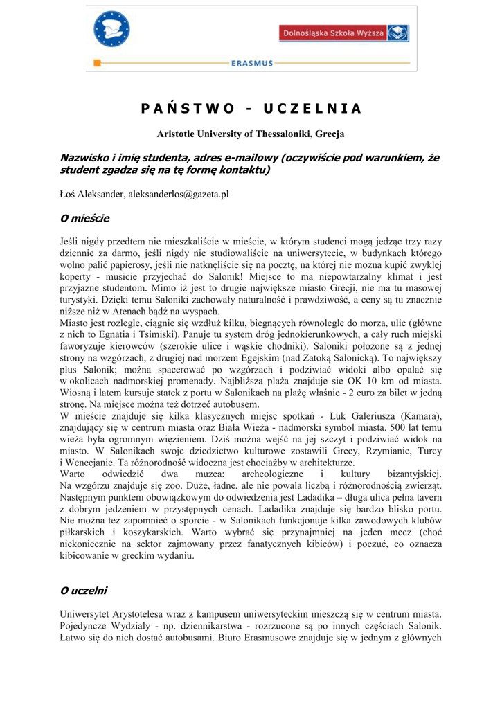 PAŃSTWO - UCZELNIA Aristotle University of Thessaloniki, Grecja Nazwisko i imię studenta, adres e-mailowy (oczywiście pod warunkiem, że student zgadza się na tę formę kontaktu) Łoś Aleksander, [email protected] O mieście Jeśli nigdy przedtem nie mieszkaliście w mieście, w którym studenci mogą jedząc trzy razy dziennie za darmo, jeśli nigdy nie studiowaliście na uniwersytecie, w budynkach którego wolno palić papierosy, jeśli nie natknęliście się na pocztę, na której nie można kupić zwyklej koperty - musicie przyjechać do Salonik! Miejsce to ma niepowtarzalny klimat i jest przyjazne studentom. Mimo iż jest to drugie największe miasto Grecji, nie ma tu masowej turystyki. Dzięki temu Saloniki zachowały naturalność i prawdziwość, a ceny są tu znacznie niższe niż w Atenach bądź na wyspach. Miasto jest rozlegle, ciągnie się wzdłuż kilku, biegnących równolegle do morza, ulic (główne z nich to Egnatia i Tsimiski). Panuje tu system dróg jednokierunkowych, a cały ruch miejski faworyzuje kierowców (szerokie ulice i wąskie chodniki). Saloniki położone są z jednej strony na wzgórzach, z drugiej nad morzem Egejskim (nad Zatoką Salonicką). To największy plus Salonik; można spacerować po wzgórzach i podziwiać widoki albo opalać się w okolicach nadmorskiej promenady. Najbliższa plaża znajduje sie OK 10 km od miasta. Wiosną i latem kursuje statek z portu w Salonikach na plażę właśnie - 2 euro za bilet w jedną stronę. Na miejsce można też dotrzeć autobusem. W mieście znajduje się kilka klasycznych miejsc spotkań - Luk Galeriusza (Kamara), znajdujący się w centrum miasta oraz Biała Wieża - nadmorski symbol miasta. 500 lat temu wieża była ogromnym więzieniem. Dziś można wejść na jej szczyt i podziwiać widok na miasto. W Salonikach swoje dziedzictwo kulturowe zostawili Grecy, Rzymianie, Turcy i Wenecjanie. Ta różnorodność widoczna jest chociażby w architekturze. Warto odwiedzić dwa muzea: archeologiczne i kultury bizantyjskiej. Na wzgórzu znajduje się zoo. Duże, ładne, ale nie powala liczbą i różnorodnością zwierząt. Następnym punktem obowiązkowym do odwiedzenia jest Ladadika – długa ulica pełna tavern z dobrym jedzeniem w przystępnych cenach. Ladadika znajduje się bardzo blisko portu. Nie można tez zapomnieć o sporcie - w Salonikach funkcjonuje kilka zawodowych klubów piłkarskich i koszykarskich. Warto wybrać się przynajmniej na jeden mecz (choć niekoniecznie na sektor zajmowany przez fanatycznych kibiców) i poczuć, co oznacza kibicowanie w greckim wydaniu. O uczelni Uniwersytet Arystotelesa wraz z kampusem uniwersyteckim mieszczą się w centrum miasta. Pojedyncze Wydzialy - np. dziennikarstwa - rozrzucone są po innych częściach Salonik. Łatwo się do nich dostać autobusami. Biuro Erasmusowe znajduje się w jednym z głównych budynków na terenie kampusu. Jest otwarte od poniedziałku do czwartku od 11.00 do 13.30. Bez problemu można tam załatwić wszystkie niezbędne sprawy. Każdy Wydział dysponuje swoją biblioteką. Wielu studentów Erasmusowych nie ma zajęć, bowiem niektóre przedmioty nie są dostępne w języku angielskim. Wtedy formą zaliczenia są prezentacje przygotowywane w języku angielskim, które wygłasza się przed greckimi studentami oraz prace pisemne na OK 5 tys. słów. Większość greckich profesorów jest wyrozumiała. Choć miewają problemy z punktualnością i odpisywaniem na e-maile. Wszystkie sprawy lepiej jest załatwiać osobiście na konsultacjach. Zanim wybierzecie się na konsultacje, upewnijcie się, że nie zostały odwołane ;-) Studenci w Salonikach mogą korzystać, za okazaniem legitymacji, z uczelnianej stołówki i jeść trzy razy dziennie za darmo. Poza tym, studenci mają duże zniżki na bilety autobusowe, kolejowe, a nawet niektóre promy. Ulgowy bilet autobusowy kosztuje 40 centów. Normalny - 80. Poza tym przy Uczelni funkcjonuje klub sportowy. Za 15 euro można wykupić roczny karnet na siłownię, basen itp. Być studentem w Salonikach to dobry interes Jak dojechać? (tutaj połączenia, ceny biletów, środki lokomocji) Do Salonik można dostać się samochodem bądź samolotem. W tym ostatnim przypadku, LOT proponuje loty z Warszawy do Aten. Z Aten do Salonik kursuje Aegean (krajowe linie greckie) i RyanAir. Z dodatkowym bagażem cala wycieczka z Warszawy do Salonik to koszt w sumie OK 600-700 zl. Cena zależy oczywiście od terminu. Z Aten do Salonik dostać się też można pociągiem – pociąg dzienny kosztuje ok 30 euro, nocny 12. Kursują też tanie linie lotnicze z Berlina bezpośrednio do Salonik. Jest to rozwiązanie warte rozważenia, może okazać się najtańsze. Jeśli ktoś wybiera się do Salonik z 2-3 innymi osobami, wtedy bardziej opłaca się wybrać samochód. Koszt paliwa i opłat autostradowych, nawet z noclegiem po drodze, wychodzi niższy niż bilety lotnicze. Poza tym, jest się niezależnym już na miejscu i można zwiedzać Grecję bez potrzeby wynajmowania auta. Wynajem malego samochodu na jeden dzien to koszt ok 30-40 euro. Komunikacja miejska czyli Jak jeździć na miejscu? W Salonikach nie ma metra, ani tramwajów. Autobusy kursują często. Najpopularniejsze linie jeżdżą średnio co 7 minut. Na każdy Wydział Uniwersytetu dotrzeć można tym środkiem komunikacji masowej. Jak wspomniałem, bilety autobusowe kosztują dla studentów 40 centów. Bilet na dwa autobusy, do wykorzystania w ciągu 90 minut, kosztuje 50 centów. Ceny: Saloniki, na tle Aten, wypadają bardzo korzystnie. LP. NAZWA PRODUKTU JEDN. CENA (w euro) 1. Mleko 1L 1,2 2. Sok w kartonie 1L 1,3 3. Olej 1L 2,5-4 4. Makaron 1 kg 1 5. Mąka 1 kg 6. Cukier 1 kg 1,3 7. Ser żółty 1 kg 7 8. Serek biały 9. Masło 10. Margaryna 11. Dżem 12. Ketchup 13. Ziemniaki 14. Ryż 15. Piwo 16. Cebula 1 kg 0,7 17. Pomidory 1 kg 1-1,5 18. Ogórki 1 kg 19. Pomarańcze 1 kg 20. Marchewka 1 kg 21. Chleb zwykły 1 kg 22. Czekolada 23. Lody 2