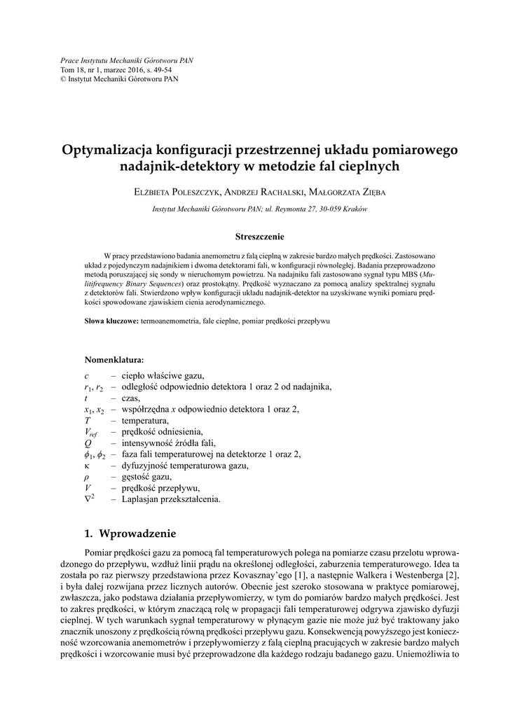 Prace Instytutu Mechaniki Górotworu PAN Tom 18, nr 1, marzec 2016, s. 49-54 © Instytut Mechaniki Górotworu PAN Optymalizacja konfiguracji przestrzennej układu pomiarowego nadajnik-detektory w metodzie fal cieplnych ELŻBIETA POLESZCZYK, ANDRZEJ RACHALSKI, MAŁGORZATA ZIĘBA Instytut Mechaniki Górotworu PAN; ul. Reymonta 27, 30-059 Kraków Streszczenie W pracy przedstawiono badania anemometru z falą cieplną w zakresie bardzo małych prędkości. Zastosowano układ z pojedynczym nadajnikiem i dwoma detektorami fali, w konfiguracji równoległej. Badania przeprowadzono metodą poruszającej się sondy w nieruchomym powietrzu. Na nadajniku fali zastosowano sygnał typu MBS (Mulitifrequency Binary Sequences) oraz prostokątny. Prędkość wyznaczano za pomocą analizy spektralnej sygnału z detektorów fali. Stwierdzono wpływ konfiguracji układu nadajnik-detektor na uzyskiwane wyniki pomiaru prędkości spowodowane zjawiskiem cienia aerodynamicznego. Słowa kluczowe: termoanemometria, fale cieplne, pomiar prędkości przepływu Nomenklatura: c r1, r2 t x1, x2 T Vref Q ϕ1, ϕ2 κ ρ V 2 – – – – – – – – – – – – ciepło właściwe gazu, odległość odpowiednio detektora 1 oraz 2 od nadajnika, czas, współrzędna x odpowiednio detektora 1 oraz 2, temperatura, prędkość odniesienia, intensywność źródła fali, faza fali temperaturowej na detektorze 1 oraz 2, dyfuzyjność temperaturowa gazu, gęstość gazu, prędkość przepływu, Laplasjan przekształcenia. 1. Wprowadzenie Pomiar prędkości gazu za pomocą fal temperaturowych polega na pomiarze czasu przelotu wprowadzonego do przepływu, wzdłuż linii prądu na określonej odległości, zaburzenia temperaturowego. Idea ta została po raz pierwszy przedstawiona przez Kovasznay’ego [1], a następnie Walkera i Westenberga [2], i była dalej rozwijana przez licznych autorów. Obecnie jest szeroko stosowana w praktyce pomiarowej, zwłaszcza, jako podstawa działania przepływomierzy, w tym do pomiarów bardzo małych prędkości. Jest to zakres prędkości, w którym znaczącą rolę w propagacji fali temperaturowej odgrywa zjawisko dyfuzji cieplnej. W tych warunkach sygnał temperaturowy w płynącym gazie nie może już być traktowany jako znacznik unoszony z prędkością równą prędkości przepływu gazu. Konsekwencją powyższego jest konieczność wzorcowania anemometrów i przepływomierzy z falą cieplną pracujących w zakresie bardzo małych prędkości i wzorcowanie musi być przeprowadzone dla każdego rodzaju badanego gazu. Uniemożliwia to Elżbieta Poleszczyk, Andrzej Rachalski, Małgorzata Zięba 50 zastosowanie tej metody do przepływów o zmiennym, bądź nieznanym składzie gazu. Dlatego też w ostatnich latach w Pracowni Metrologii przepływu IMG PAN prowadzono prace nad zastosowaniem tej metody do absolutnego pomiaru bardzo małych prędkości przepływu gazu, to jest poniżej 30 cm/s. 2. Zarys teorii Aby zastosować metodę fal cieplnych do absolutnego pomiaru prędkości zastosowano model zjawiska zaproponowany przez Kiełbasę [3]. Wychodząc z równania adwekcji-konwekcji: wT wt N 2T V gradT 1 Q t Uc (1) otrzymał on analityczne rozwiązanie dla nieskończenie długiego liniowego nadajnika pobudzonego falą sinusoidalną. Zgodnie z tym rozwiązaniem amplituda fali temperaturowej wynosi: 4 x ,r .Z ,N ,V Q0 2S N U c 16N 2Z 2 º 1 « » Vr ¬ V4 ¼ S ª 1 8 ª § V ¨ « exp xr « 2N ¨¨ © ¬« 1§ 16N 2Z 2 ¨1 1 2¨ V4 © · ·º ¸ ¸» ¸ ¸¸ » ¹ ¹ ¼» (2) a przesunięcie fazowe względem źródła fali jest dane wzorem: I r ,Z ,N ,V Vr 2N · 1 1§ 16N 2Z 2 4NZ ¨ 1 ¸ arctan 2 1 4 ¸ 4 2¨ V V © ¹ (3) Z powyższego wzoru otrzymujemy wzór na różnicę faz fal temperaturowych na detektorach umieszczonych w odległości r1 i r2 od źródła fali: 'I r ,Z ,N ,V I2 I1 V r2 r1 2N · 1§ 16N 2Z 2 ¨ 1 ¸ 1 4 ¸ 2¨ V © ¹ (4) W równaniu (4) występują dwie niewiadome: prędkość przepływu gazu i dyfuzyjność. Aby te wielkości można było wyznaczyć potrzebne jest drugie równanie. Ponieważ przesunięcie fazowe fali zależy od jej częstotliwości, to dla ciągu N fal o częstotliwościach ωj otrzymujemy następujący układ równań: 'I j r ,Z N ,N ,V I2 I1 V r2 r1 2N · 16N 2Z 2j 1 §¨ ¸, 1 1 ¸ 2¨ V4 © ¹ j 1,...N (5) gdzie Δϕj oznacza zmierzone przesunięcie fazowe fali o częstotliwości ωj. W pomiarze można zastosować kolejne ciągi fal o różnych częstotliwościach, lub co jest bardziej wygodne, zrobić wyznaczyć przesunięcia fazowe składowych harmonicznych fali. Układ równań (5) rozwiązuje się numerycznie, metodą estymacji nieliniowej [4]. 3. Kryteria wyboru przestrzennej konfiguracji układu nadajnik-detektory Problem doboru odpowiedniej konfiguracji nadajnika oraz detektorów, jest jednym z kluczowych zagadnień, którego rozwiązanie wpływa na jakość przeprowadzanych pomiarów, a co za tym idzie uzyskanych wyników. Po pierwsze, zastosowana konfiguracja musi być zgodna z założeniami teoretycznego modelu, do którego mają zostać odniesione uzyskane wyniki pomiarów. Ponieważ przedstawione rozwiązanie analityczne dotyczy liniowego nieskończenie długiego i cienkiego nadajnika fali, umieszczonego prostopadle względem wektora prędkości, zastosowano układ z pionowym nadajnikiem znacznie dłuższym w stosunku do detektorów. Kolejnym z warunków doboru konfiguracji jest, możliwa do uzyskania w danej konfiguracji, amplituda sygnału na detektorach. Musi być ona możliwie wysoka, tak, aby można było zmierzyć Optymalizacja konfiguracji przestrzennej układu pomiarowego nadajnik-detektor w metodzie... 51 przesunięcia fazowe wyższych harmonicznych sygnału z pożądaną dokładnością. Z analizy równania (2) wynika, że poprzeczny rozkład amplitudy fali jest krzywą Gaussa symetryczną względem nadajnika fali; potwierdzone zostało to również eksperymentalnie [5]. Rys. 1. Poprzeczny rozkład temperatury i prędkości 
