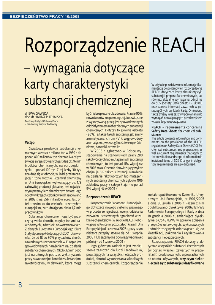 BEZPIECZEŃSTWO PRACY 10/2008 dr EWA GAWÊDA doc. dr HALINA PUCHALSKA Centralny Instytut Ochrony Pracy – Pañstwowy Instytut Badawczy Wstêp Światowa produkcja substancji chemicznych wzros³a z miliona ton w 1930 r. do ponad 400 milionów ton obecnie. Na ca³ym świecie zarejestrowanych jest dziś ok. 16 mln środków chemicznych; na europejskim rynku – ponad 100 tys. Z tej liczby 30 tys. znajduje siê w obrocie, w ilości przekraczaj¹cej 1 tonê rocznie. Przemys³ chemiczny w Unii Europejskiej, wytwarzaj¹cy ok. 1/3 ca³kowitej produkcji globalnej, jest najwiêkszym przemys³em chemicznym świata: jego obroty w krajach cz³onkowskich szacowano w 2003 r. na 556 miliardów euro. Jest on te¿ trzecim co do wielkości przemys³em europejskim, zatrudniaj¹cym oko³o 1,7 mln pracowników. Substancje chemiczne mog¹ byæ przyczyn¹ wielu chorób, miêdzy innymi zawodowych, równie¿ nowotworowych. Z danych Eurostatu (Europejskiego Biura Statystycznego) dotycz¹cych 2001 roku wynika, ¿e od 18 do 30% przypadków chorób zawodowych rozpoznanych w Europie jest spowodowanych nara¿eniem na dzia³anie substancji chemicznych. Oko³o 32 mln osób jest nara¿onych podczas wykonywania pracy zawodowej na kontakt z substancjami rakotwórczymi, w dawkach, które mog¹ 8 byæ niebezpieczne dla zdrowia. Prawie 90% nowotworów rozpoznanych jako zwi¹zane z wykonywan¹ prac¹ jest spowodowanych oddzia³ywaniem niebezpiecznych substancji chemicznych. Dotyczy to g³ównie azbestu (86%), a tak¿e takich substancji, jak aminy aromatyczne, chrom (VI), wêglowodory aromatyczne, w szczególności wielopierścieniowe, barwniki azowe itd. W 2006 r. zg³oszono w Polsce wystêpowanie na stanowiskach pracy 280 rakotwórczych lub mutagennych substancji chemicznych, to jest ponad 11% wiêcej ni¿ w 2005 roku. Obecnie obowi¹zuj¹cy wykaz obejmuje 819 takich substancji. Nara¿enie na dzia³anie rakotwórczych lub mutagennych substancji chemicznych zg³osi³o 1916 zak³adów pracy z ca³ego kraju – o ponad 5% wiêcej ni¿ w 2005 r. Rozporz¹dzenie REACH Rozporz¹dzenie Parlamentu Europejskiego dotycz¹ce nowego systemu prawnego w procedurze rejestracji, oceny, udzielania zezwoleñ i stosowanych ograniczeñ w zakresie chemikaliów (w skrócie REACH) obowi¹zuje w Polsce i w pozosta³ych krajach Unii Europejskiej od 1 czerwca 2007 r., przy czym niektóre przepisy stosuje siê od 1 sierpnia 2008 r. lub zaczn¹ one obowi¹zywaæ nawet później – od 1 czerwca 2009 r. Jego g³ównym zadaniem jest zmniejszenie zagro¿eñ dla ludzi i środowiska, powstaj¹cych na wszystkich etapach produkcji, obrotu i wykorzystania szkodliwych substancji chemicznych. Rozporz¹dzenie W artykule przedstawiono informacje i komentarze do postanowieñ rozporz¹dzenia REACH dotycz¹ce karty charakterystyki substancji i preparatów chemicznych, jak równie¿ aktualne wymagania odnośnie do SDS (Safety Data Sheets) – uk³adu oraz zakresu informacji zawartych w poszczególnych punktach karty. Omówiono tak¿e zmiany jakie zasz³y w porównaniu do wymagañ obowi¹zuj¹cych przed wejściem w ¿ycie tego rozporz¹dzenia. REACH – requirements concerning Safety Data Sheets for chemical substances This article presents information and comments on the provisions of the REACH regulation on Safety Data Sheets (SDS) for chemical substances and preparations as well as current requirements that apply to the constitution and scope of information in individual items of SDS. Changes in obligatory requirements are also discussed. zosta³o opublikowane w Dzienniku Urzêdowym Unii Europejskiej nr 1907/2007 z dnia 30 grudnia 2006 r. Razem z nim opublikowano dyrektywê 2006/121/WE Parlamentu Europejskiego i Rady z dnia 18 grudnia 2006 r., zmieniaj¹c¹ dyrektywê 67/548/EWG w sprawie zbli¿enia przepisów ustawowych, wykonawczych i administracyjnych odnosz¹cych siê do klasyfikacji, pakowania i etykietowania substancji niebezpiecznych. Rozporz¹dzenie REACH dotyczy praktycznie wszystkich substancji chemicznych (w postaci w³asnej i zawartych w preparatach) produkowanych, wprowadzanych do obrotu i u¿ywanych, przy czym niekoniecznie s¹ to substancje sklasyfikowane BEZPIECZEŃSTWO PRACY 10/2008 jako niebezpieczne. Wy³¹czone z zakresu jego stosowania s¹ jedynie substancje radioaktywne (objête dyrektyw¹ Rady 96/29 Euratom z dnia 11 maja 1996 r.) oraz substancje znajduj¹ce siê aktualnie pod nadzorem celnym, czy te¿ w trakcie przewozu. W rozporz¹dzeniu określono szczegó³owe obowi¹zki i zobowi¹zania producentów, importerów i dalszych u¿ytkowników substancji w postaci w³asnej lub w postaci preparatów i wyrobów. T+ Bardzo toksyczna substancja lub prepaarat w Polsce w za³¹czniku do rozporz¹dzenia Ministra Zdrowia z dnia 28 września 2005 r. w sprawie wykazu substancji niebezpiecznych wraz z ich klasyfikacj¹ i oznakowaniem. Substancje, których nie ma w tym wykazie, mo¿na sklasyfikowaæ we w³asnym zakresie. Dokonuje tego producent lub importer przeprowadzaj¹c ocenê bezpieczeñstwa chemicznego wg za³¹cznika I „Przepisy ogólne dotycz¹ce oceny substancji i sporz¹dzania raportów bezpieczeñstwa chemicznego” do rozporz¹dzenia REACH. Xn Szkodliwa substancja lub preparat Wprowadzenie nowych przepisów unijnych mia³o na celu zmniejszenie ryzyka zwi¹zanego z w³aściwościami toksycznymi i ekotoksycznymi substancji chemicznych. Szczególnie wa¿n¹ grup¹ substancji s¹ w tym aspekcie substancje rakotwórcze, mutagenne – wywo³uj¹ce trwa³e zmiany (mutacje) w komórkach i teratogenne – wywo³uj¹ce trwa³e zaburzenia strukturalne lub czynnościowe u zarodków lub p³odów. Mo¿na do tej grupy zaliczyæ równie¿ substancje trwa³e, wykazuj¹ce zdolnośæ do biokumulacji i toksyczne (PBT) oraz bardzo trwa³e, wykazuj¹ce bardzo du¿¹ zdolnośæ do biokumulacji (vPvB). Jak ju¿ powiedziano, rozporz¹dzenie REACH dotyczy nie tylko substancji sklasyfikowanych jako niebezpieczne, wymienionych niczenia ryzyka. Do wniosku o rejestracjê nal