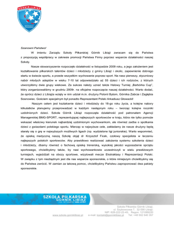 Szanowni Państwo! W imieniu Zarządu Szkoły Piłkarskiej Górnik Libiąż zwracam się do Państwa z propozycją współpracy w zakresie promocji Państwa Firmy poprzez wsparcie działalności naszej Szkoły. Nasze stowarzyszenie rozpoczęło działalność w listopadzie 2009 roku, a jego założeniem jest kształtowanie piłkarskich talentów dzieci i młodzieży z gminy Libiąż i okolic, zapewnienie dobrego startu w świecie sportu, a przede wszystkim wychowanie poprzez sport. Na nasz pierwszy, styczniowy nabór młodych adeptów w wieku 7-10 lat odpowiedziało aż 55 dzieci i ich rodziców, z których utworzyliśmy dwie grupy wiekowe. Za sukces należy uznać także Halowy Turniej „Barbórka Cup”, który zorganizowaliśmy w grudniu 2009r. na oficjalne rozpoczęcie naszej działalności. Warto dodać, że oprócz dzieci z Libiąża wzięły w nim udział m.in. drużyny Polonii Bytom, Górnika Zabrze i Zagłębia Sosnowiec. Gościem specjalnym był ponadto Reprezentant Polski Arkadiusz Głowacki! Naszym celem jest kształcenie dzieci i młodzieży do 18-go roku życia, a kolejne nabory kilkulatków planujemy przeprowadzać w każdym następnym roku – tworząc kolejne roczniki uzdolnionych dzieci. Szkoła Górnik Libiąż rozpoczęła działalność pod patronatem Agencji Managerskiej BMG-SPORT, reprezentującej najlepszych sportowców w kraju, która nie tylko pomoże wskazać właściwy kierunek najbardziej uzdolnionym wychowankom, ale również zadba o spotkania dzieci z gwiazdami polskiego sportu. Mierząc w najwyższe cele, zakładamy że nasze drużyny będą starały się o grę w najwyższych możliwych ligach (np. wydzielone ligi juniorskie). Warto wspomnieć, że opieką medyczną naszą Szkołę objął dr Krzysztof Ficek, czołowy specjalista w leczeniu najlepszych polskich sportowców. Aby prawidłowo realizować założenia systemu szkolenia dzieci i młodzieży, dbamy również o fachową opiekę trenerską, wysokiej jakości wyposażenie sprzętu sportowego, chcielibyśmy także, by nasi wychowankowie uczestniczyli w wielu prestiżowych turniejach, wyjeżdżali na obozy sportowe, wizytowali mecze Ekstraklasy i Reprezentacji Polski. W związku z tym niezbędnym jest dla nas wsparcie sponsorskie, o które niniejszym chcielibyśmy się do Państwa zwrócić. W zamian za takową pomoc, chcielibyśmy Państwu zaproponować dwa pakiety sponsorskie. www.szkola.gorniklibiaz.pl Szkoła Piłkarska Górnik Libiąż, ul. Szybowcowa 7, 32-590 Libiąż; NIP: 628-222-22-45; Regon: 121089220 e-mail: [email protected] Tel: +48 502 540 357 Pakiet Sponsora: - tytuł oficjalnego Sponsora Wspierającego Szkoły Piłkarskiej Górnik Libiąż; - reklama na strojach sportowych i dresach wyjściowych; - reklama na stronie internetowej Szkoły w postaci banera z odnośnikiem do Państwa strony wraz z wymienieniem Sponsora w zakładce Partnerzy (www.szkola.gorniklibiaz.pl); - tytuł Sponsora wszystkich turniejów i zawodów organizowanych przez Szkołę (bez dodatkowej opłaty) i możliwość eksponowania banerów oraz ulotek na takowych wydarzeniach; - otrzymywanie fotografii dokumentujących działalność Szkoły wraz z prawami autorskimi i możliwością wykorzystania ich przez Sponsora (w internecie, wydawnictwach itp.) Pakiet „Przyjaciela Szkoły”: - tytuł oficjalnego „Przyjaciela Szkoły Piłkarskiej Górnik Libiąż”; - reklama Sponsora w zakładce Partnerzy na oficjalnej stronie internetowej Szkoły (www.szkola.gorniklibiaz.pl); Pragniemy zapewnić, że swojej działalności staramy się nadać możliwie duży rozgłos medialny i w sposób ciągły monitorujemy publikacje dotyczące wydarzeń, w których bierzemy udział, a które mogą wpłynąć także na wizerunek sponsorów. Każde wsparcie, finansowe jak i rzeczowe jest dla nas bardzo cenne i pozwoli realizować cele statutowe ku uciesze naszych wychowanków. Po nawiązaniu ewentualnej współpracy mogą Państwo być pewni, że przedstawimy szczegółowy kosztorys wydatków poczynionych z przekazanych przez Państwa środków. Sami także mogą Państwo wskazać cel, który konkretnie chcą wesprzeć (np. sfinansowanie wyjazdu dzieci na obóz sportowy, udział w turnieju). Swoim działaniom zapewniamy maksymalne zaangażowanie i dalekosiężne plany, które chcielibyśmy realizować dla dobra dzieci wspólnie z Państwa Firmą. W razie zainteresowania współpracą, z przyjemnością umówimy się też z Państwem na spotkanie. Ze sportowym pozdrowieniem Prezes Szkoły Hubert Szumniak www.szkola.gorniklibiaz.pl Szkoła Piłkarska Górnik Libiąż, ul. Szybowcowa 7, 32-590 Libiąż; NIP: 628-222-22-45; Regon: 121089220 e-mail: [email protected] Tel: +48 502 540 357