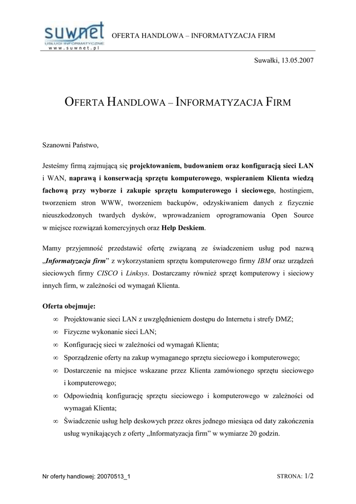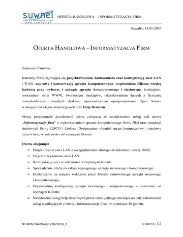 OFERTA HANDLOWA – INFORMATYZACJA FIRM w w w . s u w n e t . p l Suwałki, 13.05.2007 OFERTA HANDLOWA – INFORMATYZACJA FIRM Szanowni Państwo, Jesteśmy firmą zajmującą się projektowaniem, budowaniem oraz konfiguracją sieci LAN i WAN, naprawą i konserwacją sprzętu komputerowego, wspieraniem Klienta wiedzą fachową przy wyborze i zakupie sprzętu komputerowego i sieciowego, hostingiem, tworzeniem stron WWW, tworzeniem backupów, odzyskiwaniem danych z fizycznie nieuszkodzonych twardych dysków, wprowadzaniem oprogramowania Open Source w miejsce rozwiązań komercyjnych oraz Help Deskiem. Mamy przyjemność przedstawić ofertę związaną ze świadczeniem usług pod nazwą „Informatyzacja firm” z wykorzystaniem sprzętu komputerowego firmy IBM oraz urządzeń sieciowych firmy CISCO i Linksys. Dostarczamy równieŜ sprzęt komputerowy i sieciowy innych firm, w zaleŜności od wymagań Klienta. Oferta obejmuje: • Projektowanie sieci LAN z uwzględnieniem dostępu do Internetu i strefy DMZ; • Fizyczne wykonanie sieci LAN; • Konfigurację sieci w zaleŜności od wymagań Klienta; • Sporządzenie oferty na zakup wymaganego sprzętu sieciowego i komputerowego; • Dostarczenie na miejsce wskazane przez Klienta zamówionego sprzętu sieciowego i komputerowego; • Odpowiednią konfigurację sprzętu sieciowego i komputerowego w zaleŜności od wymagań Klienta; • Świadczenie usług help deskowych przez okres jednego miesiąca od daty zakończenia usług wynikających z oferty „Informatyzacja firm” w wymiarze 20 godzin. Nr oferty handlowej: 20070513_1 STRONA: 1/2 OFERTA HANDLOWA – INFORMATYZACJA FIRM w w w . s u w n e t . p l Koszt świadczenia usług pod nazwą „Informatyzacja firm” Koszt jest ustalany indywidualnie z Klientem i zaleŜy od: • Wielkości przedsięwzięcia; • Ilości zamówionego sprzętu komputerowego i/lub sieciowego. Korzyści wynikające z zamówienia usług pod nazwą „Informatyzacja firm”: • Darmowy, miesięczny Help Desk w wymiarze 20 godzin; • Szybkość wykonania projektu; • Łatwość wprowadzania zmian w trakcie realizacji umowy podpisanej na podstawie oferty pod nazwą „Informatyzacja firm”; • Szybki serwis sprzętu komputerowego i sieciowego; • Oszczędność czasu Klienta wynikająca ze zlecenia wszystkich działań związanych z informatyzacją firmy jednemu wykonawcy; • ObniŜenie kosztów związanych z informatyzacją firmy. JeŜeli zainteresowała Państwa nasza oferta prosimy o kontakt telefoniczny (+48 604 91 51 51) lub mailowy ([email protected]). Z wyrazami szacunku, Mariusz Kuźma Nr oferty handlowej: 20070513_1 STRONA: 2/2