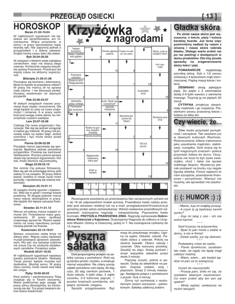 PRZEGLĄD OSIECKI HOROSKOP Baran 21.03-19.04 W najbliższych tygodniach nie będziesz ani sentymentalna, ani romantyczna. Wręcz przeciwnie, w domu i w pracy wprowadzisz rządy twardej ręki. Nie zapomnij jednak o przyjaciołach i o dobrej zabawie. Znajdź trochę czasu tylko dla siebie. Byk 20.04-20.05 W relacjach z bliskimi wiele zdziałasz uśmiechem, więc nie okazuj złego nastroju. Koniecznie ureguluj wszystkie sprawy finansowe. Przeznacz też więcej czasu na aktywny wypoczynek. Bliźnięta 21.05-21.06 Poczujesz się kochana i adorowana. Może to będzie ta prawdziwa miłość? W pracy nie marnuj sił na sprawy mało istotne. I nie lekceważ plotek. Oczekuj wiadomości od dawnych przyjaciół. Rak 22.06-22.07 W stałych związkach marzec przyniesie dużo ciepła i zrozumienia. Dla singli będzie to czas na nowe znajomości i romanse. A w pracy warto brać pod uwagę cudze opinie, bo nieomylność czasem zaślepia. Lew 23.07-22.08 Czekają Cię nowe znajomości i fascynacje. Nie daj się jednak wciągnąć w żadne gry miłosne. W pracy nie pozwalaj sobie na żaden błąd. Jesteś oceniana i być może stoisz przed awansem. Panna 23.08-22.09 Początek marca zapowiada się spokojniej. Będziesz jednak potrzebna przyjaciółce. Postaraj się zachować obiektywizm. W pracy pewna sprawa okaże się życiowym egzaminem. Kto wie, może skończy się podwyżką. Waga 23.09-22.10 Nie ominie Cię pokusa flirtowania. Baw się ale nie przeciągaj struny, jeśli zależy Ci na związku. W pracy dobra passa, wcielisz w swoje życie nowe pomysły. I spodziewaj się ważnej wiadomości. Skorpion 23.10-21.11 W związku trochę sporów i niejasności. Weź się w garść i rozwiąż wasze problemy. W drugiej połowie marca nieco więcej obowiązków w pracy. Ale będzie też lepsza sytuacja finansowa. Strzelec 22.11-21.12 Wenus od połowy marca rozjaśni zimowe dni. Powodzenie masz gwarantowane. W pracy spotkasz znajomego sprzed lat. Razem wpadniecie na nowy zawodowy pomysł. Uważaj jednak na finanse. Koziorożec 22.12-19.01 Sprawy uczuciowe zejdą teraz na dalszy plan. Więcej czasu będziesz musiał poświęcić sprawom zawodowym. Kto wie, czy sytuacja rodzinna nie zmusi Cię do szukania dodatkowych zarobków. Poradzisz sobie. Wodnik 20.01-18.02 W najbliższych tygodniach będziesz bardzo potrzebna bliskim. Niekiedy Twoja pomoc będzie musiała być dyskretna. Słuchaj serca. W pracy nieco zwolnij, może nawet weź kilka dni urlopu. Ryby 19.02-20.03 Ktoś solidny i zainteresowany Tobą znajduje się w Twoim otoczeniu. Warto podtrzymać jego uwagę. W pracy pilnuj obowiązków, bo konkurencja nie śpi. Tuż przed świętami dotrze dobra wiadomość. [ 13 ] KrzyŜówka z nagrodami Nazwa bursztynu Skała z osadów wód gejzeru 7 Okres, czas w dziejach ziemi Chińska głęboka Poręka na wekpatelnia slu lub czeku 10 Popularne nazwisko Wyspa w arch. Pelagualentów Koń rasy małej 8 12 1 3 Australijski struś 9 Jednostka pracy i energii Pierwiastek jak kontynent 16 Autor “Myśli nieuczesanych” Gatunek nietoperza 11 Rzeka na granicy rosyjskochińskiej Rakieta świetlna 5 Słomiana plecionka lub Tatami Wczesna pora dnia 2 4 6 100 m2 gruntu 15 Węglowodór, bezbarwny palny gaz 14 Kolor w kartach 1 11 Gładka skóra 13 2 3 4 5 6 7 12 13 14 15 16 8 9 10 Rozwiązanie powstanie po przeniesieniu liter oznaczonych cyframi od 1 do 16 do odpowiednich kratek poniżej. Prawidłowe hasło należy przesłać pod adresem redakcji lub na e-mail: [email protected] (prosimy podać adres zamieszkania). Wśród nadawców prawidłowych odpowiedzi rozlosujemy nagrodę - niespodziankę. Poprzednie hasło brzmiało: PRZYSZŁA PRAWDZIWA ZIMA. Nagrodę wylosowała Dobrosława Walenciak z Kąkolewa. Gratulujemy! Nagroda do odbioru w Urzędzie Miasta i Gminy w Osiecznej, pokój nr 7. Na rozwiązania czekamy do 15 marca. Pyszna sałatka Dziś proponujemy przepis na sałatkę ryżową z parówkami. Robi się ją bardzo prosto i szybko, a smakuje niemal wszystkim. Na cztery porcje sałatki potrzebne nam będą: 40 dag ryżu, 20 dag cienkich parówek, 1 duża cebula, 4 łyżki oleju, 3 ząbki czosnku, 2-3 kolorowe papryki, 1 puszka krojonych pomidorów, sól, pieprz, tymianek, oregano. Sposób przygotowania: Ryż wsyp do posolonego wrzątku. Ugotuj na sypko. Odcedź, ostudź. Parówki obierz z osłonek. Pokrój na skośne kawałki. Obierz cebulę i czosnek. Oba warzywa posiekaj. Zeszklij na oleju. Dodaj parówki i smaż wszystkie składniki przez około 3 minuty. Paprykę oczyść, pokrój w paseczki. Dodaj do składników na patelni. Dopraw ziołami, solą i pieprzem. Smaż 2 minuty mieszając. Następnie połącz z pomidorami z puszki. Duś 4 minuty. Zimny ryż wymieszaj z wystudzonym sosem warzywno - parówkowym. Sałatkę udekoruj ziołami. Po zimie nasza skóra jest wysuszona, a łokcie, pięty i kolana bardziej twarde. Już teraz więc powinniśmy zadbać by razem z wiosną i nasza skóra nabrała blasku. Dlatego warto zrobić raz po raz peelingi z dostępnych w domu produktów. Oto trzy proste sposoby na zregenerowanie skóry łokci i pięt. POMARAŃCZE wygładzają szorstką skórę. Sok z 1/2 owocu zmieszaj z 4 łyżeczkami mąki ziemniaczanej. Papką masuj łokcie i kolana. ZIEMNIAKI ukoją pękające pięty. Do papki z 2 ziemniaków dodaj 2-3 łyżki wywaru z siemienia lnianego. Trzymaj ją na piętach 20 minut. CYTRYNA zmiękcza stwardniały naskórek i go rozjaśnia. Plasterkami owocu przecieraj łokcie i kolana co kilka dni. Czy wiecie, Ŝe... Żółw może przynieść pomyślność i szczęście. Tak uważano już w dawnych kulturach Wschodu. Równocześnie żółwia traktowano jako uosobienie mądrości, stabilizacji, rozsądku. Dziś wraca się to tych magicznych znaczeń i poleca przynieść żółwia do domu. Oczywiście nie musi to być żywe zwierzątko, choć i takie nie sprawi wielkiego kłopotu. Wystarczy jednak postawić na biurku czy regale figurkę żółwika. Ponoć zapewni to nam szczęście, powodzen