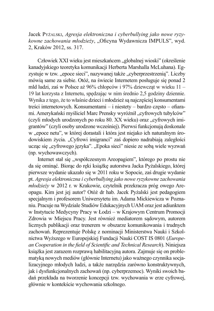 Jacek Pyżalski, Agresja elektroniczna i cyberbullying jako nowe ryzykowne zachowania młodzieży, „Oficyna Wydawnicza IMPULS”, wyd. 2, Kraków 2012, ss. 317. Człowiek XXI wieku jest mieszkańcem „globalnej wioski” (określenie kanadyjskiego teoretyka komunikacji Herberta Marshalla McLuhana). Egzystuje w tzw. „epoce sieci”, nazywanej także „cyberprzestrzenią”. Liczby mówią same za siebie. Otóż, na świecie Internetem posługuje się ponad 2 mld ludzi, zaś w Polsce aż 96% chłopców i 97% dziewcząt w wieku 11 – 19 lat korzysta z Internetu, spędzając w nim średnio 2,5 godziny dziennie. Wynika z tego, że to właśnie dzieci i młodzież są najczęściej konsumentami treści internetowych. Konsumentami – i niestety – bardzo często – ofiarami. Amerykański myśliciel Marc Prensky wyróżnił „cyfrowych tubylców” (czyli młodych urodzonych po roku 80. XX wieku) oraz „cyfrowych imigrantów” (czyli osoby urodzone wcześniej). Pierwsi funkcjonują doskonale w „epoce netu”, w której dorastali i która jest niejako ich naturalnym środowiskiem życia. „Cyfrowi imigranci” zaś dopiero nadrabiają zaległości ucząc się „cyfrowego języka”. „Epoka sieci” niesie ze sobą wiele wyzwań (np. wychowawczych). Internet stał się „współczesnym Areopagiem”, którego po prostu nie da się ominąć. Biorąc do ręki książkę autorstwa Jacka Pyżalskiego, której pierwsze wydanie ukazało się w 2011 roku w Sopocie, zaś drugie wydanie pt. Agresja elektroniczna i cyberbullying jako nowe ryzykowne zachowania młodzieży w 2012 r. w Krakowie, czytelnik przekracza próg owego Areopagu. Kim jest jej autor? Otóż dr hab. Jacek Pyżalski jest pedagogiem specjalnym i profesorem Uniwersytetu im. Adama Mickiewicza w Poznaniu. Pracuje na Wydziale Studiów Edukacyjnych UAM oraz jest adiunktem w Instytucie Medycyny Pracy w Łodzi – w Krajowym Centrum Promocji Zdrowia w Miejscu Pracy. Jest również mediatorem sądowym, autorem licznych publikacji oraz trenerem w obszarze komunikowania i trudnych zachowań. Reprezentuje Polskę z nominacji Ministerstwa Nauki i Szkolnictwa Wyższego w Europejskiej Fundacji Nauki COST IS 0801 (European Cooperation in the field of Scientific and Technical Research). Niniejsza książka jest zarazem rozprawą habilitacyjną autora. Zajmuje się on problematyką nowych mediów (głównie Internetu) jako ważnego czynnika socjalizacyjnego młodych ludzi, a także narzędzia zarówno konstruktywnych, jak i dysfunkcjonalnych zachowań (np. cyberprzemoc). Wyniki swoich badań przekłada na tworzenie koncepcji tzw. wychowania w erze cyfrowej, głównie w kontekście wychowania szkolnego. 404 Veritati et Caritati Pyżalski zwraca uwagę na to, że wraz z upowszechnieniem się Internetu i telefonów komórkowych wzrosła także liczba zagrożeń, choćby uzależnienie się od Internetu, nękanie sms–ami czy oczernianie w sieci. Jasnym się stało, że nawet świat wirtualny odciska swoje piętno na psychice ludzkiej. Te problemy nie tylko nie omijają dzieci i młodzieży, ale właśnie je dotykają szczególnie mocno. Dlatego niezwykle istotne jest to, aby rodzice i pedagodzy byli przygotowani do rozpoznawania i walki z tymi zagrożeniami, które niosą nowe media. Pośród tych zagrożeń sytuuje się cyberbullying. Cyberbullying (cyberprzemoc) – to każda informacja bądź treść, która ma na celu przestraszyć, zawstydzić, nękać lub w inny sposób zranić innych, i jest opublikowana lub wysyłana online (za pomocą komunikatorów, e – maili, stron internetowych, blogów). Przyjmuje się, że przemoc elektroniczna w przeważającej większości występuje wśród dzieci i młodzieży. Niektórzy mobbing elektroniczny traktują wręcz jako synonim przemocy rówieśniczej. Jest to zrozumiałe, bowiem dzisiejsi 15–latkowie (i młodsi) reprezentują pokolenie, które niemal od urodzenia ma styczność z największymi zdobyczami technologii informatycznych tj. komputer, komórka czy Internet. Dla młodych ludzi Internet to nie tylko gry, multimedia, strony www, ale przede wszystkim nowe formy komunikacji, które trwale zmieniają charakter relacji społecznych. Poruszanie się po cyberprzestrzeni jest więc dla młodych ludzi czymś oczywistym i naturalnym oraz stanowi jedną z dominujących form ich społecznej aktywności. Nic więc dziwnego, że znana od dawna przemoc rówieśnicza również częściowo przeniosła się do świata on–line. Książka Jacka Pyżalskiego o agresji elektronicznej i cyberbullingu wśród młodzieży jest bez wątpienia pozycją ciekawą, ale trzeba to uczciwie stwierdzić, niełatwą do czytania. Dlaczego? Otóż jest to publikacja naukowa, a nie książka o charakterze eseistycznym czy też publicystycznym. Pyżalski stawia w centrum problem cyberbullyingu i poprzez liczne odniesienia metodologiczne stara się w sposób fachowy i autorytarny go zdefiniować. Posługuje się terminologią z zakresu nowych mediów, licznymi statystykami oraz nierzadko odwołuje się do opinii innych badaczy (polskich i zagranicznych) zajmujących się tą dziedziną nauki. W ten sposób jego książka staje się wiarygodnym źródłem informacji, lecz językowo może czytelnikowi momentami sprawiać trudności. Jej niewątpliwym walorem jest dostrzeżenie tych nowych zagrożeń i jednocześnie wyzwań stojących przez młodym pokoleniem i jego wychowawcami, także, a może przede wszystkim, przed rodzicami. Wszak Recenzje 405 to, w jaki sposób młody człowiek został wychowany w domu, zaowocuje jego zachowaniem poza nim i uwarunkuje go jako człowieka w przyszłości. Dlatego warto bliżej przyjrzeć się wynikom badań Jacka Pyżalskiego, odznaczających się rzetelnością, bardzo mocno umieszczonych w bogatym podłożu teoretycznym i kompetentnie zinterpretowanych. Autor rozpoczyna swoje rozważania od bardzo ogólnych informacji na temat mediów samych w sobie, a więc zanim przejdzie do nom