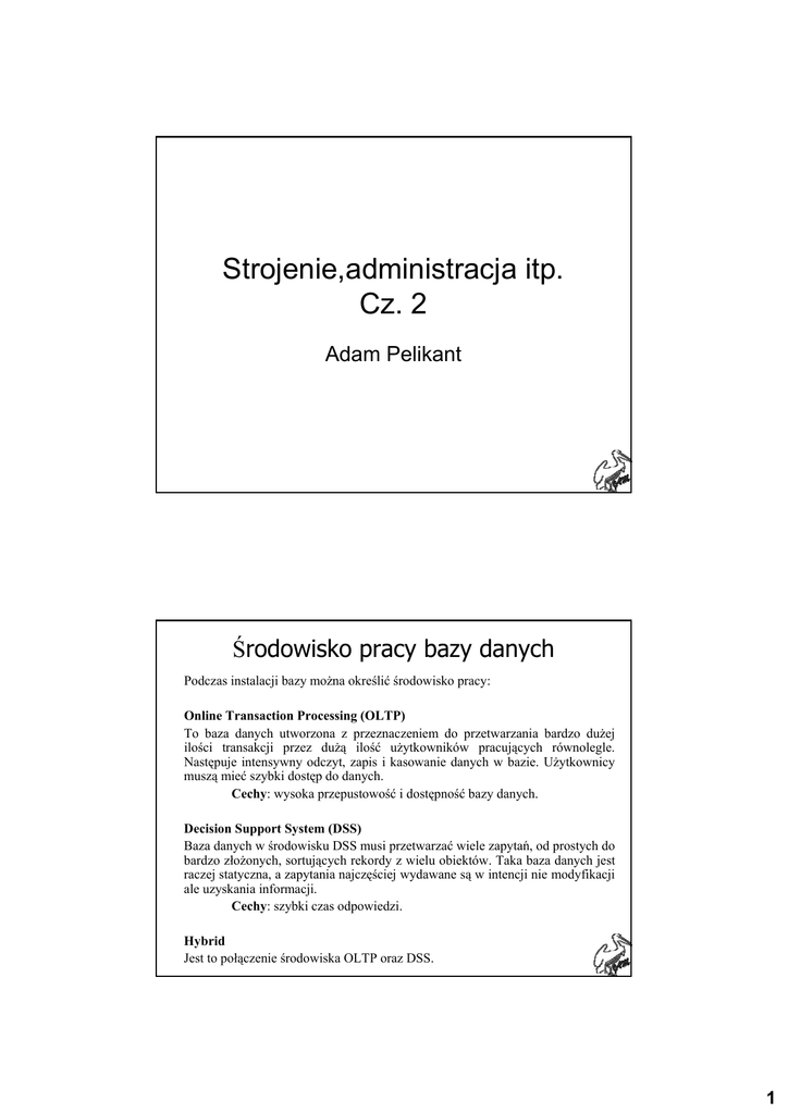 Strojenie,administracja itp. Cz. 2 Adam Pelikant Środowisko pracy bazy danych Podczas instalacji bazy można określić środowisko pracy: Online Transaction Processing (OLTP) To baza danych utworzona z przeznaczeniem do przetwarzania bardzo dużej ilości transakcji przez dużą ilość użytkowników pracujących równolegle. Następuje intensywny odczyt, zapis i kasowanie danych w bazie. Użytkownicy muszą mieć szybki dostęp do danych. Cechy: wysoka przepustowość i dostępność bazy danych. Decision Support System (DSS) Baza danych w środowisku DSS musi przetwarzać wiele zapytań, od prostych do bardzo złożonych, sortujących rekordy z wielu obiektów. Taka baza danych jest raczej statyczna, a zapytania najczęściej wydawane są w intencji nie modyfikacji ale uzyskania informacji. Cechy: szybki czas odpowiedzi. Hybrid Jest to połączenie środowiska OLTP oraz DSS. 1 Narzędzia dostarczane z Oracle SQL*Plus Menadżer serwerów SQL*DBA/ SQL*Loader Import Export SQL*Net Kategorie awarii • • • • • - awaria nośnika awaria instancji awaria procesu użytkownika błąd użytkownika błąd polecenia 2 Kategorie awarii Awaria instancji (instance failure) jest najczęściej wynikiem powstania wewnętrznego wyjątku Oracle, błędu w systemie operacyjnym lub awarii bazy danych związanej z oprogramowaniem. Diagnozę o awarii systemu można postawić wtedy, gdy przestaje działać proces Oracle (PMON, SMON, DBWR, LGWR), a baza danych nie została normalnie zamknięta. Awarie instancji mogą prowadzić do uszkodzenia bazy danych, ale z natury nie powoduję one zniszczeń. Często zwykłe ponowne uruchomienie bazy danych pozwala na dalsze wykonywanie działań. Awaria nośnika (media failure) jest bardziej groźna. Objawia się zwykle przez niezdolność bazy danych do odczytania poprzednio zapisanych informacji. Główne przyczyny awarii nośników to: uszkodzenie napędu dysków, niepoprawne bloki na dysku, skasowanie plików danych, uszkodzenie systemu plików. Awaria nośnika prawie zawsze powoduje w bazie danych uszkodzenie, które musi być naprawione, zanim baza będzie mogła powrócić do normalnego działania. System Oracle8 udostępnia wiele metod odzyskiwania utraconych danych. Kategorie awarii Awaria procesu użytkownika – ten typ awarii zwykle nie wymaga żadnych działań ze strony administratora bazy danych, gdyż objawia się niezamierzonym przerwaniem połączenia użytkownika z bazą danych. Awaria procesu użytkownika obsługiwana jest przez proces drugoplanowy PMON. Błąd użytkownika (user error) – awarie wywołane błędami użytkownika zwykle wymagają działań DBA mających na celu odtworzenie danych. Przyczyny: przypadkowe usunięcie tabeli, usunięcie istotnych danych, itp. Błąd polecenia (statement error) występuje, kiedy zaistnieje błąd logiczny w rozkazie programu. Błąd użytkownika sygnalizowany jest przez serwer Oracle odpowiednim komunikatem o błędzie. Polecenie SQL, które spowodowało błąd, jest automatycznie wycofywane, a sterowanie jest przekazywane do aplikacji użytkownika. 3 Metody tworzenia kopii bezpieczeństwa i odtwarzania danych • Kopie bezpieczeństwa tworzone „na zimno” (cold backup, offline backup) oraz odtwarzanie • Tworzenie kopii bezpieczeństwa „na gorąco” (hot backup, online backup) oraz odtwarzanie • Tworzenie kopii bezpieczeństwa i odtwarzanie za pomocą programu Recovery Manager • Tworzenie logicznej kopii bezpieczeństwa (logical backup) oraz odtwarzanie • Przyrostowe tworzenie kopii bezpieczeństwa • Zapasowe bazy danych (standby database) Metody tworzenia kopii Kopie bezpieczeństwa tworzone „na zimno” (cold backup, offline backup) oraz odtwarzanie wykonane są przy zamkniętej instancji bazy danych Oracle, następnie kopiowane są wszystkie istotne pliki bazy (pliki danych, pliki sterujące, dzienniki powtórzeń, archiwa dzienników powtórzeń, pliki init.ora i config.ora). Tworzenie kopii bezpieczeństwa „na gorąco” (hot backup, online backup) oraz odtwarzanie wykonanie kopii bezpieczeństwa podczas ciągłej pracy bazy. Jest niezbędnym elementem działań 24-godzinnych przez 7 dni w tygodniu. Polega na skopiowaniu gorącej kopii pliku sterującego, plików danych, archiwizowanych plików dziennika powtórzeń, plików init.ora i config.ora (jeżeli istnieją). 4 Metody tworzenia kopii Tworzenie kopii bezpieczeństwa i odtwarzanie za pomocą programu Oracle Recovery Manager wygodne narzędzie, posiadające własny język skryptów, służące do uproszczenia odtwarzania bazy danych w trzech przypadkach: odtwarzanie po utracie lub zniszczeniu plików danych, zastępowanie utraconych lub zniszczonych plików sterujących, dokonywanie kompletnego odtwarzania kopii bezpieczeństwa bazy danych. Tworzenie logicznej kopii bezpieczeństwa (logical backup) oraz odtwarzanie polega na kopiowaniu danych do pliku za pomocą narzędzia Export; można je wykonać przy działającej bazie danych. Takie wykonanie kopii bezpieczeństwa służy głównie do dokonywania napraw po utracie danych z powodu usunięcia tabel, skasowania wierszy, itp. Metody tworzenia kopii Przyrostowe tworzenie kopii bezpieczeństwa polega na eksportowaniu tylko tych tabel, które zmieniły się od ostatniego pełnego lub przyrostowego eksportu. W przypadku Recovery Managera backup logiczny polega na zabezpieczeniu zmienionych bloków bazodanowych od ostatniego pełnego zabezpieczenia. Oracle9i Data Guard - konfiguracja zapasowych serwerów bazy danych środowiska jest to kopia bazy głównej, która działa w trybie odtwarzania wykorzystując archiwa rejestrów bazy głównej. 5 Sugerowane przestrzenie tabel SYSTEM: archiwizacja i odtwarzanie są bardziej złożone, jeżeli dane systemowe i użytkowników przechowywane są w jednej przestrzeni tabel; TEMP: ta przestrzeń, zarezerwowana na obiekty tymczasowe, może być powtórnie stworzona jeśli ulegnie zniszczeniu, nie musi być odtwarzana; RBS: (przezna