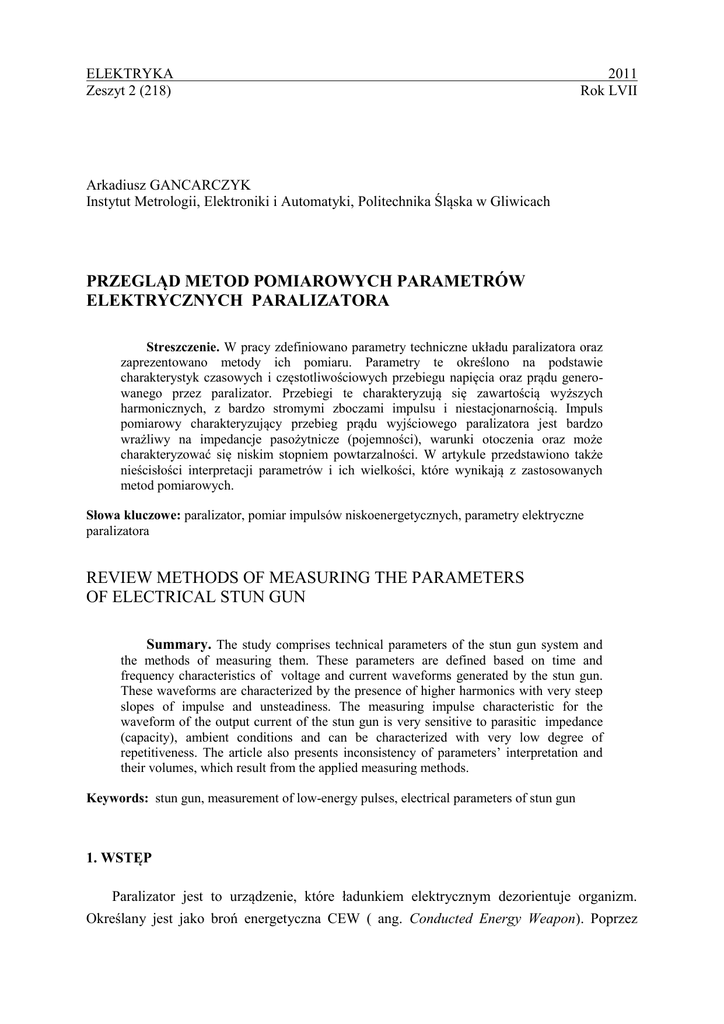 ELEKTRYKA Zeszyt 2 (218) 2011 Rok LVII Arkadiusz GANCARCZYK Instytut Metrologii, Elektroniki i Automatyki, Politechnika Śląska w Gliwicach PRZEGLĄD METOD POMIAROWYCH PARAMETRÓW ELEKTRYCZNYCH PARALIZATORA Streszczenie. W pracy zdefiniowano parametry techniczne układu paralizatora oraz zaprezentowano metody ich pomiaru. Parametry te określono na podstawie charakterystyk czasowych i częstotliwościowych przebiegu napięcia oraz prądu generowanego przez paralizator. Przebiegi te charakteryzują się zawartością wyższych harmonicznych, z bardzo stromymi zboczami impulsu i niestacjonarnością. Impuls pomiarowy charakteryzujący przebieg prądu wyjściowego paralizatora jest bardzo wrażliwy na impedancje pasożytnicze (pojemności), warunki otoczenia oraz może charakteryzować się niskim stopniem powtarzalności. W artykule przedstawiono także nieścisłości interpretacji parametrów i ich wielkości, które wynikają z zastosowanych metod pomiarowych. Słowa kluczowe: paralizator, pomiar impulsów niskoenergetycznych, parametry elektryczne paralizatora REVIEW METHODS OF MEASURING THE PARAMETERS OF ELECTRICAL STUN GUN Summary. The study comprises technical parameters of the stun gun system and the methods of measuring them. These parameters are defined based on time and frequency characteristics of voltage and current waveforms generated by the stun gun. These waveforms are characterized by the presence of higher harmonics with very steep slopes of impulse and unsteadiness. The measuring impulse characteristic for the waveform of the output current of the stun gun is very sensitive to parasitic impedance (capacity), ambient conditions and can be characterized with very low degree of repetitiveness. The article also presents inconsistency of parameters’ interpretation and their volumes, which result from the applied measuring methods. Keywords: stun gun, measurement of low-energy pulses, electrical parameters of stun gun 1. WSTĘP Paralizator jest to urządzenie, które ładunkiem elektrycznym dezorientuje organizm. Określany jest jako broń energetyczna CEW ( ang. Conducted Energy Weapon). Poprzez 92 A. Gancarczyk nagły napływ prądu o niskim natężeniu zakłócane są sygnały nerwowe, w następstwie czego powodowany jest chwilowy paraliż mięśni, czasowo obezwładniając organizm. Samo urządzenie charakteryzuje się szczególnym rodzajem prądu o wysokim napięciu rzędu od 20 kV do 500 kV, ale o bardzo niskim natężeniu. Producenci tych urządzeń twierdzą, że paralizatory nie stanowią zagrożenia dla zdrowych osób. Jednak liczne przypadki dowodzą, że użycie paralizatora może skończyć się także trwałym uszkodzeniem organizmu, co w efekcie może także doprowadzić do śmierci. Tematyka wpływu paralizatora na organizm człowieka nie jest dostatecznie wyjaśniona i wciąż budzi duże kontrowersje. Paralizator, którego prąd wyjściowy nie przekracza średniej wartości natężenia 10 mA, nie jest uznawany za broń według polskiej ustawy o broni i amunicji, a producenci często deklarują, że ta wartość nie jest przez urządzenie przekroczona. Na rynku istnieje wiele niedrogich modeli takich urządzeń, które można nabyć bez zezwolenia, jednak ich rzeczywiste parametry elektryczne są nieznane i nie mogą być łatwo porównane z dopuszczalnymi wymogami. Powstaje przy tym wiele pytań co do bezpieczeństwa użytkowania z punktu widzenia elektrycznego. W związku z tym istnieje potrzeba prowadzenia kontroli i niezależnych testów takich urządzeń, co pociąga za sobą także konieczność weryfikacji uzyskiwanych wyników i metod pomiarowych. 2. BUDOWA PARALIZATORA Rosnąca popularność broni elektrycznej stosowanej nie tylko przez policję, służby porządkowe, ale także przez osoby cywilne sprawiła, że powstało wiele jej rodzajów, jednak niewiele z nich weszło do użytku. Obecnie można na rynku wyróżnić dwa rodzaje takich urządzeń: paralizatory ręczne oraz tasery. Oba rodzaje posiadają elektrody, stanowiące koniec obwodu elektrycznego, który w chwili kontaktu ze skórą lub ubraniem jest zamykany, powodując przepływ prądu o dużej częstotliwości i małym natężeniu. Paralizatory ręczne wymagają bezpośredniego kontaktu z obiektem i mogą generować napięcia, w zależności od modelu, od 80 kV do 900 kV. Natomiast w przypadku tasera elektrody zakończone haczykami są połączone ze źródłem prądu cienkim przewodem i są wystrzeliwane w kierunku napastnika, a maksymalne napięcie generowane na wyjściu sięga wartości 50 kV. Rys. 1. Schemat funkcjonalny budowy paralizatora Fig. 1. Functional block diagram of model stun gun Przegląd metod pomiarowych… 93 Niezależnie od modelu paralizatora w jego budowie można wyróżnić kilka elementów funkcjonalnych konstrukcji obwodu (rys. 1). Pierwszą część konstrukcji stanowi przetwornica napięciowa. Układ oscylatora generuje impulsy, które są podawane na uzwojenie pierwotne transformatora T1 podwyższającego napięcie. Powielacz napięcia składa się najczęściej z układu diod prostowniczych oraz kondensatora wysokonapięciowego, magazynującego energię generowanych impulsów. Kiedy na wyjściu kondensatora napięcie przekroczy progową wartość, poprzez zadziałanie układu wyzwalającego zostaje on rozładowany przez uzwojenie pierwotne transformatora T2, na wyjściu którego napięcie zostaje znacznie podwyższone, do poziomu rzędu kilkudziesięciu kV. Ta część układu jest bardzo istotna, ponieważ decyduje o jakości i parametrach elektrycznych generowanych impulsów. Na wyjściu obwodu paralizator ma dwie pary elektrod. Jedna z nich służy do zamknięcia obwodu podczas kontaktu z obiektem, druga pełni rolę testową, wywołując łuk elektryczny w wyniku jonizacji powietrza bez konieczności zamknięcia obwodu oraz zapewnia, przez odpowiedni dobór odległości miedzy elektrodami, nieprzekroczenie wartości progowej napięcia na wyjściu. 3. S