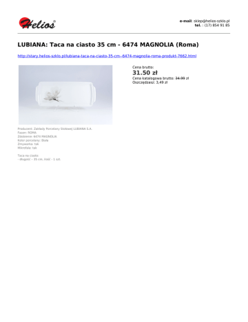 e-mail: [email protected] tel. : (17) 854 91 85 LUBIANA: Taca na ciasto 35 cm - 6474 MAGNOLIA (Roma) http://stary.helios-szklo.pl/lubiana-taca-na-ciasto-35-cm--6474-magnolia-roma-produkt-7662.html Cena brutto: 31.50 zł Cena katalogowa brutto: 34.99 zł Oszczędzasz: 3,49 zł Producent: Zakłady Porcelany Stołowej LUBIANA S.A. Fason: ROMA Zdobienie: 6474 MAGNOLIA Kolor porcelany: Biała Zmywarka: tak Mikrofala: tak Taca na ciasto: - długość – 35 cm, ilość - 1 szt.