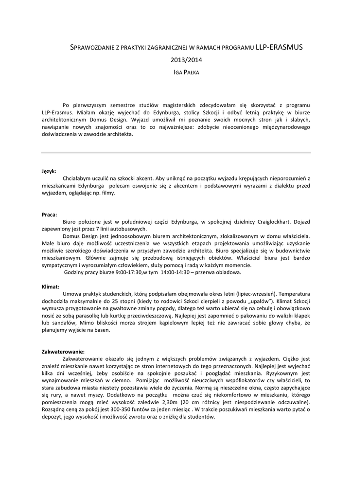 SPRAWOZDANIE Z PRAKTYKI ZAGRANICZNEJ W RAMACH PROGRAMU LLP-ERASMUS 2013/2014 IGA PAŁKA Po pierwszyszym semestrze studiów magisterskich zdecydowałam się skorzystać z programu LLP-Erasmus. Miałam okazję wyjechać do Edynburga, stolicy Szkocji i odbyć letnią praktykę w biurze architektonicznym Domus Design. Wyjazd umożliwił mi poznanie swoich mocnych stron jak i słabych, nawiązanie nowych znajomości oraz to co najważniejsze: zdobycie nieocenionego międzynarodowego doświadczenia w zawodzie architekta. Język: Chciałabym uczulić na szkocki akcent. Aby uniknąć na początku wyjazdu krępujących nieporozumień z mieszkańcami Edynburga polecam oswojenie się z akcentem i podstawowymi wyrazami z dialektu przed wyjazdem, oglądając np. filmy. Praca: Biuro położone jest w południowej części Edynburga, w spokojnej dzielnicy Craiglockhart. Dojazd zapewniony jest przez 7 linii autobusowych. Domus Design jest jednoosobowym biurem architektonicznym, zlokalizowanym w domu właściciela. Małe biuro daje możliwość uczestniczenia we wszystkich etapach projektowania umożliwiając uzyskanie możliwie szerokiego doświadczenia w przyszłym zawodzie architekta. Biuro specjalizuje się w budownictwie mieszkaniowym. Głównie zajmuje się przebudową istniejących obiektów. Właściciel biura jest bardzo sympatycznym i wyrozumiałym człowiekiem, służy pomocą i radą w każdym momencie. Godziny pracy biurze 9:00-17:30,w tym 14:00-14:30 – przerwa obiadowa. Klimat: Umowa praktyk studenckich, którą podpisałam obejmowała okres letni (lipiec-wrzesień). Temperatura dochodziła maksymalnie do 25 stopni (kiedy to rodowici Szkoci cierpieli z powodu „upałów”). Klimat Szkocji wymusza przygotowanie na gwałtowne zmiany pogody, dlatego też warto ubierać się na cebulę i obowiązkowo nosić ze sobą parasolkę lub kurtkę przeciwdeszczową. Najlepiej jest zapomnieć o pakowaniu do walizki klapek lub sandałów, Mimo bliskości morza strojem kąpielowym lepiej też nie zawracać sobie głowy chyba, że planujemy wyjście na basen. Zakwaterowanie: Zakwaterowanie okazało się jednym z większych problemów związanych z wyjazdem. Ciężko jest znaleźć mieszkanie nawet korzystając ze stron internetowych do tego przeznaczonych. Najlepiej jest wyjechać kilka dni wcześniej, żeby osobiście na spokojnie poszukać i pooglądać mieszkania. Ryzykownym jest wynajmowanie mieszkań w ciemno. Pomijając możliwość nieuczciwych współlokatorów czy właścicieli, to stara zabudowa miasta niestety pozostawia wiele do życzenia. Normą są nieszczelne okna, często zapychające się rury, a nawet myszy. Dodatkowo na początku można czuć się niekomfortowo w mieszkaniu, którego pomieszczenia mogą mieć wysokość zaledwie 2,30m (20 cm różnicy jest niespodziewanie odczuwalne). Rozsądną ceną za pokój jest 300-350 funtów za jeden miesiąc . W trakcie poszukiwań mieszkania warto pytać o depozyt, jego wysokość i możliwość zwrotu oraz o zniżkę dla studentów. Wyżywienie: Szkockie supermarkety mają do zaoferowania mnóstwo gotowych dań, które zajmują kilka lodówek i zamrażarek w każdym większym supermarkecie. Co mnie najbardziej zaskoczyło, a wręcz rozśmieszyło to możliwość zakupu ugotowanego ryżu i makaronu, obranych ziemniaków, pokrojonych jabłek i.t.p. Ze względu na to, że gotowe dania nie są ani najzdrowsze ani najsmaczniejsze, lepiej jest gotować samemu. Na początku pobytu w Szkocji większość produktów spożywczych może wydawać się mdła, a jest to spowodowane mniejszą zawartością soli. W tej sytuacji są dwa rozwiązania: z czasem przyzwyczajamy się te tego smaku (co powinno wyjść każdemu na zdrowie), albo trzeba zaopatrzyć się w większe opakowanie soli. Polecam zabrać ze sobą przyprawy, ponieważ w większości sklepów można dostać je w dużych opakowaniach, co po prostu się nie opłaca. Z mięs najtańsza jest wołowina. Osobiście największy problem miałam z pieczywem, które jest tak naszprycowane chemią, że utrzymuje świeżość przez cały tydzień. Najsmaczniejszy chleb znalazłam w Lidlu, i właśnie tam polecam robić zakupy. Gdy ktoś zatęskni za polskim masłem, wędliną lub ogórkami kiszonymi można odwiedzić polskie sklepy lub zajrzeć do większych supermarketów, w których zawsze jest wydzielony kawałek regału na polskie produkty. Na podstawie moich doświadczeń uważam, że £10 tygodniowo powinno wystarczyć na wyżywienie bez specjalnych wyrzeczeń. Komunikacja: Osobiście jestem pod wielkim wrażeniem organizacji komunikacji miejskiej. Na pewno jednym z powodów jest polityka miasta nastawiona na zmniejszenie ruchu samochodów osobowych. Trasy autobusów w mieście układają się we wzór pajęczyny, której centrum stanowi centrum Edynburga. Od poniedziałku do piątku na autobus nie powinno się czekać dłużej niż 10 minut, przez co specjalnie nie trzeba „planować podróży”. Minusem tego układu tras jest czasami utrudniona podróż do dzielnic znajdujących się stosunkowo blisko siebie – co miało miejsce w moim przypadku. Po godzinach: Edynburg jest stolicą kultury i sztuki. To właśnie tutaj ma miejsce największy festiwal: Edinburgh Festival (The Fringe). W jego trakcie można uczestniczyć w dziesiątkach darmowych koncertów, spektakli i wydarzeń. Czymś co mnie zdziwiło i jednocześnie zachwyca do tej pory jest to, że wejścia do większości muzeów i galerii jest bezpłatne. Dlatego też każdy student architektury powinien odwiedzić chociaż National Museum of Scotland, które posiada zarówno wspaniałe eksponaty jak i unikalną architekturę wnętrz. Warto zajrzeć też do National Gallery, National Portrait Gallery i do Gallery of Modern Art. W samym Edynburgu polecam odwiedzić ogród botaniczny, który zachwyca o każdej porze roku, zobaczyć budynek parlamentu oraz wejść na Arthurs Seat aby podziwiać panoramę miasta. W trakcie trwania praktyk wa