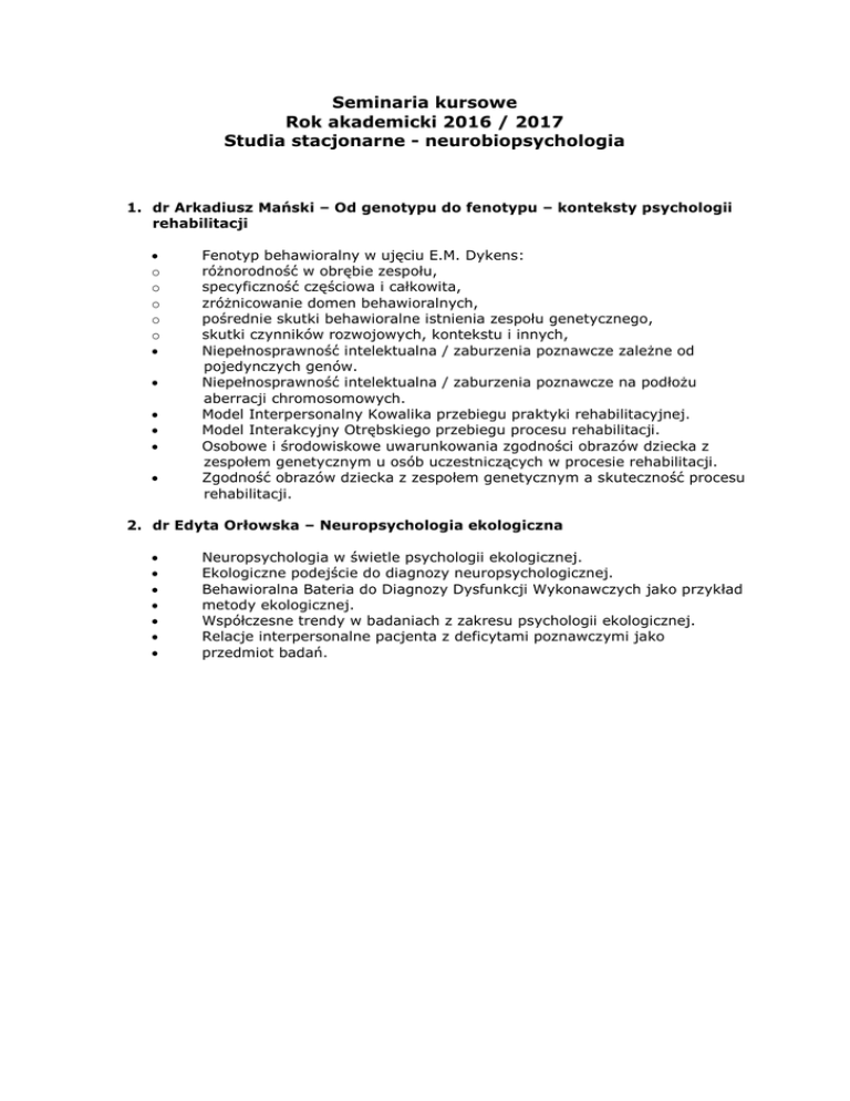 Seminaria kursowe Rok akademicki 2016 / 2017 Studia stacjonarne - neurobiopsychologia 1. dr Arkadiusz Mański – Od genotypu do fenotypu – konteksty psychologii rehabilitacji o o o o o Fenotyp behawioralny w ujęciu E.M. Dykens: różnorodność w obrębie zespołu, specyficzność częściowa i całkowita, zróżnicowanie domen behawioralnych, pośrednie skutki behawioralne istnienia zespołu genetycznego, skutki czynników rozwojowych, kontekstu i innych, Niepełnosprawność intelektualna / zaburzenia poznawcze zależne od pojedynczych genów. Niepełnosprawność intelektualna / zaburzenia poznawcze na podłożu aberracji chromosomowych. Model Interpersonalny Kowalika przebiegu praktyki rehabilitacyjnej. Model Interakcyjny Otrębskiego przebiegu procesu rehabilitacji. Osobowe i środowiskowe uwarunkowania zgodności obrazów dziecka z zespołem genetycznym u osób uczestniczących w procesie rehabilitacji. Zgodność obrazów dziecka z zespołem genetycznym a skuteczność procesu rehabilitacji. 2. dr Edyta Orłowska – Neuropsychologia ekologiczna Neuropsychologia w świetle psychologii ekologicznej. Ekologiczne podejście do diagnozy neuropsychologicznej. Behawioralna Bateria do Diagnozy Dysfunkcji Wykonawczych jako przykład metody ekologicznej. Współczesne trendy w badaniach z zakresu psychologii ekologicznej. Relacje interpersonalne pacjenta z deficytami poznawczymi jako przedmiot badań.