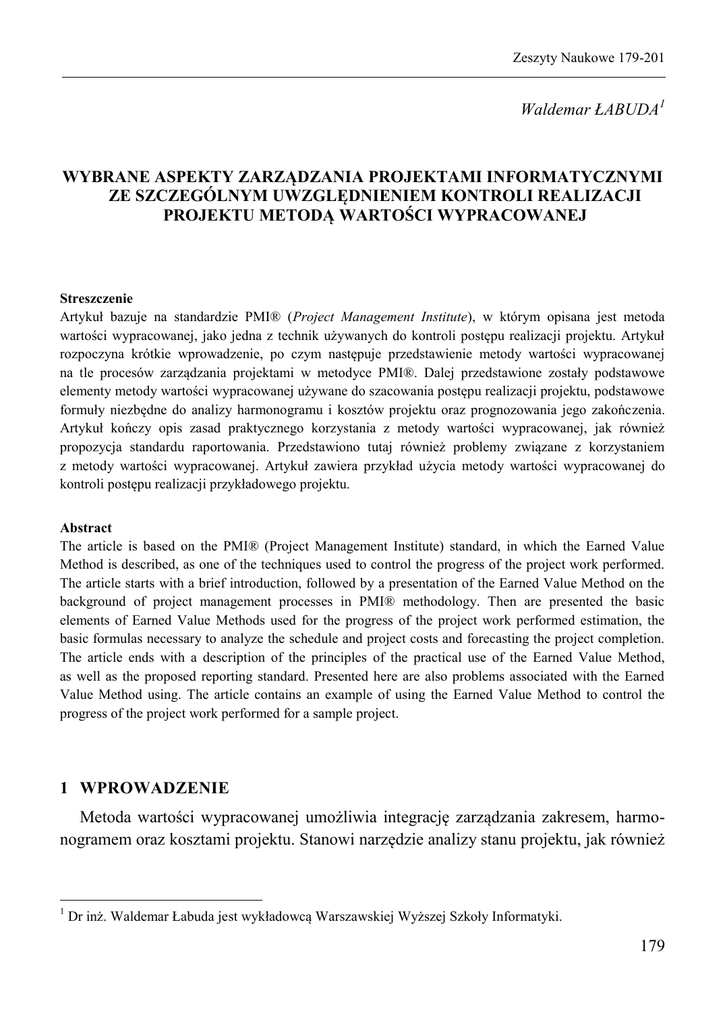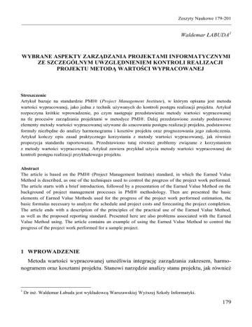 Zeszyty Naukowe 179-201 Waldemar ŁABUDA1 WYBRANE ASPEKTY ZARZĄDZANIA PROJEKTAMI INFORMATYCZNYMI ZE SZCZEGÓLNYM UWZGLĘDNIENIEM KONTROLI REALIZACJI PROJEKTU METODĄ WARTOŚCI WYPRACOWANEJ Streszczenie Artykuł bazuje na standardzie PMI® (Project Management Institute), w którym opisana jest metoda wartości wypracowanej, jako jedna z technik używanych do kontroli postępu realizacji projektu. Artykuł rozpoczyna krótkie wprowadzenie, po czym następuje przedstawienie metody wartości wypracowanej na tle procesów zarządzania projektami w metodyce PMI®. Dalej przedstawione zostały podstawowe elementy metody wartości wypracowanej używane do szacowania postępu realizacji projektu, podstawowe formuły niezbędne do analizy harmonogramu i kosztów projektu oraz prognozowania jego zakończenia. Artykuł kończy opis zasad praktycznego korzystania z metody wartości wypracowanej, jak również propozycja standardu raportowania. Przedstawiono tutaj również problemy związane z korzystaniem z metody wartości wypracowanej. Artykuł zawiera przykład użycia metody wartości wypracowanej do kontroli postępu realizacji przykładowego projektu. Abstract The article is based on the PMI® (Project Management Institute) standard, in which the Earned Value Method is described, as one of the techniques used to control the progress of the project work performed. The article starts with a brief introduction, followed by a presentation of the Earned Value Method on the background of project management processes in PMI® methodology. Then are presented the basic elements of Earned Value Methods used for the progress of the project work performed estimation, the basic formulas necessary to analyze the schedule and project costs and forecasting the project completion. The article ends with a description of the principles of the practical use of the Earned Value Method, as well as the proposed reporting standard. Presented here are also problems associated with the Earned Value Method using. The article contains an example of using the Earned Value Method to control the progress of the project work performed for a sample project. 1 WPROWADZENIE Metoda wartości wypracowanej umożliwia integrację zarządzania zakresem, harmonogramem oraz kosztami projektu. Stanowi narzędzie analizy stanu projektu, jak również 1 Dr inż. Waldemar Łabuda jest wykładowcą Warszawskiej Wyższej Szkoły Informatyki. 179 Waldemar Łabuda pozwala na prognozowanie realizacji projektu w przyszłości. Pozwala na uzyskanie odpowiedzi na kluczowe dla sukcesu projektu pytania, na przykład takie jak: Czy realizacja projektu wyprzedza planowany harmonogram, czy też projekt jest opóźniony? Jak efektywnie zrealizować zadania zaplanowane w harmonogramie projektu? Jak efektywnie zrealizować pozostające do wykonania zadania w harmonogramie projektu? Czy projekt jest realizowany poniżej, czy też powyżej planowanego budżetu? W jaki sposób efektywnie wykorzystać dostępne w projekcie zasoby? Jaki będzie prognozowany koszt realizacji projektu? Kiedy realizacja projektu może być zakończona? Jeśli projekt jest opóźniony i/lub realizowany powyżej zaplanowanego budżetu, kierownik projektu może korzystać z metody wartości wypracowanej dla identyfikacji: Gdzie pojawiają się problemy? Czy są to problemy krytyczne, czy też nie? Jakie działania korekcyjne powinny być podjęte? Przed wprowadzeniem metody wartości wypracowanej kierownicy projektów byli zobowiązani do pomiaru stanu realizowanych przez siebie projektów bazując na diagramie Gantta i analizie ścieżki krytycznej (CPM – Critical Path Method), jak również analizie różnic pomiędzy planowanymi a aktualnymi kosztami (brak korelacji pomiędzy tymi sposobami pomiaru postępów projektu). Podczas, gdy reagowanie na problemy pojawiające się podczas realizacji projektu ma kluczowe znaczenie dla jego sukcesu. Szybka identyfikacja, analiza oraz wybór odpowiednich działań korygujących sprawią, że rosną szanse na realizację projektu na czas i w zaplanowanym budżecie. Metoda wartości wypracowanej (EVM – Earned Value Method) stanowi najbardziej efektywne narzędzie pomiaru realizacji projektu, a tym samym kontroli jego realizacji. Korzystanie z metody wartości wypracowanej umożliwia kierownikom projektów zamknięcie cyklu zarządzania projektem według Deminga PDCA (PDCA - Plan-Do-CheckAct). Warunkiem stosowania metody wartości wypracowanej jest przygotowanie przed zainicjowaniem projektu planu kierowania projektem oraz szczegółowego wartościowania zasobów pracy. Każdy projekt, który posiada strukturalny plan pracy (WBS – Work Breakdown Structure), zdefiniowaną strukturę kosztów i odpowiedni system zbierania danych, może korzystać z metody wartości wypracowanej. Metoda wartości wypracowanej może być przydatna dla projektów charakteryzujących się następującymi cechami: 180 Wybrane aspekty zarządzania projektami informatycznymi… Posiadają jasno zdefiniowany cel i ścieżkę jego osiągnięcia. Pomiary postępu realizacji projektu bazują na planie kierowania projektem, który obejmuje realizację projektu od początku do osiągnięcia celu (projekty badawcze nie mogą być szczegółowo zaplanowane z powodu dużego obszaru niepewności, inne korzystają z pojawiających się okazji np. sprzedaży dla podmiotów zewnętrznych). Bez zdefiniowanego planu niemożliwe jest stosowanie metody wartości wypracowanej. Prace cechują się dużą pracochłonnością i realizowane są przez dłuższy czas. Pomiar postępu realizacji projektu wymaga procesów planowania, monitorowania oraz zbierania i analizy danych. Tygodnie lub miesiące mogą być niezbędne dla uzyskania dokładnych danych. Jeśli czas realizacji projektu jest krótki w porównaniu z cyklem raportowania, wtedy dane do pomiaru postępu realizacji projektu mogą się nie nadawać do bieżącej jego kontroli (mogą posiadać wartość statystyczną i histo