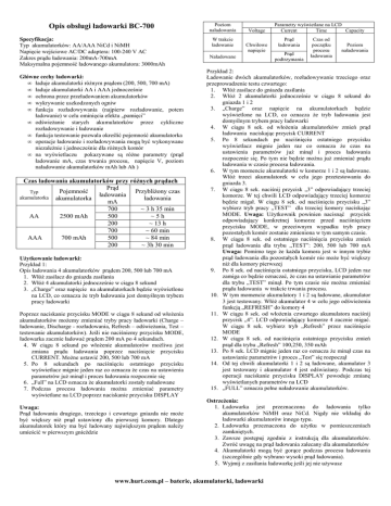 Opis obsługi ładowarki BC-700 Specyfikacja: Typ akumulatorków: AA/AAA NiCd i NiMH Napięcie wejściowe AC/DC adaptera: 100-240 V AC Zakres prądu ładowania: 200mA-700mA Maksymalna pojemność ładowanego akumulatora: 3000mAh Główne cechy ładowarki: • ładuje akumulatorki róŜnym prądem (200, 500, 700 mA) • ładuje akumulatorki AA i AAA jednocześnie • ochrona przez przeładowaniem akumulatorków • wykrywanie uszkodzonych ogniw • funkcja rozładowywania (najpierw rozładowanie, potem ładowanie) w celu ominięcia efektu „pamięci” • odświeŜanie starych akumulatorków przez cykliczne rozładowywanie i ładowanie • funkcja testowanie pozwala określić pojemność akumulatorka • operacje ładowanie i rozładowywania mogą być wykonywane niezaleŜnie i jednocześnie dla róŜnych komór • na wyświetlaczu pokazywane są róŜne parametry (prąd ładowanie mA, czas trwania procesu, napięcie V, poziom naładowanie akumulatorków mAh lub Ah ) Czas ładowania akumulatorków przy róŜnych prądach Prąd Pojemność PrzybliŜony czas Typ akumulatorka akumulatorka ładowania ładowania mA 700 ~ 3 h 35 min AA 2500 mAh 500 ~5h 200 ~ 13 h 700 ~ 60 min AAA 700 mAh 500 ~ 84 min 200 ~ 3h 30 min UŜytkowanie ładowarki: Przykład 1: Opis ładowania 4 akumulatorków prądem 200, 500 lub 700 mA 1. WłóŜ zasilacz do gniazda zasilania 2. WłóŜ 4 akumulatorki jednocześnie w ciągu 8 sekund 3. „Charge” oraz napięcie na akumulatorkach będzie wyświetlone na LCD, co oznacza Ŝe tryb ładowania jest domyślnym trybem pracy ładowarki Poprzez naciskanie przycisku MODE w ciągu 8 sekund od włoŜenia akumulatorków moŜemy zmieniać tryby pracy ładowarki (Charge – ładowanie, Discharge - rozładowania, Refresh – odświeŜania, Test – testowanie akumulatorków). Jeśli nie naciśniemy przycisku MODE, ładowarka zacznie ładować prądem 200 mA po 4 sekundach. 4. W ciągu 8 sekund po włoŜenie akumulatorów moŜliwa jest zmiana prądu ładowania poprzez naciśnięcie przycisku CURRENT. MoŜne ustawić 200, 500 lub 700 mA 5. Po 8 sekundach po naciśnięciu ostatniego przycisku wyświetlacz mignie jeden raz co oznacza Ŝe czas na ustawienia parametrów juŜ minął i proces ładowania rozpocznie się 6. „Full” na LCD oznacza Ŝe akumulatorki zostały naładowane 7. Podczas procesu ładowania moŜna zmieniać parametry wyświetlane na LCD poprzez naciskanie przycisku DISPLAY Uwaga: Prąd ładowania drugiego, trzeciego i czwartego gniazda nie moŜe być większy niŜ prąd ustawiony dla pierwszej komory. Dlatego akumulatorek który ma być ładowany największym prądem naleŜy umieścić w pierwszym gnieździe Poziom naładowania W trakcie ładowanie Voltage Chwilowe napięcie Naładowane Parametry wyświetlane na LCD Current Time Capacity Prąd ładowania Prąd podtrzymania Czas od początku procesu ładowania Poziom naładowania Przykład 2: Ładowanie dwóch akumulatorków, rozładowywanie trzeciego oraz przeprowadzenie testu czwartego: 1. WłóŜ zasilacz do gniazda zasilania 2. WłóŜ 2 akumulatorki jednocześnie w ciągu 8 sekund do gniazda 1 i 2 3. „Charge” oraz napięcie na akumulatorkach będzie wyświetlone na LCD, co oznacza Ŝe tryb ładowania jest domyślnym trybem pracy ładowarki 4. W ciągu 8 sek. od włoŜenia akumulatorków zmień prąd ładowania naciskając przycisk CURRENT 5. Po 8 sekundach po naciśnięciu ostatniego przycisku wyświetlacz mignie jeden raz co oznacza Ŝe czas na ustawienia parametrów juŜ minął i proces ładowania rozpocznie się. Po tym nie będzie moŜna juŜ zmieniać prądu ładowania w czasie procesu ładowania. 6. W tym momencie akumulatorki w komorze 1 i 2 są ładowane. WłóŜ trzeci akumulatorek w celu jego przetestowania do gniazda 3. 7. W ciągu 8 sek. naciśnij przycisk „3” odpowiadający trzeciej komorze. W tej chwili LCD odpowiadający trzeciej komorze będzie migał. W ciągu 8 sek. od naciśnięcia przycisku „3” wybierz tryb pracy „TEST” dla trzeciej komory naciskając MODE. Uwaga: UŜytkownik powinien nacisnąć przycisk odpowiadający konkretnej komorze przed naciśnięciem przycisku MODE, w przeciwnym wypadku tryb pracy pozostałych komór zostanie zmieniona w tym samym czasie. 8. W ciągu 8 sek. od ostatniego naciśnięcia przycisku zmień prąd ładowania dla trybu „TEST”: 200, 500 lub 700 mA Uwaga: Pomimo tego Ŝe kaŜda komora jest w innym trybie prąd ładowania dla pozostałych komór nie moŜe być większy niŜ dla komory pierwszej 9. Po 8 sek. od naciśnięcia ostatniego przycisku, LCD jeden raz zamiga co będzie oznaczać, Ŝe czas na ustawianie parametrów dla trybu „TEST” minął. Po tym czasie nie moŜna zmieniać prądu ładowania w trakcie trwania procesu. 10. W tym momencie akumulatory 1 i 2 są ładowane, akumulator 3 jest testowany. WłóŜ akumulator 4 w celu jego odświeŜenia funkcją „REFRESH” do komory 4 11. W ciągu 8 sek. od włoŜenia czwartego akumulatora naciśnij przycisk „4”. LCD odpowiadający komorze 4 zacznie migać. W ciągu 8 sek. wybierz tryb „Refresh” przez naciśnięcie MODE 12. W ciągu 8 sek. od naciśnięcia ostatniego przycisku zmień prąd dla trybu „Refresh” 100,250, 350 mAh 13. Po 8 sek. LCD mignie jeden raz co oznacza Ŝe minął czas na ustawianie parametrów i proces „Test” się rozpoczął 14. Od tej chwili akumulatorki 1 i 2 są ładowane, akumulator 3 jest testowany i akumulator 4 jest odświeŜany. Podczas tej operacji naciskanie przycisku DISPLAY powoduje zmianę wyświetlanych parametrów na LCD 15. „FULL” oznacza pełne naładowanie akumulatorków. OstrzeŜenia: 1. Ładowarka jest przeznaczona do ładowania tylko akumulatorków NiMH oraz NiCd. Nigdy nie wkładaj do ładowarki akumulatorów innego typu. 2. Ładowarka przeznaczona do uŜytku w pomieszczeniach zamkniętych. 3. Zawsze postępuj zgodnie z instrukcją dla akumulatorków. Zwróć uwagę na prąd ładowania zalecany dla akumulatorków 4. Aku