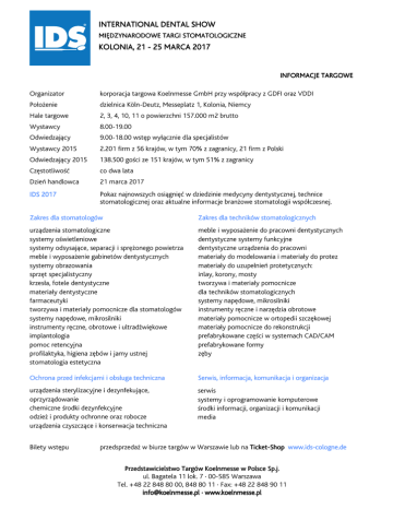 INTERNATIONAL DENTAL SHOW MIĘDZYNARODOWE TARGI STOMATOLOGICZNE KOLONIA, 21 - 25 MARCA 2017 2017 INFORMACJE TARGOWE Organizator korporacja targowa Koelnmesse GmbH przy współpracy z GDFI oraz VDDI Położenie dzielnica Köln-Deutz, Messeplatz 1, Kolonia, Niemcy Hale targowe 2, 3, 4, 10, 11 o powierzchni 157.000 m2 brutto Wystawcy 8.00-19.00 Odwiedzający 9.00-18.00 wstęp wyłącznie dla specjalistów Wystawcy 2015 2.201 firm z 56 krajów, w tym 70% z zagranicy, 21 firm z Polski Odwiedzający 2015 138.500 gości ze 151 krajów, w tym 51% z zagranicy Częstotliwość co dwa lata Dzień handlowca 21 marca 2017 IDS 2017 2017 Pokaz najnowszych osiągnięć w dziedzinie medycyny dentystycznej, technice stomatologicznej oraz aktualne informacje branżowe stomatologii współczesnej. Zakres dla stomatologów Zakres dla techników stomatologicznych urządzenia stomatologiczne systemy oświetleniowe systemy odsysające, separacji i sprężonego powietrza meble i wyposażenie gabinetów dentystycznych systemy obrazowania sprzęt specjalistyczny krzesła, fotele dentystyczne materiały dentystyczne farmaceutyki tworzywa i materiały pomocnicze dla stomatologów systemy napędowe, mikrosilniki instrumenty ręczne, obrotowe i ultradźwiękowe implantologia pomoc retencyjna profilaktyka, higiena zębów i jamy ustnej stomatologia estetyczna meble i wyposażenie do pracowni dentystycznych dentystyczne systemy funkcyjne dentystyczne urządzenia do pracowni materiały do modelowania i materiały do protez materiały do uzupełnień protetycznych: inlay, korony, mosty tworzywa i materiały pomocnicze dla techników stomatologicznych systemy napędowe, mikrosilniki instrumenty ręczne i narzędzia obrotowe materiały pomocnicze w ortopedii szczękowej materiały pomocnicze do rekonstrukcji prefabrykowane części w systemach CAD/CAM prefabrykowane formy zęby Ochrona przed infekcjami i obsługa techniczna Serwis, informacja, komunikacja i organizacja urządzenia sterylizacyjne i dezynfekujące, oprzyrządowanie chemiczne środki dezynfekcyjne odzież i produkty ochronne oraz robocze urządzenia czyszczące i konserwacja techniczna serwis systemy i oprogramowanie komputerowe środki informacji, organizacji i komunikacji media Bilety wstępu przedsprzedaż w biurze targów w Warszawie lub na TicketTicket-Shop Shop www.idswww.ids-cologne.de cologne.de Przedstawicielstwo Targów Koelnmesse w Polsce Sp.j. ul. Bagatela 11 lok. 7 · 00-585 Warszawa Tel. +48 22 848 80 00, 848 80 11 · Fax: +48 22 848 90 11 [email protected] · www.koelnmesse.pl