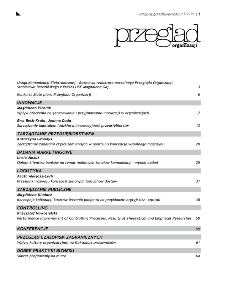PRZEGLĄD ORGANIZACJI 5/2014 |1 Urząd Komunikacji Elektronicznej - Rozmowa redaktora naczelnego Przeglądu Organizacji Stanisława Brzezińskego z Prezes UKE Magdaleną Gaj 3 Konkurs: Złote pióro Przeglądu Organizacji 6 Innowacje Magdalena Pichlak Wpływ otoczenia na generowanie i przyjmowanie innowacji w organizacjach Ewa Beck-Krala, Joanna Duda Zarządzanie kapitałem ludzkim a innowacyjność przedsiębiorstw 7 13 zarządzanie przedsiębiorstwem Katarzyna Grondys Zarządzanie zapasami części zamiennych w oparciu o koncepcję wspólnego magazynu 20 Badania marketingowe Liwia Jasiak Opinie klientów banków na temat mobilnych kanałów komunikacji – wyniki badań 25 Logistyka Agata Mesjasz-Lech Przesłanki rozwoju koncepcji zielonych łańcuchów dostaw 31 zarządzanie publiczne Magdalena Kludacz Koncepcja kalkulacji kosztów leczenia pacjenta na przykładzie brytyjskich szpitali 38 Controlling Krzysztof Nowosielski Performance Improvement of Controlling Processes. Results of Theoretical and Empirical Researches 50 Konferencje 59 PRZEGLĄD CZASOPISM ZAGRANICZNYCH Wpływ kultury organizacyjnej na fluktuację pracowników 61 Dobre praktyki biznesu Sukces profilowany na miarę 64 PRZEGLĄD ORGANIZACJI NR 5/2014 - Summaries / Streszczenia Magdalena Pichlak Politechnika Śląska THE IMPACT OF ENVIRONMENT ON THE INNOVATION GENERATION AND INNOVATION ADOPTION IN ORGANIZATIONS This paper analyses the effects of important environmental conditions (dynamism, complexity, and hostility) on the organizations’ ability and their willingness to generate and adopt innovation. The paper is based on a widely recognized innovation process approach – such approach seeks to describe a broad class of events and sequences central to the innovation process. Secondly, by using the „unitary sequence” model different stages of the generation and adoption processes were identified and characterized. Finally, Delphi Techniques were used to collect in-depth data from 174 experts from Mazovian and Silesian Region. The empirical results obtained confirmed that different environmental conditions play a significant role in stimulating innovation generation as well as innovation adoption in Polish organizations. Innovation adoption is seen as more effective in terms of high complexity and hostility of Polish environment, while innovation generation is more effective when dynamism in this environment tends to increase. Keywords: innovation generation, innovation adoption, process approach, environment WPŁYW OTOCZENIA NA GENEROWANIE I PRZYJMOWANIE INNOWACJI W ORGANIZACJACH W artykule zawarto rozważania dotyczące wpływu głównych wymiarów otoczenia (zmienności, złożoności i wrogości) na zdolność i skłonność współczesnych organizacji do generowania i przyjmowania (adaptacji) innowacji. Punktem wyjścia przedstawionych rozważań była konceptualizacja innowacji w ujęciu procesowym. Przyjmując taką perspektywę metodologiczną i wykorzystując model jednolitej sekwencji, zidentyfikowano oraz scharakteryzowano poszczególne etapy procesu generowania i procesu przyjmowania (adaptacji) innowacji w organizacjach. W dalszej kolejności, w oparciu o zastosowanie metody delfickiej, przeprowadzono badania empiryczne wśród 174 ekspertów z województw mazowieckiego i śląskiego. Wyniki przeprowadzonych badań empirycznych wskazują na fakt, że wszystkie wymiary otoczenia organizacji odgrywają istotną rolę w stymulowaniu procesów generowania i przyjmowania (adaptacji) innowacji w polskich organizacjach. Przyjmowanie (adaptacja) innowacji jest postrzegane jako bardziej efektywne w warunkach rosnącej złożoności i wrogości otoczenia, natomiast generowanie innowacji jest bardziej efektywne w warunkach rosnącej zmienności otoczenia polskich organizacji. Słowa kluczowe: generowanie innowacji, przyjmowanie innowacji, perspektywa procesowa, otoczenie organizacji 1 PRZEGLĄD ORGANIZACJI NR 5/2014 - Summaries / Streszczenia Ewa Beck-Krala, Joanna Duda AGH, Akademia Górniczo-Hutnicza w Krakowie HUMAN CAPITAL MANAGEMENT AND THE INNOVATIVENESS OF ENTERPRISE The aim of this paper is to identify the practices of Human Capital Management that support innovativeness of enterprise. The article consists of a theoretical and empirical part. In the first one, there is a review of the definitions and concepts related to enterprises’ innovativeness. What is more, the relationship between human capital and innovativeness of companies has been explored (new trends). The empirical part of the paper presents the results of research concerning the implementation of the Human Capital Management policies that support employees innovativeness. Such systems are known as the High Involvement Work Practices / Systems (HIWP/S). The authors set the hypothesis that the lack of adequate personnel policy and the use of supportive tools in this field can be a barrier to innovation significantly limiting enterprises. The results of the research confirmed that companies from the SME sector make little use of human capital management tools that may significantly support innovations. Keywords: SME, innovations, innovativeness, HRM, HIWP/S ZARZĄDZANIE KAPITAŁEM LUDZKIM A INNOWACYJNOŚĆ PRZEDSIĘBIORSTW Celem artykułu jest identyfikacja praktyk z zakresu zarządzania kapitałem ludzkim, które wspierają innowacyjność przedsiębiorstw. Artykuł składa się z części literaturowej i empirycznej. W pierwszej z nich dokonano przeglądu definicji i pojęć związanych z innowacyjnością przedsiębiorstw oraz wskazano powiązania pomiędzy obszarem personalnym a wzrostem innowacyjności przedsiębiorstw. Natomiast w części empirycznej zaprezentowano wyniki badań własnych dotyczących realizowania przez przedsiębiorstwa polityki zarządzania kapitałem ludzkim wspierającej innowacyjność pracowników, tzw. High Involvement Work Practicies / Systems (HIWP/S). W artykule postawiono hipotezę, że brak odpowiednich prakt