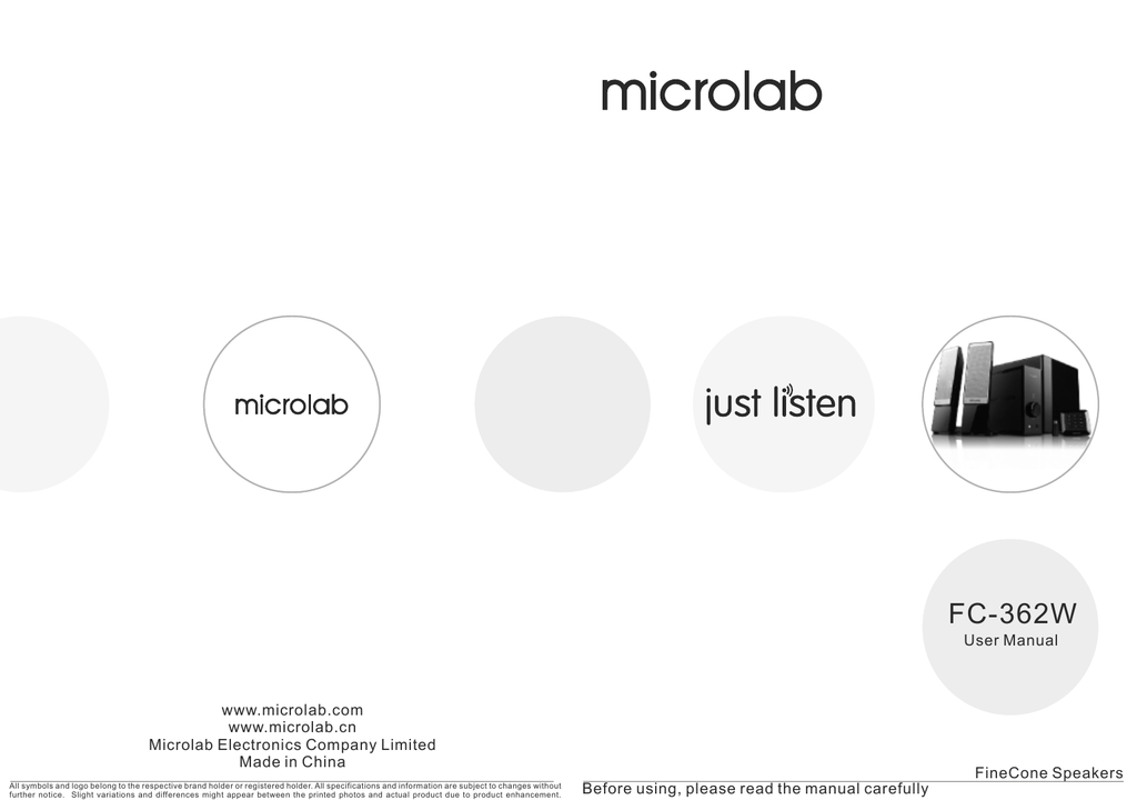 FC-362W User Manual www.microlab.com www.microlab.cn Microlab Electronics Company Limited Made in China All symbols and logo belong to the respective brand holder or registered holder. All specifications and information are subject to changes without further notice. Slight variations and differences might appear between the printed photos and actual product due to product enhancement. FineCone Speakers Before using, please read the manual carefully Important Safety Instructions Caution: English 2 To reduce the risk of electric shock, do not dismantle the product and do not expose the apparatus to rain or moisture. No user-serviceable parts inside. Refer servicing to qualified personnel only. Deutsch 7 Explanation of Graphical Symbols: Русский 11 Polska 14 The lightning flash within an equilateral triangle is intended to alert you to the presence of uninsulated “dangerous voltage” within the product's enclosure that may be of sufficient magnitude to constitute an electric shock to a person or persons. The exclamation point within an equilateral triangle is intended to alert you to the presence of important operating and maintenance (servicing) instructions in the literature accompanying the product. Warnings: 1 1. Read Instructions - All the safety and operating instructions must be read before the product is operated. 2. Retain Instructions - The safety and operating instructions should be kept for future reference. 3. Heed warnings - All warnings on the product and in the operating instructions should be adhered to. 4. Follow instructions - All operating and use instructions should be followed.5. Installation - Install in accordance with the manufacturer's instructions. 6. Power sources - This product should be operated only from the type of power source indicated by the marking adjacent to the power cord entry. If you are not sure of the type of power supply to your home, consult your product dealer or local power company. 7. Grounding or polarization - the product is not required to be grounded. Ensure the plug is fully inserted into the wall outlet or extension cord receptacle to prevent blade or pin exposure. Some versions of the product are equipped with a power cord fitted with a polarized alternating line plug (a plug having one blade wide than the other). This plug will fit onto the power outlet only one way. This is a safety feature. If you are unable to insert the plug fully into the outlet, try reversing the plug. If the plug should still fail to fit, contact your electrician to replace your obsolete outlet. Do not defeat the safety purpose of the polarized plug. When using an extension power-supply cord or a power-supply cord other than that supplied with the appliance, it should be fitted with the appropriate molded plugs and carry safety approval appropriate to the country of use. 8. Power cord protection - Power supply cords should be routed so that they are not likely to be walked on, kinked or pinched by items placed on or against them, paying particular attention to cords from plugs, receptacles and the point where they exit from the appliance. 9. Overloading - Do not overload wall outlets, extension cords or multiple sockets, as this can result in a risk of fire or electric shock. 10. Ventilation - The product must be properly ventilated. Do not place the product on a bed, sofa, or other similar surface. Do not cover the product with any items such as tablecloths, newspapers, etc. 11. Heat - The product should be situated away from heat sources such as radiators, heat registers, stoves, or other products) including amplifiers that produce heat. No naked flame sources, such as lighted candles, should be placed on the apparatus. 12. Water and moisture - To reduce the risk of fire or electric shock, do not expose the product to train, dripping, splashing or excessive moisture such as in a sauna or bathroom. Do not use this product near water - for example, near a bathtub, washbowl, kitchen sink, laundry tub, in a wet basement, or near a swimming pool and the like. 13. Object and Liquid Entry - Never push objects of any kind into this product through openings, as they may touch dangerous voltage points or short-circuit parts that could result in a fire or electric shock. Never spill liquid of any kind on the product. Do not place any object containing liquid on top of the product. 14. Cleaning - Unplug the product from the wall outlet before cleaning. The cabinet of the subwoofer may be cleaned by dusting with a dry cloth. If you wish to use an aerosol cleaning spray, do not spray directly on the cabinet; spray onto the cloth. Be careful not to damage the drive units. EN 2 15. Attachments - Do not use attachments not recommended by the product manufactures, as they may cause hazards. 16. Accessories - Do not place this product on an unstable cart, stand, tripod, bracket or table. The product may fall, causing serious injury to a child or adult, and serious damage to the product. Use only with a cart, stand, tripod, bracket or table recommended by the manufacturer or sold with the product. Any mounting of the product should follow the manufacturer's instructions and should use a mounting accessory recommended by the manufacturer. 17. Moving the product - A product and cart combination should be moved with care. Quick stops, excessive force and uneven surfaces may cause the product and cart combination to overturn. 18. Unused periods - The power cord of the appliance should be unplugged from the outlet during lightning storms or when the apparatus is left unused for a long period of time. 19. Servicing - Do not attempt to service this product yourself, as opening or removing covers may expose you to dangerous voltage or other hazards. Refer all servicing to qualified service personnel. 20. Please remove the power plug form the main power source or wall power source when not in use. When plugged in to a power source, the system is in standby mode, so the power is 
