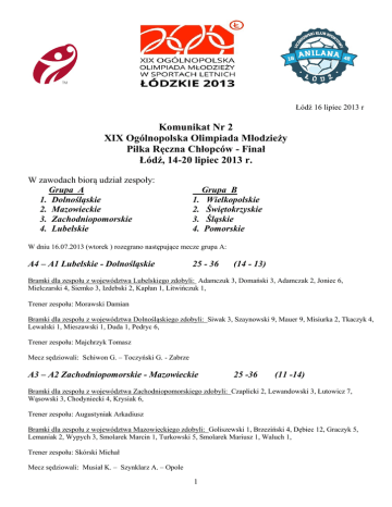 Łódź 16 lipiec 2013 r Komunikat Nr 2 XIX Ogólnopolska Olimpiada Młodzieży Piłka Ręczna Chłopców - Finał Łódź, 14-20 lipiec 2013 r. W zawodach biorą udział zespoły: Grupa A 1. Dolnośląskie 2. Mazowieckie 3. Zachodniopomorskie 4. Lubelskie Grupa B 1. Wielkopolskie 2. Świętokrzyskie 3. Śląskie 4. Pomorskie W dniu 16.07.2013 (wtorek ) rozegrano następujące mecze grupa A: A4 – A1 Lubelskie - Dolnośląskie 25 - 36 (14 - 13) Bramki dla zespołu z województwa Lubelskiego zdobyli: Adamczuk 3, Domański 3, Adamczak 2, Joniec 6, Mielczarski 4, Siemko 3, Izdebski 2, Kapłan 1, Litwińczuk 1, Trener zespołu: Morawski Damian Bramki dla zespołu z województwa Dolnośląskiego zdobyli: Siwak 3, Szaynowski 9, Mauer 9, Misiurka 2, Tkaczyk 4, Lewalski 1, Mieszawski 1, Duda 1, Pedryc 6, Trener zespołu: Majchrzyk Tomasz Mecz sędziowali: Schiwon G. – Toczyński G. - Zabrze A3 – A2 Zachodniopomorskie - Mazowieckie 25 -36 (11 -14) Bramki dla zespołu z województwa Zachodniopomorskiego zdobyli: Czaplicki 2, Lewandowski 3, Łutowicz 7, Wąsowski 3, Chodyniecki 4, Krysiak 6, Trener zespołu: Augustyniak Arkadiusz Bramki dla zespołu z województwa Mazowieckiego zdobyli: Goliszewski 1, Brzeziński 4, Dębiec 12, Graczyk 5, Lemaniak 2, Wypych 3, Smolarek Marcin 1, Turkowski 5, Smolarek Mariusz 1, Waluch 1, Trener zespołu: Skórski Michał Mecz sędziowali: Musiał K. – Szynklarz A. – Opole 1 Tabela grupy A po II dniu zawodów: Lp. 1. 2. 3. 4. Zespół (województwo) Dolnośląskie Mazowieckie Zachodniopomorskie Lubelskie Pkt. 2 4 2 0 Bramki 61 – 54 (+7) 79 – 49 (+30) 54 – 61 (-7) 49 – 79 (-30) Miejsce II I III IV W dniu 16.07.2013 (wtorek) rozegrano następujące mecze grupa B: B4 – B1 Pomorskie - Wielkopolskie 24 - 27 (10 - 14) Bramki dla zespołu z województwa Pomorskiego zdobyli: Łukasiewicz 2, Konkiel 5, Wierzbicki 2, Słowik 4, Dąbrowski 2, Kaniowski 2, Kudełka 2, Piekarski 4, Kwiatkowski 1. Trener zespołu: Mońko Marek Bramki dla zespołu z województwa Wielkopolskiego zdobyli: Marszałek 4, Kołtunowicz 1, Stempniak 1, Polcyn 3, Tyliński 3, Wosicki 4, Gajek 11. Trener zespołu: Hanyż Aldona Mecz sędziowali: Filipiak A. – Filipiak T. - Siemiatycze B3 – B2 Śląskie – Świętokrzyskie 19 - 31 (12 - 15) Bramki dla zespołu z województwa Ślaskiego zdobyli: Czapla 2, Korczyk 1, Krzak 3,Gogola 3, Bąk 1, Cieślik 6, Michalak 1, Popczyk 1, Krzepkowski 1. Trener zespołu: Mikołajek Radosław Bramki dla zespołu z województwa Świetokrzyskiego zdobyli: Grabowski 1, Kaleta 2, Makowski 3, Czechowski 3, Szczepanik 10, Bugaj 1, Śledź 1, Siedlarz 2, Bis 6, Ciołak 1, Cioroch 1. Trener zespołu: Świętoń Janusz Mecz sędziowali: Kaniecki A.– Sarnowski M. - Brodnica Tabela grupy B po II dniu zawodów: Lp. 1. 2. 3. 4. Zespół (województwo) Wielkopolskie Świętokrzyskie Śląskie Pomorskie Pkt. 3 4 1 0 Bramki 57 – 54 (+3) 59 – 41 (+18) 49 – 61 (-12) 46 – 55 (-9) Miejsce II I III IV W dniu 17.07.2013 r. rozegrane zostaną mecze: (A1-A2) Dolnośląskie - Mazowieckie (A3-A4) Zachodniopomorskie - Lubelskie (B1-B2) Wielkopolskie - Świętokrzyskie (B3-B4) Śląskie– Pomorskie godz. 10:00 godz. 11:45 godz. 16:00 godz. 17:45 s.s. Schiwon - Toczyński s.s. Filipiak - Filipiak s.s Musiał - Szynklarz s.s. Kaniecki - Sarnowski Sędzia Główny Turnieju Sławomir Cłapiński 2