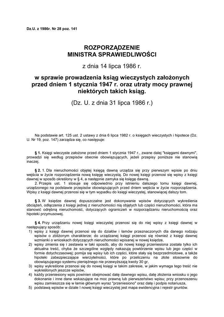 Dz.U. z 1986r. Nr 28 poz. 141 ROZPORZĄDZENIE MINISTRA SPRAWIEDLIWOŚCI z dnia 14 lipca 1986 r. w sprawie prowadzenia ksiąg wieczystych założonych przed dniem 1 stycznia 1947 r. oraz utraty mocy prawnej niektórych takich ksiąg. (Dz. U. z dnia 31 lipca 1986 r.) Na podstawie art. 125 ust. 2 ustawy z dnia 6 lipca 1982 r. o księgach wieczystych i hipotece (Dz. U. Nr 19, poz. 147) zarządza się, co następuje: § 1. Księgi wieczyste założone przed dniem 1 stycznia 1947 r., zwane dalej "księgami dawnymi", prowadzi się według przepisów obecnie obowiązujących, jeżeli przepisy poniższe nie stanowią inaczej. § 2. 1. Dla nieruchomości objętej księgą dawną urządza się przy pierwszym wpisie po dniu wejścia w życie rozporządzenia nową księgę wieczystą. Do nowej księgi przenosi się wpisy z księgi dawnej w sposób określony w § 4, a następnie zamyka się księgę dawną. 2. Przepis ust. 1 stosuje się odpowiednio przy istnieniu dalszego tomu księgi dawnej, urządzonego na podstawie przepisów obowiązujących przed dniem wejścia w życie rozporządzenia. Wpisy z księgi dawnej przenosi się w tym wypadku do księgi wieczystej, stanowiącej dalszy tom. § 3. W księdze dawnej dopuszczalne jest dokonywanie wpisów dotyczących wykreślenia obciążeń, odłączenia z księgi jednej z nieruchomości nią objętych lub części nieruchomości, która ma stanowić odrębną nieruchomość, dotyczących ograniczeń w rozporządzaniu nieruchomością oraz hipoteki przymusowej. § 4. Przy urządzaniu nowej księgi wieczystej przenosi się do niej wpisy z księgi dawnej w następujący sposób: 1) wpisy z księgi dawnej przenosi się do działów i łamów przeznaczonych dla danego rodzaju wpisów o zbliżonym charakterze; do urządzanej księgi przenosi się również z księgi dawnej wzmianki o wnioskach dotyczących nieruchomości wpisanej w nowej księdze, 2) wpisy zmienia się i zestawia w taki sposób, aby do nowej księgi przeniesiona została tylko ich aktualna treść, chyba że szczególne względy nakazują powtórzenie wpisu lub jego części w formie dotychczasowej; pomija się wpisy lub ich części, które stały się bezprzedmiotowe, a także hipoteki zabezpieczające wierzytelności, które po przeliczeniu na złote stosownie do obowiązującego systemu pieniężnego nie przewyższają kwoty 30 gr, 3) wpisy wykreślone przenosi się do nowej księgi w takim zakresie, w jakim wymaga tego treść nie wykreślonych jeszcze wpisów, 4) każdy przeniesiony wpis powinien obejmować datę dawnego wpisu, datę złożenia wniosku o jego dokonanie i inne dane wskazujące na moc prawną lub pierwszeństwo wpisu; przy przenoszeniu wpisu zamieszcza się w łamie głównym wyraz "przeniesiono" oraz datę i podpis notariusza, 5) podstawą wpisów w dziale I nowej księgi wieczystej jest mapa ewidencyjna i rejestr gruntów. § 5. 1. Z dniem 1 stycznia 1989 r. tracą moc prawną i podlegają zamknięciu z urzędu księgi dawne nie zawierające w działach odpowiadających działowi drugiemu, trzeciemu i czwartemu obecnej księgi wieczystej wpisów dokonanych po dniu 31 grudnia 1946 r. 2. Do czasu utraty mocy prawnej ksiąg dawnych, o których mowa w ust. 1, do ksiąg takich stosuje się przepisy § 1-4. 3. Do czasu utraty mocy prawnej ksiąg dawnych, o których mowa w ust. 1, postępowanie w sprawach o odłączenie z takiej księgi jednej z nieruchomości nią objętych lub części nieruchomości mającej stanowić odrębną nieruchomość do nowej księgi wieczystej wolne jest od opłat sądowych, jeżeli wniosek o odłączenie nie jest związany z wnioskiem o dokonanie w urządzanej księdze wieczystej nowych wpisów. § 6. 1. Księgi dawne, które utraciły moc prawną stosownie do § 5 ust. 1, zachowują znaczenie dokumentów. 2. Księgi, o których mowa w ust. 1, stanowią materiały archiwalne i podlegają przekazaniu do właściwych archiwów państwowych. Przekazanie następuje w trybie i na zasadach określonych w przepisach w sprawie szczegółowych zasad porządkowania oraz trybu przekazywania materiałów archiwalnych do archiwów państwowych. Dyrektorzy właściwych archiwów państwowych określają terminy oraz liczbę sukcesywnie przejmowanych ksiąg dawnych. Warunkiem przejęcia ksiąg dawnych jest ich dobry stan fizyczny. § 7. 1. Zakładanie nowych ksiąg wieczystych dla nieruchomości, których księgi wieczyste utraciły moc prawną stosownie do § 5 ust. 1, następuje według przepisów dotyczących zakładania ksiąg wieczystych dla nieruchomości, których księgi zaginęły. 2. Postępowanie w sprawach o założenie księgi wieczystej dla nieruchomości, o której mowa w ust. 1, wolne jest od opłat sądowych. § 8. Tracą moc: 1) rozporządzenie Ministra Sprawiedliwości z dnia 29 listopada 1946 r. o prowadzeniu dotychczasowych ksiąg hipotecznych (gruntowych, wieczystych) po dniu 31 grudnia 1946 r. (Dz. U. Nr 66, poz. 367, z 1947 r. Nr 38, poz. 192 i Nr 48, poz. 251, z 1954 r. Nr 26, poz. 105, z 1961 r. Nr 26, poz. 126 oraz z 1965 r. Nr 50, poz. 311), 2) rozporządzenie Ministra Sprawiedliwości z dnia 28 czerwca 1947 r. w sprawie czasowego zawieszenia niektórych przepisów rozporządzeń Ministra Sprawiedliwości z dnia 29 listopada 1946 r. o prowadzeniu dotychczasowych ksiąg hipotecznych (gruntowych, wieczystych) po dniu 31 grudnia 1946 r. i o urządzeniu i prowadzeniu zbioru dokumentów oraz o postępowaniu w przedmiocie składania dokumentów (Dz. U. z 1947 r. Nr 48, poz. 251). § 9. Rozporządzenie wchodzi w życie z dniem 1 września 1986 r.