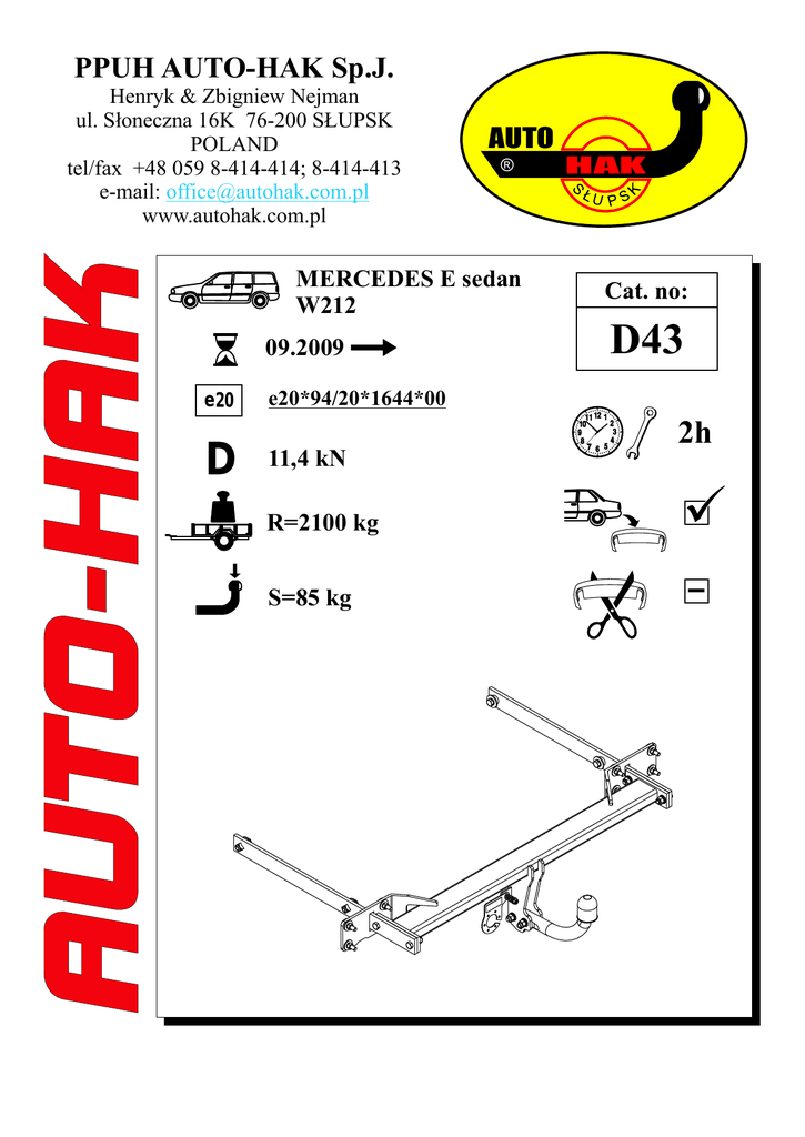 PPUH AUTO-HAK Sp.J. Henryk & Zbigniew Nejman ul. Słoneczna 16K 76-200 SŁUPSK POLAND tel/fax +48 059 8-414-414; 8-414-413 e-mail: [email protected] www.autohak.com.pl AUTO ® HAK MERCEDES E sedan W212 09.2009 e 20 D D43 e20*94/20*1644*00 11,4 kN 2h R=2100 kg S=85 kg - OD PRODUCENTA: PL Dziękujemy za wybór produkowanego przez naszą firmę zaczepu kulowego. Jego niezawodność została potwierdzona licznymi testami oraz opiniami zadowolonych klientów. Jednakże niezawodność zaczepów kulowych jest zależna również od prawidłowego montażu oraz prawidłowej eksploatacji. Z tego powodu prosimy Państwa o staranne przeczytanie niniejszej instrukcji montażu oraz przestrzeganie właściwych wskazówek. Zaczep należy zamontować w miejscach do tego celu przeznaczonych przez producenta samochodu. FROM MANUFACTURER: GB Thank you for buying our product. Their reliability has been confirmed in many tests. Reliability of towbar depends also on correct assembly and right operation. For this reasons we kindly ask to read carefully this instruction and apply to hints. The towbar should be install in points described by a car producer. VON DEM HERSTELLER: D F Die Zuverlässigkeit der Anhängekupplung ist jedoch auch von der ordnungsgemäßen Montage und der richtigen Nutzung abhängig. Daher werden Sie gebeten, sorgfältig die folgende Montageanleitung zu lesen und sich an die entsprechenden Anweisungen zu halten. Die Anhängekupplung muss an den vom Fahrzeughersteller vorgeschriebenen Befestigungsstellen montiert werden. DE LA PART DU FABRICANT: Merci d'avoir choisi le dispositif d'attelage aÌ boule produit par notre societ́e.́ Sa fiabilite´a et́e´confirmeé par de nombreux tests et a travers l'opinion des clients satisfaits. Toutefois, la fiabilite´des dispositifs d'attelage a`boule deṕend également d'une installation et d'une utilisation correcte. Pour cette raison, nous vous demandons de lire attentivement cette instruction de montage et d'en respecter les consignes. Le dispositif d'attelage a`boule doit et^re monte´dans des emplacements prev́us a cet effet par le fabricant de voiture. FRA PRODUCENTEN: DK Tak fordi De har valgt vores anhængertræk. Dets pålidelighed er blevet bekræftet i mange undersøgelser samt af tilfredse kunder. Vores anhængertræks pålidelighed er også afhængig af korrekt montering og korrekt betjening. Af denne grund beder vi Dem at læse denne instruktion grundigt og overholde de korrekte anvisninger. DE PRODUCTOR: E Gracias por la elección del enganche de bola producido por nuestra empresa. Su fiabilidad fue confirmada por numerosos testos y opiniones de los clientes quienes estuvieron contentos. Sin embargo la fiabilidad de enganche de bola depende también de un montaje adecuado y su explotación adecuada. Por esa causa por favor leer atentamente la instrucción del montaje y observar adecuadas indicadoras. VAN DE FABRIKANT: NL Bedankt voor de aanschaf van onze kogeltrekhaak. Hoe betrouwbaar die is blijkt wel uit vele tests en meningen van tevreden klanten. Toch is de betrouwbaarheid van een kogeltrekhaak er mede van afhankelijk dat deze correct gemonteerd is en op de juiste manier wordt gebruikt. Daarom wordt u verzocht deze montagehandleiding zorgvuldig te lezen en de aanwijzingen te volgen. FRA PRODUSENTEN: N Takk for at dere har valgt kulefestet produsert av vårt firma. Driftssikkerheten på kulefestet har blitt bekreftet av flere tester og tilbakemeldinger fra fornøyde kunder. Allikevel er driftssikkerheten også avhengig av en korrekt montering og riktig bruk. Derfor ber vi dere om å lese denne monteringsinstruksen nøye og anbefaler at dere følger veiledningen. ETT BUDSKAP FRÅN TILLVERKAREN: S Vi skulle vilja tacka er för ert val och inköp. Våra dragkrokars pålitlighet har bevisats av olika tester samt referenser från nöjda kunder. Man får inte glömma att dragkrokars pålitlighet beror också på rätt installation och rätt bruk. Därför skulle vi vilja be att ni läser noga denna installationsanvisning och följer alla regler och tips som den anger. Dragkroken ska installeras i ett ställe som blivit påpekade av biltillverkaren. DAL FABBRICANTE: IT -2- Vi ringraziamo per aver scelto il gancio di traino a sfera prodotto dalla nostra azienda. La sua affidabilità è stata confermata da numerosi test e dalle opinioni positive dei clienti. Tuttavia, il perfetto funzionamento dei ganci di traino a sfera dipende anche dalla correttezza del montaggio e dall'utilizzo appropriato. Per questo motivo, Vi preghiamo di leggere attentamente le presenti istruzioni di montaggio e di attenervi alle indicazioni in esse contenute. Il gancio di traino deve essere montato nei punti predisposti a tal fine dal fabbricante del veicolo. PL GB D F A-A DK E NL The clearance specified in appendix VII, diagram 25a/b of Regulation No. 55.01 UN EU must be guaranteed at laden weight of the vehicle. Der Freiraum nach Anhang VII, Abbildung 25a/b der Vorschriften 55.01 EG ist zu gewährleistenbei zulässigem Gesamtgewichtdes Fahrzeuges. L’espace libre doit etre garanti conformément a l’annexe VII, illustration 25a/b de la reglements 55.01 CE pour un poids total en charge autorisé du véhicule. I overensstemmelse med bilag VII, figur 25a/b til forordninger 55.01 EF for køretøjets tilladte totalvægt skal der garanteres en friplads. Hay que garantizar un espacio suelto según archivo adjunto VII, ilustración 25a/b regulaciones 55.01 UN EU de peso admisible y total del vehículo. De in bijlage VII afbeelding 25a/b vanreglement 55.01 UN EU gespecificeerde vrije ruimte moet bij een maximale gewichtsbelasting van het voertuig gegarandeerd zijn. N Det skal sørges for fritt rom ifølge vedlegget VII, illustrasjon 25a/b forskrifter 55.01 UN EU ved den tillatte totale vekten av fartøyet. S Man ska garantera ett fritt tillgängligt utrymme - se bilaga VII, diagram 25a/b enligt föreskrifter 55.01 vid ett fordons maximala belastning. IT B-B Należy zagw