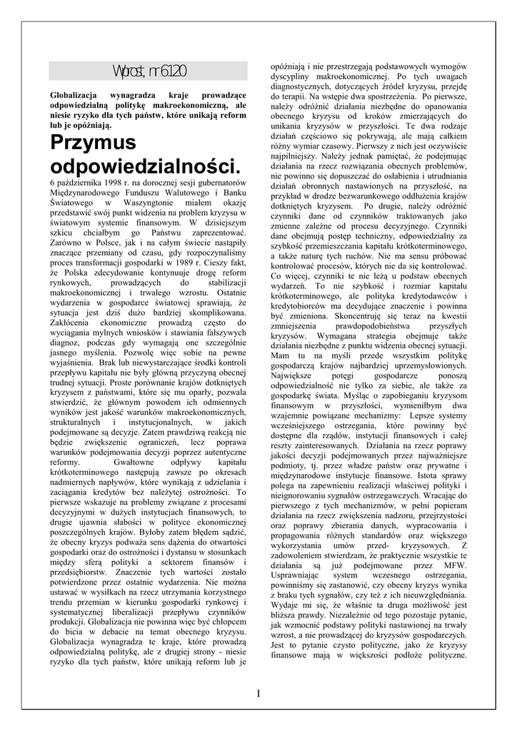 Wprost, nr 6120 opóźniają i nie przestrzegają podstawowych wymogów dyscypliny makroekonomicznej. Po tych uwagach diagnostycznych, dotyczących źródeł kryzysu, przejdę do terapii. Na wstępie dwa spostrzeżenia. Po pierwsze, należy odróżnić działania niezbędne do opanowania obecnego kryzysu od kroków zmierzających do unikania kryzysów w przyszłości. Te dwa rodzaje działań częściowo się pokrywają, ale mają całkiem różny wymiar czasowy. Pierwszy z nich jest oczywiście najpilniejszy. Należy jednak pamiętać, że podejmując działania na rzecz rozwiązania obecnych problemów, nie powinno się dopuszczać do osłabienia i utrudniania działań obronnych nastawionych na przyszłość, na przykład w drodze bezwarunkowego oddłużenia krajów dotkniętych kryzysem. Po drugie, należy odróżnić czynniki dane od czynników traktowanych jako zmienne zależne od procesu decyzyjnego. Czynniki dane obejmują postęp techniczny, odpowiedzialny za szybkość przemieszczania kapitału krótkoterminowego, a także naturę tych ruchów. Nie ma sensu próbować kontrolować procesów, których nie da się kontrolować. Co więcej, czynniki te nie leżą u podstaw obecnych wydarzeń. To nie szybkość i rozmiar kapitału krótkoterminowego, ale polityka kredytodawców i kredytobiorców ma decydujące znaczenie i powinna być zmieniona. Skoncentruję się teraz na kwestii zmniejszenia prawdopodobieństwa przyszłych kryzysów. Wymagana strategia obejmuje także działania niezbędne z punktu widzenia obecnej sytuacji. Mam tu na myśli przede wszystkim politykę gospodarczą krajów najbardziej uprzemysłowionych. Największe potęgi gospodarcze ponoszą odpowiedzialność nie tylko za siebie, ale także za gospodarkę świata. Myśląc o zapobieganiu kryzysom finansowym w przyszłości, wymieniłbym dwa wzajemnie powiązane mechanizmy: Lepsze systemy wcześniejszego ostrzegania, które powinny być dostępne dla rządów, instytucji finansowych i całej reszty zainteresowanych. Działania na rzecz poprawy jakości decyzji podejmowanych przez najważniejsze podmioty, tj. przez władze państw oraz prywatne i międzynarodowe instytucje finansowe. Istota sprawy polega na zapewnieniu realizacji właściwej polityki i nieignorowaniu sygnałów ostrzegawczych. Wracając do pierwszego z tych mechanizmów, w pełni popieram działania na rzecz zwiększenia nadzoru, przejrzystości oraz poprawy zbierania danych, wypracowania i propagowania różnych standardów oraz większego wykorzystania umów przed- kryzysowych. Z zadowoleniem stwierdzam, że praktycznie wszystkie te działania są już podejmowane przez MFW. Usprawniając system wczesnego ostrzegania, powinniśmy się zastanowić, czy obecny kryzys wynika z braku tych sygnałów, czy też z ich nieuwzględniania. Wydaje mi się, że właśnie ta druga możliwość jest bliższa prawdy. Niezależnie od tego pozostaje pytanie, jak wzmocnić podstawy polityki nastawionej na trwały wzrost, a nie prowadzącej do kryzysów gospodarczych. Jest to pytanie czysto polityczne, jako że kryzysy finansowe mają w większości podłoże polityczne. Globalizacja wynagradza kraje prowadzące odpowiedzialną politykę makroekonomiczną, ale niesie ryzyko dla tych państw, które unikają reform lub je opóźniają. Przymus odpowiedzialności. 6 października 1998 r. na dorocznej sesji gubernatorów Międzynarodowego Funduszu Walutowego i Banku Światowego w Waszyngtonie miałem okazję przedstawić swój punkt widzenia na problem kryzysu w światowym systemie finansowym. W dzisiejszym szkicu chciałbym go Państwu zaprezentować. Zarówno w Polsce, jak i na całym świecie nastąpiły znaczące przemiany od czasu, gdy rozpoczynaliśmy proces transformacji gospodarki w 1989 r. Cieszy fakt, że Polska zdecydowanie kontynuuje drogę reform rynkowych, prowadzących do stabilizacji makroekonomicznej i trwałego wzrostu. Ostatnie wydarzenia w gospodarce światowej sprawiają, że sytuacja jest dziś dużo bardziej skomplikowana. Zakłócenia ekonomiczne prowadzą często do wyciągania mylnych wniosków i stawiania fałszywych diagnoz, podczas gdy wymagają one szczególnie jasnego myślenia. Pozwolę więc sobie na pewne wyjaśnienia. Brak lub niewystarczające środki kontroli przepływu kapitału nie były główną przyczyną obecnej trudnej sytuacji. Proste porównanie krajów dotkniętych kryzysem z państwami, które się mu oparły, pozwala stwierdzić, że głównym powodem ich odmiennych wyników jest jakość warunków makroekonomicznych, strukturalnych i instytucjonalnych, w jakich podejmowane są decyzje. Zatem prawdziwą reakcją nie będzie zwiększenie ograniczeń, lecz poprawa warunków podejmowania decyzji poprzez autentyczne reformy. Gwałtowne odpływy kapitału krótkoterminowego następują zawsze po okresach nadmiernych napływów, które wynikają z udzielania i zaciągania kredytów bez należytej ostrożności. To pierwsze wskazuje na problemy związane z procesami decyzyjnymi w dużych instytucjach finansowych, to drugie ujawnia słabości w polityce ekonomicznej poszczególnych krajów. Byłoby zatem błędem sądzić, że obecny kryzys podważa sens dążenia do otwartości gospodarki oraz do ostrożności i dystansu w stosunkach między sferą polityki a sektorem finansów i przedsiębiorstw. Znaczenie tych wartości zostało potwierdzone przez ostatnie wydarzenia. Nie można ustawać w wysiłkach na rzecz utrzymania korzystnego trendu przemian w kierunku gospodarki rynkowej i systematycznej liberalizacji przepływu czynników produkcji. Globalizacja nie powinna więc być chłopcem do bicia w debacie na temat obecnego kryzysu. Globalizacja wynagradza te kraje, które prowadzą odpowiedzialną politykę, ale z drugiej strony - niesie ryzyko dla tych państw, które unikają reform lub je I Ważną lekcją płynącą z obecnego kryzysu jest to, że ukryte powiązania między polityką, instytucjami finansowymi i wielkim