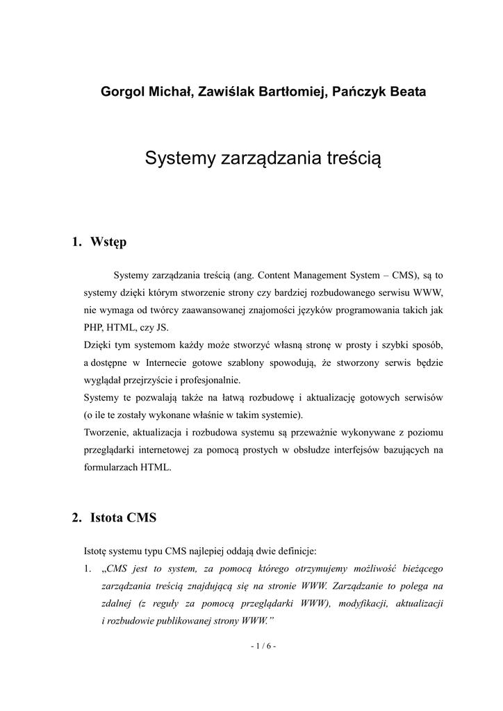 Gorgol Michał, Zawiślak Bartłomiej, Pańczyk Beata Systemy zarządzania treścią 1. Wstęp Systemy zarządzania treścią (ang. Content Management System – CMS), są to systemy dzięki którym stworzenie strony czy bardziej rozbudowanego serwisu WWW, nie wymaga od twórcy zaawansowanej znajomości języków programowania takich jak PHP, HTML, czy JS. Dzięki tym systemom każdy może stworzyć własną stronę w prosty i szybki sposób, a dostępne w Internecie gotowe szablony spowodują, że stworzony serwis będzie wyglądał przejrzyście i profesjonalnie. Systemy te pozwalają także na łatwą rozbudowę i aktualizację gotowych serwisów (o ile te zostały wykonane właśnie w takim systemie). Tworzenie, aktualizacja i rozbudowa systemu są przeważnie wykonywane z poziomu przeglądarki internetowej za pomocą prostych w obsłudze interfejsów bazujących na formularzach HTML. 2. Istota CMS Istotę systemu typu CMS najlepiej oddają dwie definicje: 1. „CMS jest to system, za pomocą którego otrzymujemy możliwość bieżącego zarządzania treścią znajdującą się na stronie WWW. Zarządzanie to polega na zdalnej (z reguły za pomocą przeglądarki WWW), modyfikacji, aktualizacji i rozbudowie publikowanej strony WWW.” -1/6- 2. „CMS jest to aplikacja internetowa lub ich zestaw, pozwalająca na łatwe utworzenie serwisu WWW oraz jego późniejszą aktualizację i rozbudowę przez redakcyjny personel nietechniczny.” System CMS oznacza dokładnie: • Content – treść – mimo iż treść na pierwszy rzut oka kojarzy się tylko z tekstem, to omawiane pojęcie ma głębsze znaczenie. Treścią bowiem są wszystkie materiały jakie mogą zostać zaprezentowane na stronie, a więc oprócz wcześniej wspomnianych tekstów treścią na stronie mogą być także zdjęcia, filmy czy animacje. • Management – zarządzanie – do pojęcia zarządzania można zaliczyć wszystkie typowe czynności jakie związane są z obsługą strony WWW, a więc modyfikacja, aktualizacja czy rozbudowa strony. Dzięki systemom CMS możliwe jest łatwiejsze dodawanie nowych treści na stronie, oraz ich późniejsze katalogowanie, czy wyświetlanie w określonym miejscu. • System – system – systemem może być program, lub grupa programów, które zostały napisane w dynamicznych językach skryptowych (np. PHP), które uruchamiane są po stronie serwera. Programy te (skrypty) zajmują się umieszczeniem nowo wprowadzonych treści w bazie danych, w celu ich późniejszego pobrania i wyświetlenia na stronie. Dzięki korzystaniu z systemów typu CMS tworzenie stron internetowych staje się możliwe również dla osób, które nie posiadają dużego doświadczenia w tworzeniu stron jak i posiadających jedynie podstawową wiedzę na temat języka HTML (ang. HyperText Markup Language). Są to osoby odpowiedzialne za zawartość serwisu ale orientujące się tylko w jego tematyce. Dzięki systemom typu CMS zarządzanie treścią serwisu odbywa się za pomocą zwykłej przeglądarki internetowej. Treści wprowadzane są przy wykorzystaniu formularzy na stronach WWW, z których to wprowadzone dane przenoszone są do bazy danych i jednocześnie uzupełniane zostają odpowiednie miejsca na stronach. Systemy te pozwalają także na zaoszczędzenie czasu jaki potrzebny jest do stworzenia strony (osoby zajmujące się dodawaniem nowych treści do strony nie muszą koncentrować się na projektowaniu stron, lecz na tworzeniu treści). Systemy CMS dzięki swojej budowie umożliwiają oddzielenie treści strony (zawartość informacyjna) od jej wyglądu (sposobu prezentacji), oraz posiadają budowę trójwarstwową. Te warstwy to: • warstwa danych, • warstwa logiki (aplikacji), • warstwa prezentacji. Dane przechowywane są w bazach danych. Aplikacje działające po stronie serwera pobierają je i wypełniają nimi wyznaczone miejsca na stronach. Szablony HTML zawierają informacje o układzie treści na stronach jak i sposobie ich formatowania. Arkusze stylów CSS, znajdujące się w osobnych plikach odpowiedzialne są za wygląd treści wyświetlanych na stronie. Dzięki odseparowaniu treści od formy jej prezentacji umożliwiona jest pełna kontrola nad wyglądem strony, natomiast dzięki wykorzystaniu szablonów możliwa jest zmiana koncepcji graficznej całej strony. W systemach typu CMS zawartość – treść – nie jest związana z żadnym szczególnym formatem prezentacji, dlatego dzięki temu istnieje elastyczność projektowania oraz możliwość przenoszenia zawartość. Elastyczność projektowania – dzięki temu, że systemy CMS zawierają szablony graficzne zmiana wyglądu strony (zmiana kolorystyki, rozmiaru czcionki, rozmiaru strony, itp.) ogranicza się jedynie do zmiany szablonu na inny. Możliwość przenoszenia zawartości – w związku z tym, że większość systemów CMS przechowuje dane w jakiejś bazie (baza tekstowa, MySQL), dane mogą zostać z nich pobrane i wstawione do dowolnego formatu wyjściowego (np. na stronie dostępne są dwie podstrony i obie wyświetlają te same dane, lecz każda z nich korzysta z innych szablonów graficznych). Dzięki wdrożeniu systemu CMS możliwe jest: • uproszczenie procesu publikacji stron, • uzyskanie pełnej kontroli nad wyglądem i treścią strony, • zaoszczędzenie czasu przy procesie rozbudowy strony, • łatwiejsze dodawanie i aktualizowanie informacji na stronie, • uzyskanie możliwości współdzielenia danych w rożnych częściach strony, • łatwiejsza i szybsza możliwość zmiany wyglądu strony, • uzyskanie hierarchicznego dostępu do treści strony (administrator, użytkownik, gość). 3. Typy i rodzaje Systemów Zarządzania Treścią Systemy CMS przeważnie posiadają budowę modułową, dzięki czemu ich podstawowa funkcjonalność może być zwiększana wraz z instalacją dodatkowych modułów. Dostępnych jest kila typów systemów CMS. Związane są one głównie z funkcjami jakie może pełn