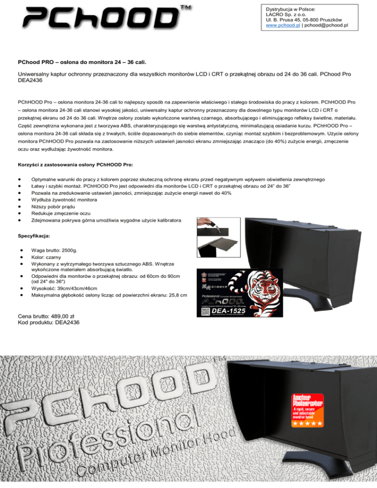 Dystrybucja w Polsce: LACRO Sp. z o.o. Ul. B. Prusa 45, 05-800 Pruszków www.pchood.pl | [email protected] PChood PRO – osłona do monitora 24 – 36 cali. Uniwersalny kaptur ochronny przeznaczony dla wszystkich monitorów LCD i CRT o przekątnej obrazu od 24 do 36 cali. PChood Pro DEA2436 PChHOOD Pro – osłona monitora 24-36 cali to najlepszy sposób na zapewnienie właściwego i stałego środowiska do pracy z kolorem. PChHOOD Pro – osłona monitora 24-36 cali stanowi wysokiej jakości, uniwersalny kaptur ochronny przeznaczony dla dowolnego typu monitorów LCD i CRT o przekątnej ekranu od 24 do 36 cali. Wnętrze osłony zostało wykończone warstwą czarnego, absorbującego i eliminującego refleksy świetlne, materiału. Część zewnętrzna wykonana jest z tworzywa ABS, charakteryzującego się warstwą antystatyczną, minimalizującą osiadanie kurzu. PChHOOD Pro – osłona monitora 24-36 cali składa się z trwałych, ściśle dopasowanych do siebie elementów, czyniąc montaż szybkim i bezproblemowym. Użycie osłony monitora PChHOOD Pro pozwala na zastosowanie niższych ustawień jasności ekranu zmniejszając znacząco (do 40%) zużycie energii, zmęczenie oczu oraz wydłużając żywotność monitora. Korzyści z zastosowania osłony PChHOOD Pro: Optymalne warunki do pracy z kolorem poprzez skuteczną ochronę ekranu przed negatywnym wpływem oświetlenia zewnętrznego Łatwy i szybki montaż. PChHOOD Pro jest odpowiedni dla monitorów LCD i CRT o przekątnej obrazu od 24” do 36” Pozwala na zredukowanie ustawień jasności, zmniejszając zużycie energii nawet do 40% Wydłuża żywotność monitora Niższy pobór prądu Redukuje zmęczenie oczu Zdejmowana pokrywa górna umożliwia wygodne użycie kalibratora Specyfikacja: Waga brutto: 2500g. Kolor: czarny Wykonany z wytrzymałego tworzywa sztucznego ABS. Wnętrze wykończone materiałem absorbującą światło. Odpowiedni dla monitorów o przekątnej obrazu: od 60cm do 90cm (od 24" do 36") Wysokość: 39cm/43cm/46cm Maksymalna głębokość osłony licząc od powierzchni ekranu: 25,8 cm Cena brutto: 489,00 zł Kod produktu: DEA2436