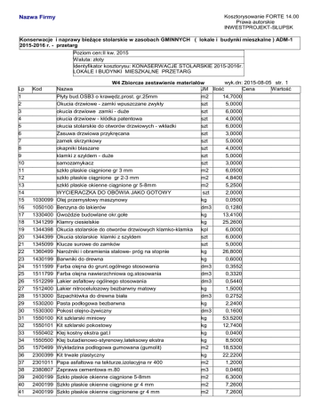 Kosztorysowanie FORTE 14.00 Prawa autorskie INWESTPROJEKT-SŁUPSK Nazwa Firmy Konserwacje i naprawy bieżące stolarskie w zasobach GMINNYCH ( lokale i budynki mieszkalne ) ADM-1 2015-2016 r. - przetarg Poziom cen:II kw. 2015 Waluta: złoty Identyfikator kosztorysu: KONASERWACJE STOLARSKIE 2015-2016r. LOKALE I BUDYNKI MIESZKALNE PRZETARG Lp Kod Nazwa wyk.dn: 2015-08-05 str. 1 W4 Zbiorcze zestawienie materiałów JM Ilość Cena Wartość 1 2 Płyty bud.OSB3 o krawędz.prost. gr.25mm Okucia drzwiowe - zamki wpuszczane zwykły m2 szt 14,7000 5,0000 3 okucia drzwiowe zamki - duże szt 6,0000 4 okucia drzwioew - kłódka patentowa szt 4,0000 5 okucia stolarskie do otworów drzwiowych - wkładki szt 6,0000 6 Zasuwa drzwiowa przykręcana szt 3,0000 7 zamek skrzynkowy szt 5,0000 8 okapniki blaszane szt 4,0000 9 klamki z szyldem - duże szt 5,0000 10 samozamykacz szt 3,0000 11 szkło płaskie ciągnione gr 3 mm m2 6,0500 12 szkło płaskie ciągnione gr 2-3 mm m2 4,8400 13 szkłó płaskie okienne ciągnione gr 5-8mm m2 5,2500 14 WYCIERACZKA DO OBÓWIA JAKO GOTOWY szt 2,0000 15 1030099 Olej przemysłowy maszynowy kg 0,0500 16 1050100 Benzyna do lakierów dm3 0,1280 17 1330400 Gwoździe budowlane okr.gołe kg 13,4100 18 1341299 Klamry ciesielskie kg 25,2600 19 1344398 Okucia stolarskie do otworów drzwiowych klamko-klamka kpl 6,0000 20 1344399 Okucia stolarskie klamki z szyldem szt 6,0000 21 1345099 Klucze surowe do zamków szt 5,0000 22 1360499 Narożniki i obramienia stalowe- próg na stopnie kg 26,8000 23 1430199 Barwniki do drewna kg 0,6000 24 1511599 Farba olejna do grunt.ogólnego stosowania dm3 0,3552 25 1511799 Farba olejna nawierzchniowa og.stosowania dm3 0,3320 26 1512299 Lakier asfaltowy ogólnego stosowania dm3 0,5440 27 1512400 Lakier nitrocelulozowy bezbarwny matowy kg 1,5000 28 1513000 Szpachlówka do drewna biała dm3 0,2752 29 1530200 Pasta podłogowa bezbarwna kg 2,2400 30 1530300 Pokost olejno-żywiczny dm3 0,1600 31 1550100 Kit szklarski miniowy kg 53,5200 32 1550101 Kit szklarski pokostowy kg 12,7400 33 1550402 Klej kostny ekstra gat.I kg 0,0400 34 1550500 Klej butadienowo-styrenowy,lateksowy ekstra kg 8,5000 35 1570499 Wykładzina podłogowa gumowana (gumolit) m2 18,5300 36 2300399 Kit trwale plastyczny kg 22,2200 37 2301011 Papa asfaltowa na tekturze,izolacyjna nr 400 m2 1,2000 38 2380807 Zaprawa cementowa m.80 m3 0,0460 39 2400199 Szkło płaskie okienne ciągnione 5-8mm m2 6,3000 40 2400199 Szkło płaskie okienne ciągnione gr 4 mm m2 7,2600 41 2400199 Szkło płaskie okienne ciągnionene gr 4 mm m2 7,2600 wyk.dn: 2015-08-05 str. 2 W4 Zbiorcze zestawienie materiałów Lp Kod 42 2400899 Szkło płaskie walc.wzorzyste m2 11,9500 43 2400999 Szkło płaskie walcowane zbrojone 5-8mm m2 8,2600 44 2600107 Bale iglaste obrzynane gr.50mm kl.III m3 0,0892 45 2600205 Bale iglaste obrzynane wymiarowe kl.III m3 0,0600 46 2600633 Deski iglaste obrzynane gr.28-45mm kl.III m3 0,0360 47 2600638 Deski iglaste obrzynane gr.25mm kl.III m3 0,0630 48 2610803 Łaty z drewna dębowego dł.pow.1m m3 0,0966 49 2620202 Bale igl.1-str.strug.2.5-6.5 kl.II m3 0,2300 50 2620607 Deski iglaste 2-str.strug.dł.2.5-6.5m gr.28-45mm kl.I m3 0,0040 51 2620608 Deski iglaste 2-str.strug.gr.19-25mm kl.II m3 0,0600 52 2631199 Listwy przyścienne z drewna iglastego m 10,8000 53 2631899 Tarcica podłogowa strugana iglasta m3 0,2800 54 2640102 Bale igl.obrzynane wymiarowe nasyc.gr.50mm kl.II m3 0,1860 55 2640808 Deski igl.1-str strug.i prof.wym.nasyc.gr.19-25mm kl.II m3 0,2900 56 2641804 Krawędziaki igl.wymiarowe nasyc.kl.I m3 0,1900 57 2644599 Listwy przyścienne z drewna iglastego 40x25 mm m 23,0000 58 2762100 Opaski -listwy przymykowe 16x40 mm m 4,4000 59 2762702 Tralki balustrad toczone szt 5,0000 60 2780799 Pochwyty (poręcze) schodowe z drewna igl. m 15,7500 61 3920012 Papier ścierny w ark.(NSHa) elektr.220-120,100 (po 100szt) opk 0,5800 62 3920099 Papier ścierny ark 5,7280 63 3950098 Drewno na stemple budowlane okrągłe m3 0,3606 64 6804213 Śruby mont.zgr.z łbem 6-kąt.z gw.na cz.dł.trzp.z nakr.i podkł.M16x180 kg 19,6200 65 Nazwa Materiały pomocnicze Razem kosztorys JM Ilość Cena Wartość