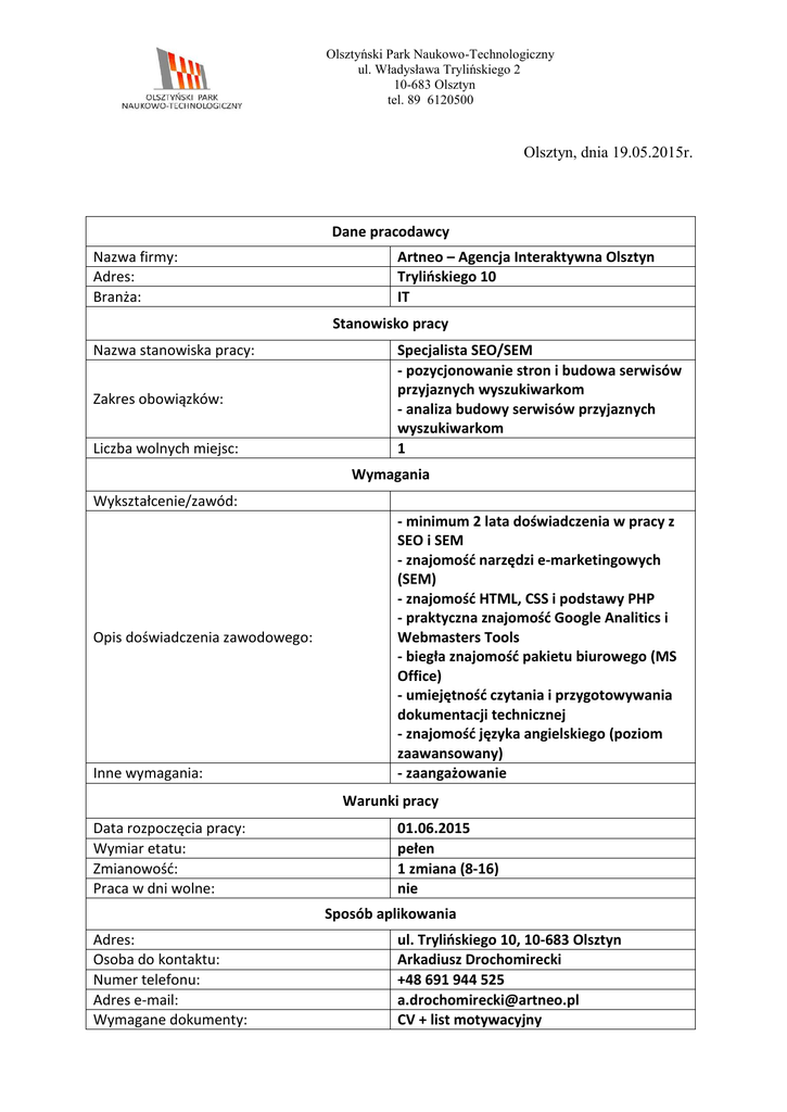 Olsztyński Park Naukowo-Technologiczny ul. Władysława Trylińskiego 2 10-683 Olsztyn tel. 89 6120500 Olsztyn, dnia 19.05.2015r. Dane pracodawcy Nazwa firmy: Adres: Branża: Artneo – Agencja Interaktywna Olsztyn Trylińskiego 10 IT Stanowisko pracy Nazwa stanowiska pracy: Zakres obowiązków: Liczba wolnych miejsc: Specjalista SEO/SEM - pozycjonowanie stron i budowa serwisów przyjaznych wyszukiwarkom - analiza budowy serwisów przyjaznych wyszukiwarkom 1 Wymagania Wykształcenie/zawód: Opis doświadczenia zawodowego: Inne wymagania: - minimum 2 lata doświadczenia w pracy z SEO i SEM - znajomość narzędzi e-marketingowych (SEM) - znajomość HTML, CSS i podstawy PHP - praktyczna znajomość Google Analitics i Webmasters Tools - biegła znajomość pakietu biurowego (MS Office) - umiejętność czytania i przygotowywania dokumentacji technicznej - znajomość języka angielskiego (poziom zaawansowany) - zaangażowanie Warunki pracy Data rozpoczęcia pracy: Wymiar etatu: Zmianowość: Praca w dni wolne: 01.06.2015 pełen 1 zmiana (8-16) nie Sposób aplikowania Adres: Osoba do kontaktu: Numer telefonu: Adres e-mail: Wymagane dokumenty: ul. Trylińskiego 10, 10-683 Olsztyn Arkadiusz Drochomirecki +48 691 944 525 [email protected] CV + list motywacyjny Olsztyński Park Naukowo-Technologiczny ul. Władysława Trylińskiego 2 10-683 Olsztyn tel. 89 6120500 Wyrażam zgodę na umieszczenie powyższych danych na stronie internetowej Olsztyńskiego Parku Naukowo – Technologicznego oraz ponoszę pełną odpowiedzialność za ich treść. Arkadiusz Drochomirecki (Podpis)