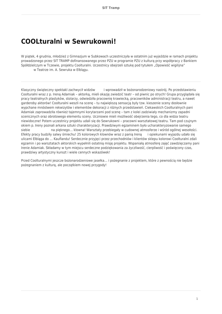 SIT Tramp COOLturalni w Sewrukowni! W piątek, 4 grudnia, młodzież z Gimnazjum w Subkowach uczestniczyła w ostatnim już wyjeździe w ramach projektu prowadzonego przez SIT TRAMP dofinansowanego przez PZU w programie PZU z kulturą przy współpracy z Bankiem Spółdzielczym w Tczewie, projektu Coolturalni. Uczestnicy obejrzeli sztukę pod tytułem „Opowieść wigilijna” w Teatrze im. A. Sewruka w Elblągu. Klasyczny świąteczny spektakl zachwycił widzów i wprowadził w bożonarodzeniowy nastrój. Po przedstawieniu Coolturalni wraz z p. Ireną Adamiak – aktorką, mieli okazję zwiedzić teatr – od piwnic po strych! Grupa przyglądała się pracy teatralnych plastyków, stolarzy, odwiedziła pracownię krawiecką, pracowników administracji teatru, a nawet garderoby aktorów! Coolturalni weszli na scenę – tu największą sensacją były tzw. kieszenie sceny dosłownie wypchane mnóstwem rekwizytów i elementów dekoracji z różnych przedstawień. Ciekawskich Coolturalnych pani Adamiak zaprowadziła również tajemnymi korytarzami pod scenę – tam z kolei zadziwiały mechanizmy zapadni scenicznych oraz obrotowego elementu sceny. Uczniowie mieli możliwość obejrzenia tego, co dla widza teatru niewidoczne! Potem uczestnicy projektu udali się do Sewrukowni – pracowni warsztatowej teatru. Tam pod czujnym okiem p. Ireny poznali arkana sztuki charakteryzacji. Prawdziwym egzaminem było ucharakteryzowanie samego siebie na pięknego… klowna! Warsztaty przebiegały w cudownej atmosferze i wśród ogólnej wesołości. Efekty pracy budziły salwy śmiechu! 25 kolorowych klownów wraz z panią Ireną i opiekunami wyjazdu udało się ulicami Elbląga do … Kauflandu! Serdecznie przyjęci przez przechodniów i klientów sklepu kolorowi Coolturalni zdali egzamin i po warsztatach aktorskich wypełnili ostatnią misję projektu. Wspaniałą atmosferę zajęć zawdzięczamy pani Irenie Adamiak. Składamy w tym miejscu serdeczne podziękowania za życzliwość, cierpliwość i poświęcony czas, prawdziwy artystyczny kunszt i wiele cennych wskazówek! Przed Coolturalnymi jeszcze bożonarodzeniowe jasełka… i pożegnanie z projektem, które z pewnością nie będzie pożegnaniem z kulturą, ale początkiem nowej przygody! 1